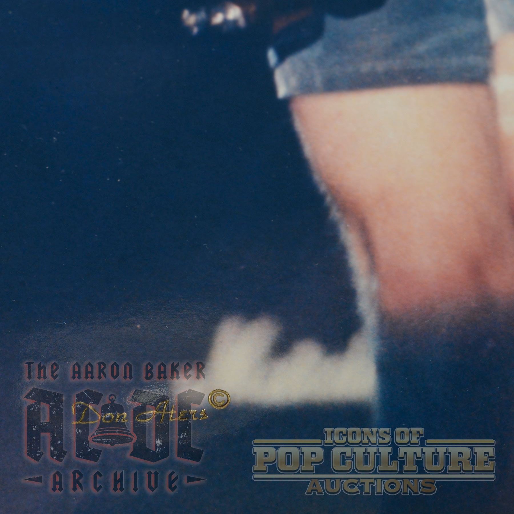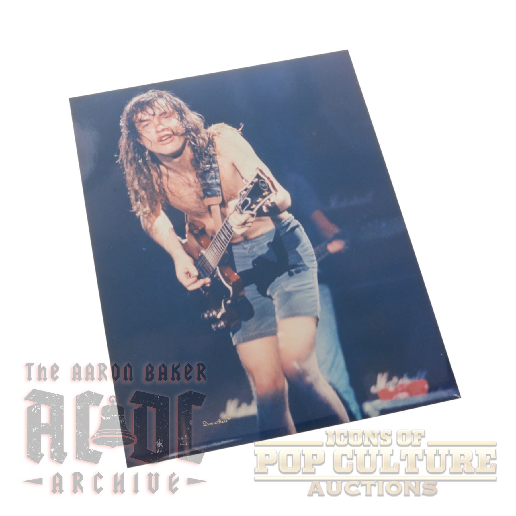 An 11" x 14" color photographic print by acclaimed rock photographer Don Aters, capturing AC/DC’s Angus Young mid-performance in his trademark schoolboy shorts. With sweat-drenched hair flying and a fierce expression, Angus attacks his Gibson SG under the hot stage lights, embodying the unrelenting energy that has made him one of rock’s most electrifying performers. The image is embossed with Don Aters’ distinctive trademark, adding authenticity and collectible value to this striking piece of AC/DC live concert history.