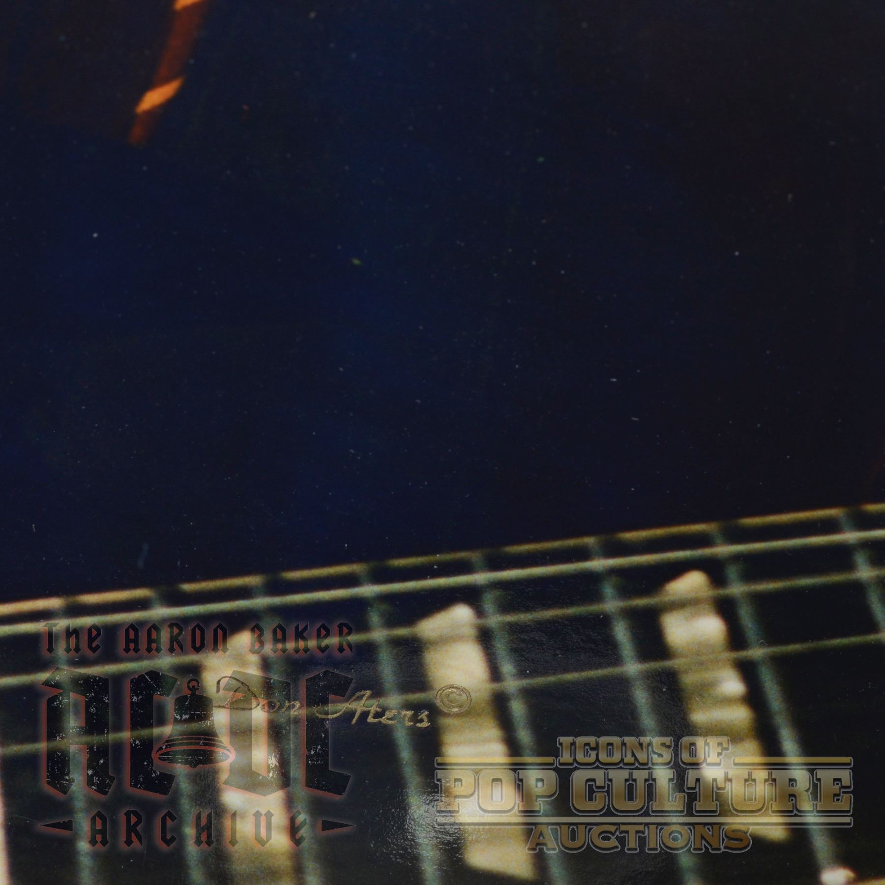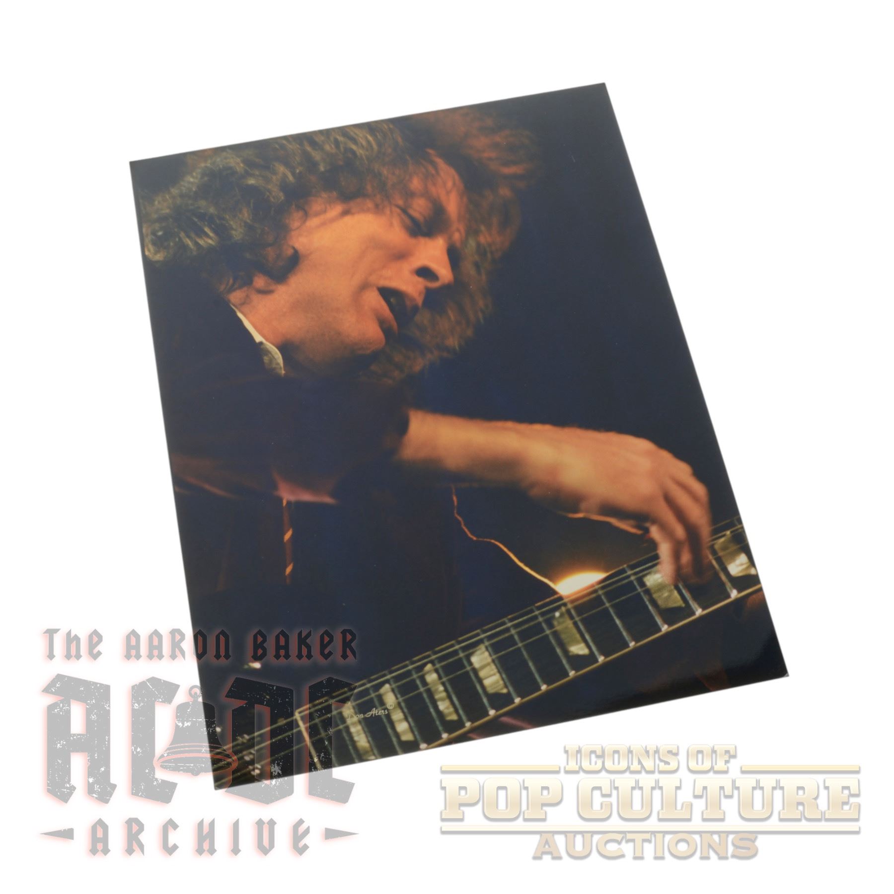 An 11" x 14" color photographic print by renowned rock photographer Don Aters, capturing a dramatic close-up of AC/DC’s Angus Young in the heat of performance. Focused intently on his Gibson SG, Angus’ expression and posture radiate the intensity and passion that have made him a rock icon. The tight framing and vivid stage lighting draw you into the moment, showcasing the raw energy of an AC/DC concert. The print is embossed with Don Aters’ trademark, adding both authenticity and collectible value.