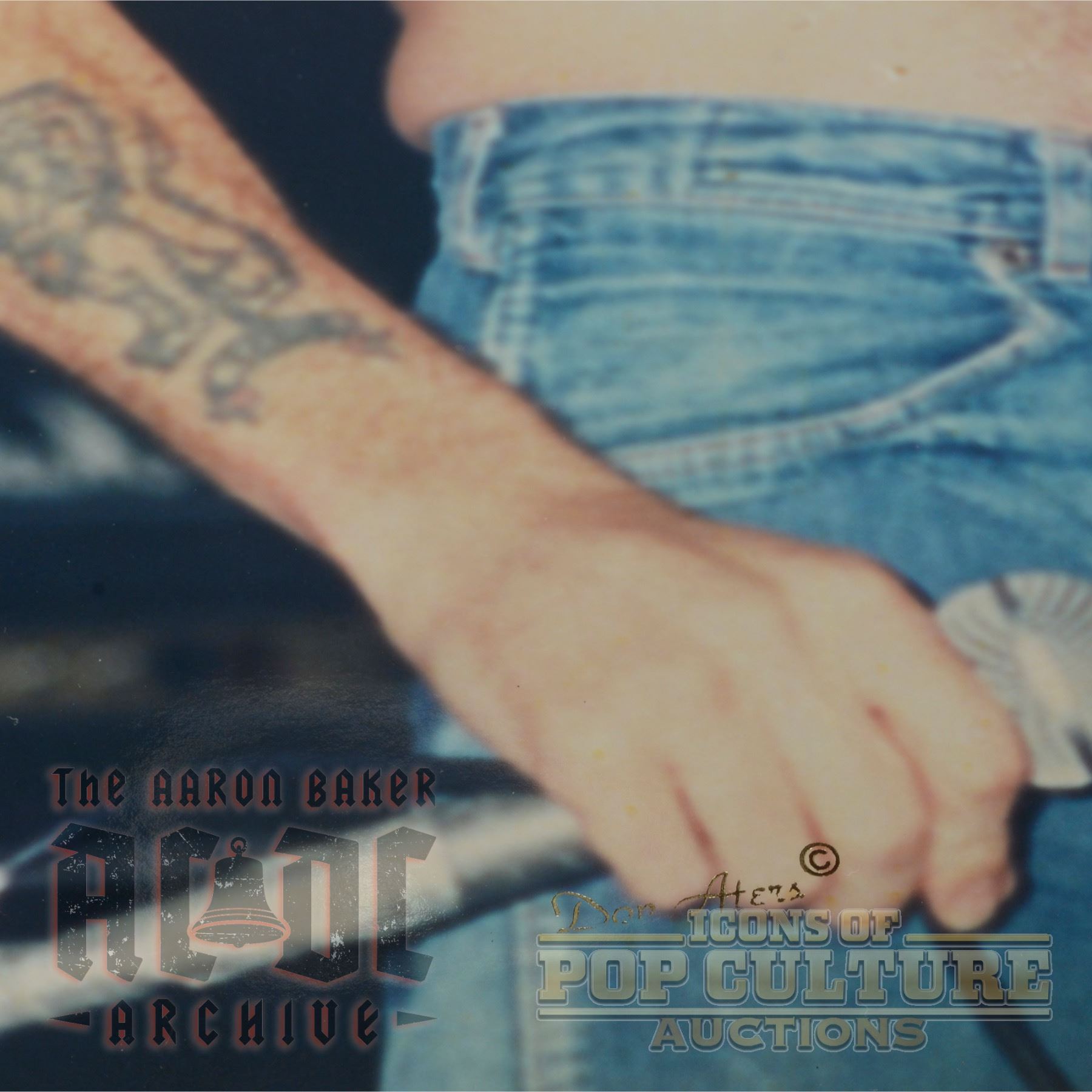 An 11" x 14" color photographic print by acclaimed rock photographer Don Aters, capturing AC/DC frontman Bon Scott in his element. Shirtless, smiling, and gripping the microphone mid-performance, Bon’s tattoos and confident posture radiate the charisma and raw rock ‘n’ roll energy that made him an icon. Vividly lit and sharply detailed, the image is embossed with Don Aters’ trademark, adding authenticity and making it a prized collectible from AC/DC’s legendary Bon Scott era.