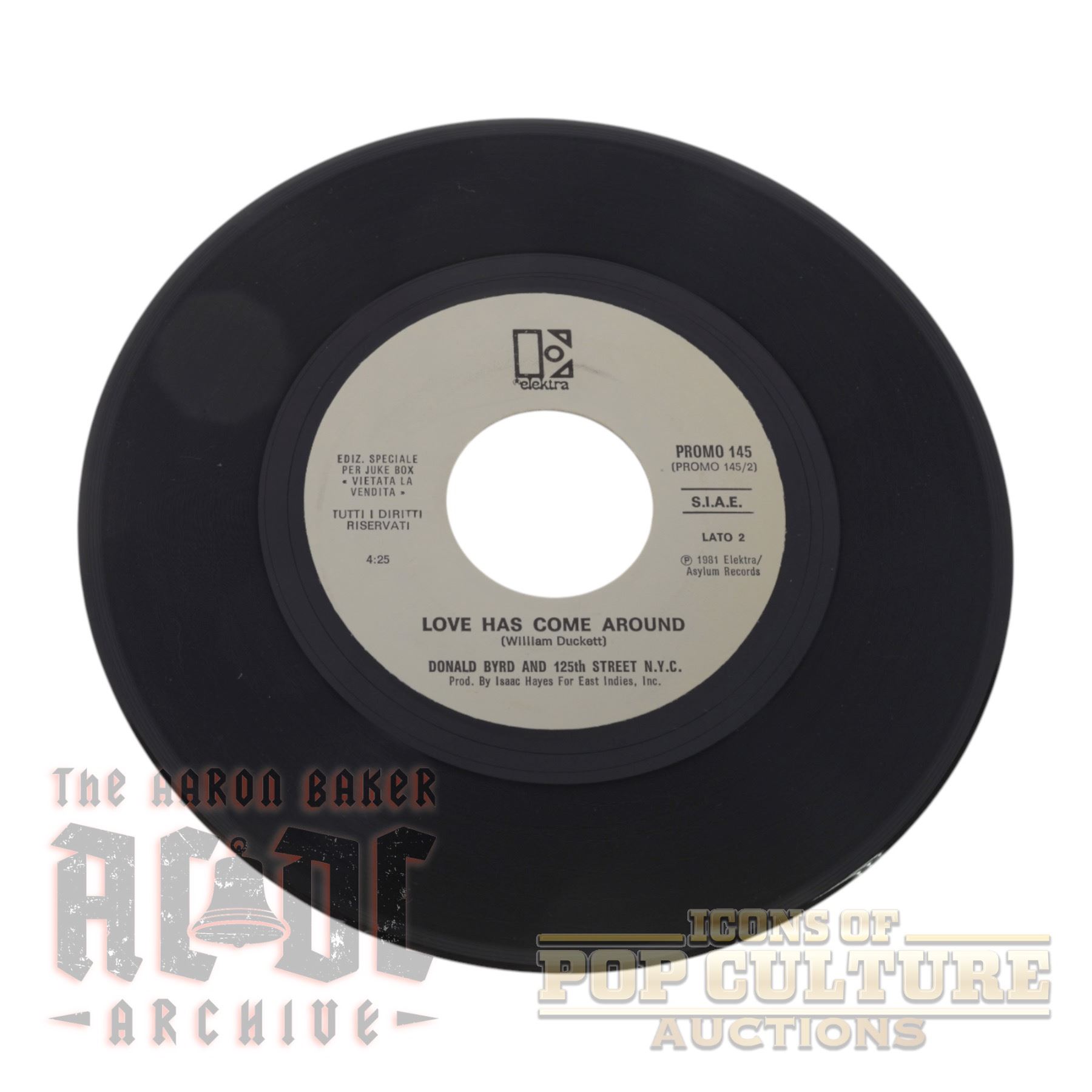 This is a rare Italian promotional-only 7-inch single issued in 1981. One side features AC/DC’s “Evil Walks,” written by Angus Young, Malcolm Young, and Brian Johnson, and produced by Robert John “Mutt” Lange. The track is taken from the band’s 1981 album For Those About to Rock (We Salute You), which became AC/DC’s first album to reach No. 1 on the U.S. Billboard 200 chart. The reverse side features Donald Byrd and 125th Street, N.Y.C. with the track “Love Has Come Around,” produced by Isaac Hayes. The record is clearly marked “Ediz. Speciale Per Juke Box – Vietata La Vendita” (“Special Edition for Jukebox – Not for Sale”), indicating it was manufactured in Italy exclusively for jukebox distribution and was never made available commercially. This unique pairing of artists reflects Atlantic and Elektra’s promotional practices of the era and makes the single a distinctive and collectible item within the AC/DC vinyl catalog.