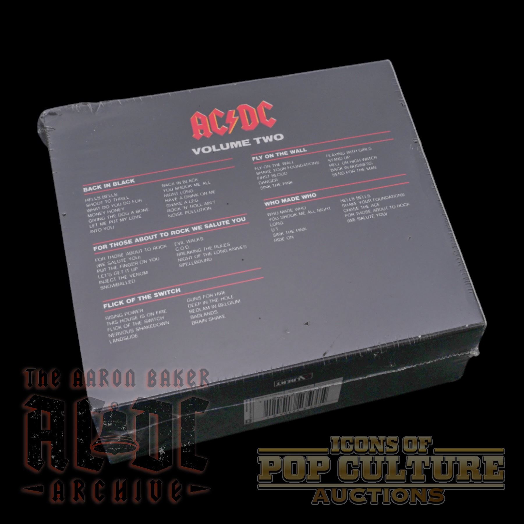 This factory-sealed AC/DC Collector’s CD box set, titled Volume Two, includes five classic albums spanning the band’s prime years. Featured is Back in Black (1980), one of the best-selling albums in rock history, and For Those About to Rock (We Salute You) (1981), known for its cannon-blasting title track. Also included are Flick of the Switch (1983), a raw and stripped-back release, Fly on the Wall (1985), featuring “Shake Your Foundations,” and Who Made Who (1986), the soundtrack album for Stephen King’s film Maximum Overdrive. This collector’s edition brings together landmark AC/DC recordings in one unified set, offering a comprehensive addition to any fan’s collection.