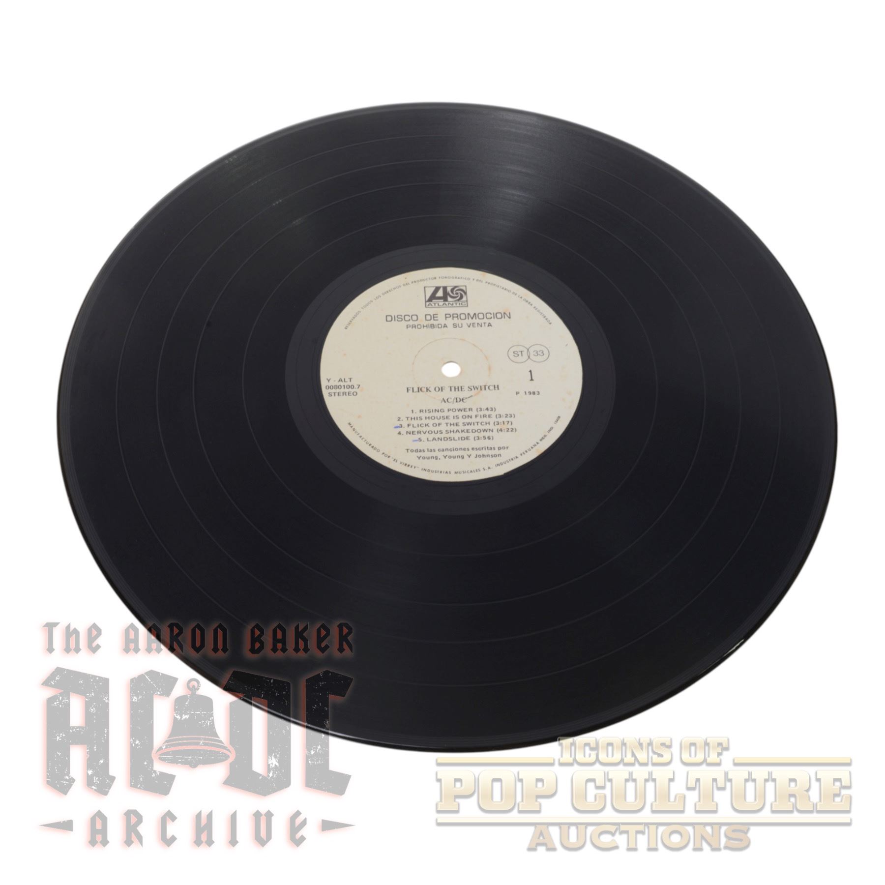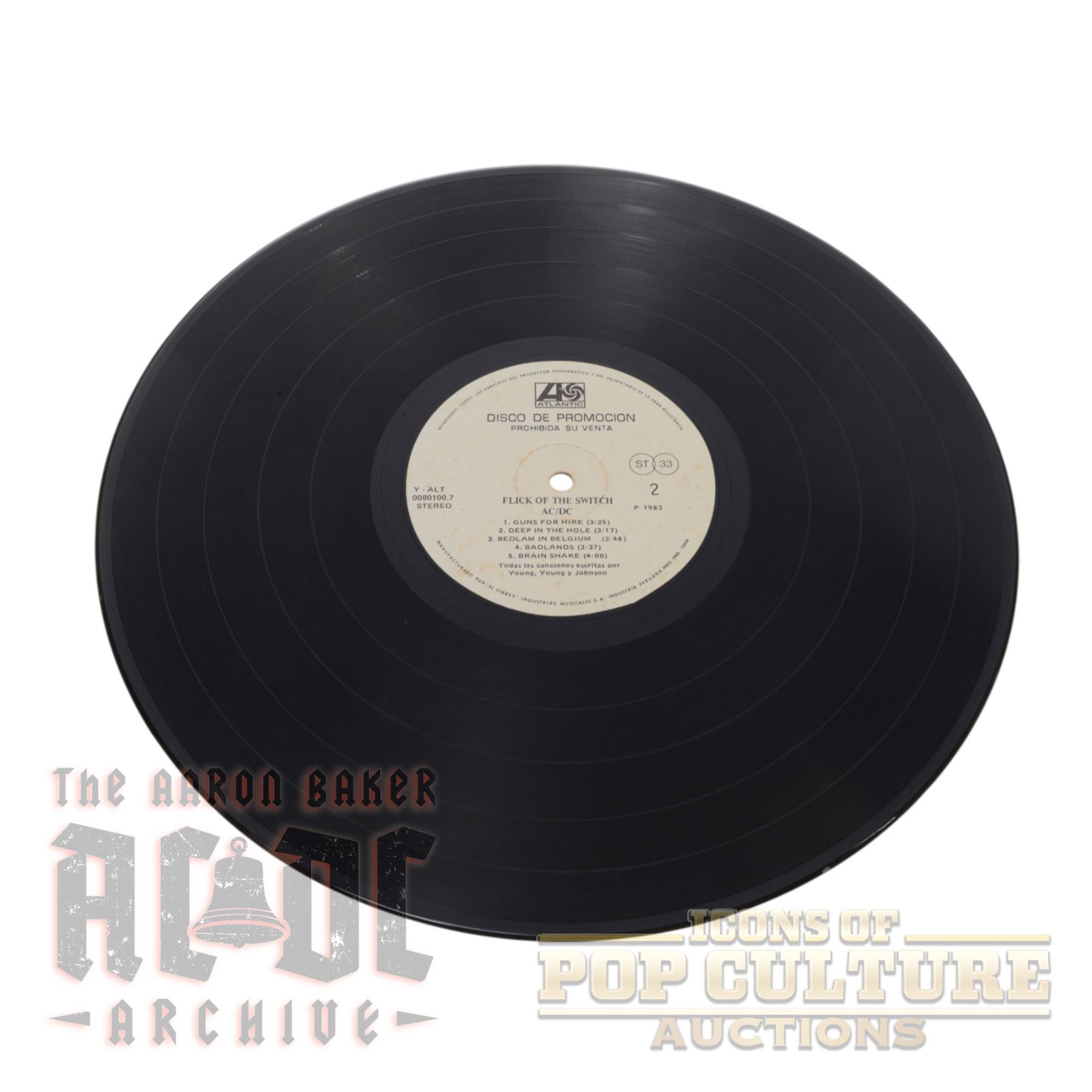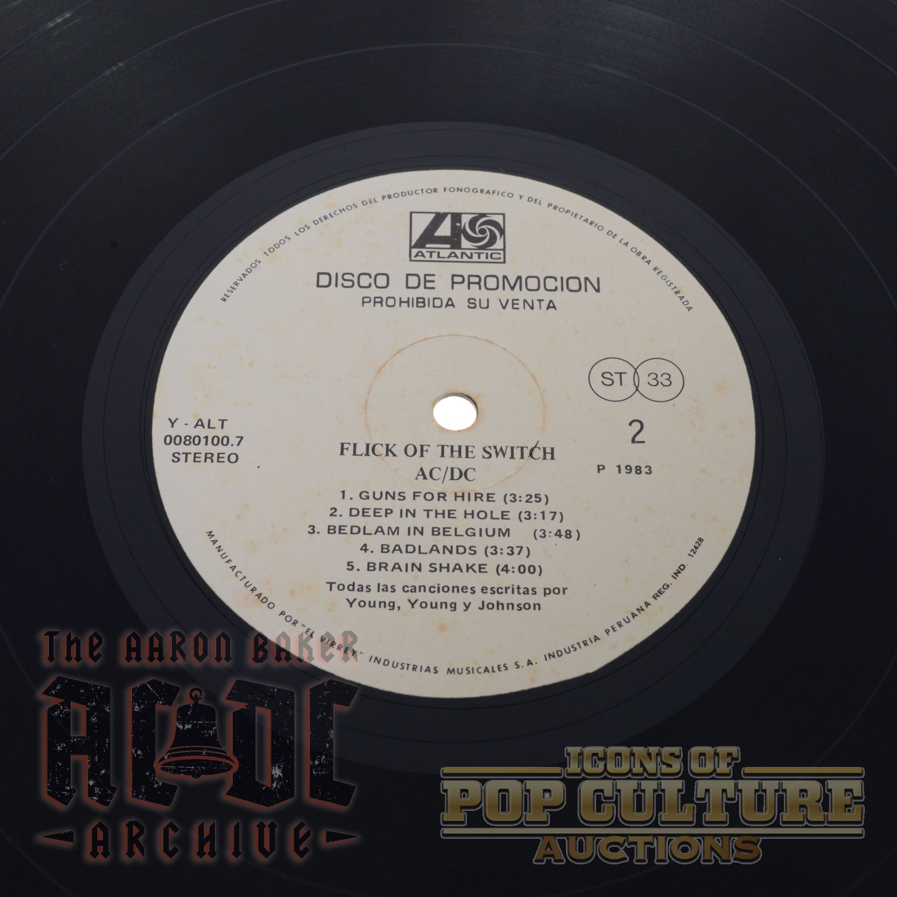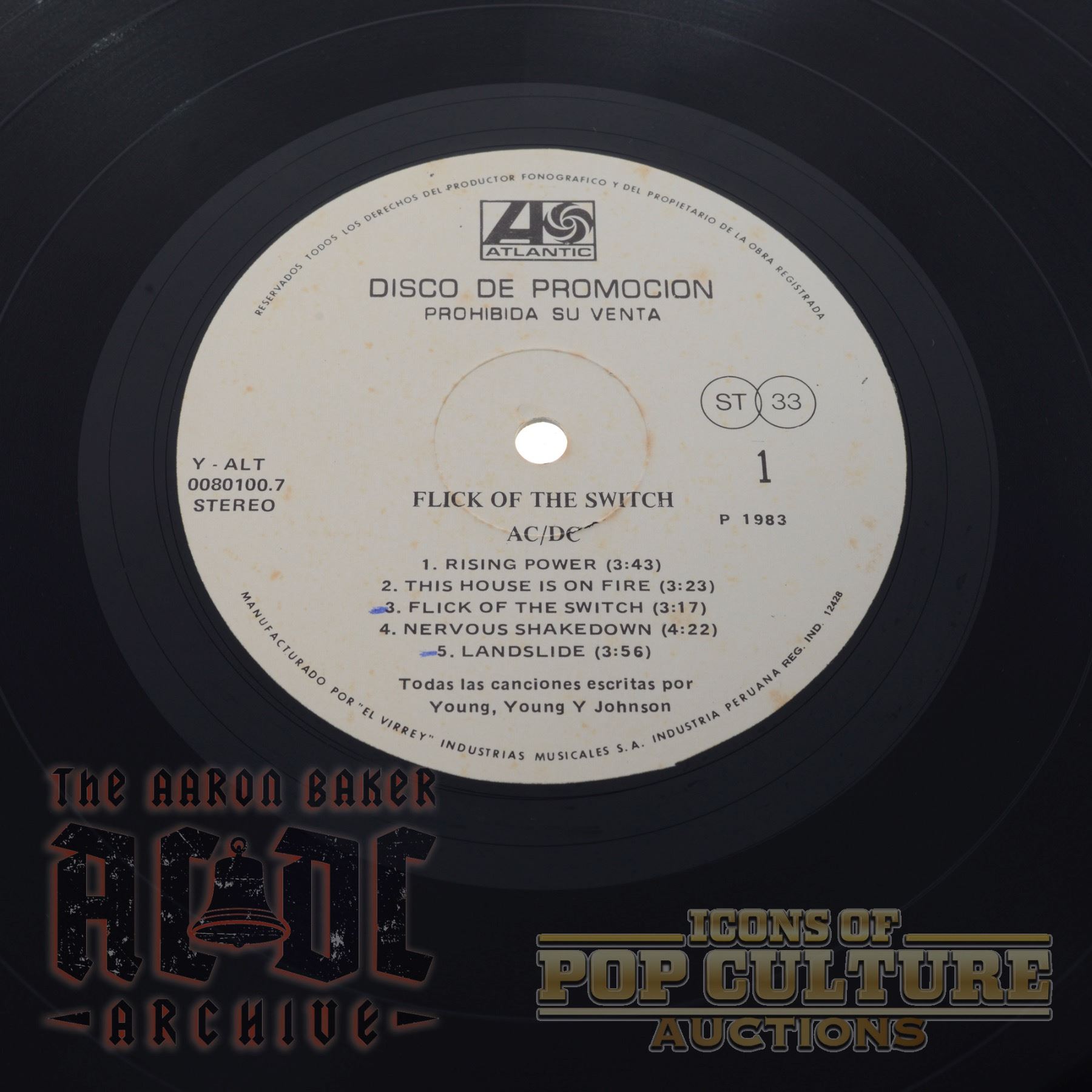 This is an ultra-rare 1983 promotional LP pressing of Flick of the Switch by AC/DC, released in Peru through Atlantic Records and manufactured by Industrias Musicales S.A. "El Virrey." Bearing the catalog number Y-ALT 0080100.7, this Spanish-language label variation was intended strictly for promotional use, as confirmed by the bold statement "DISCO DE PROMOCIÓN – PROHIBIDA SU VENTA" (“Promotional Record – Not for Sale”) printed on both sides of the labels.