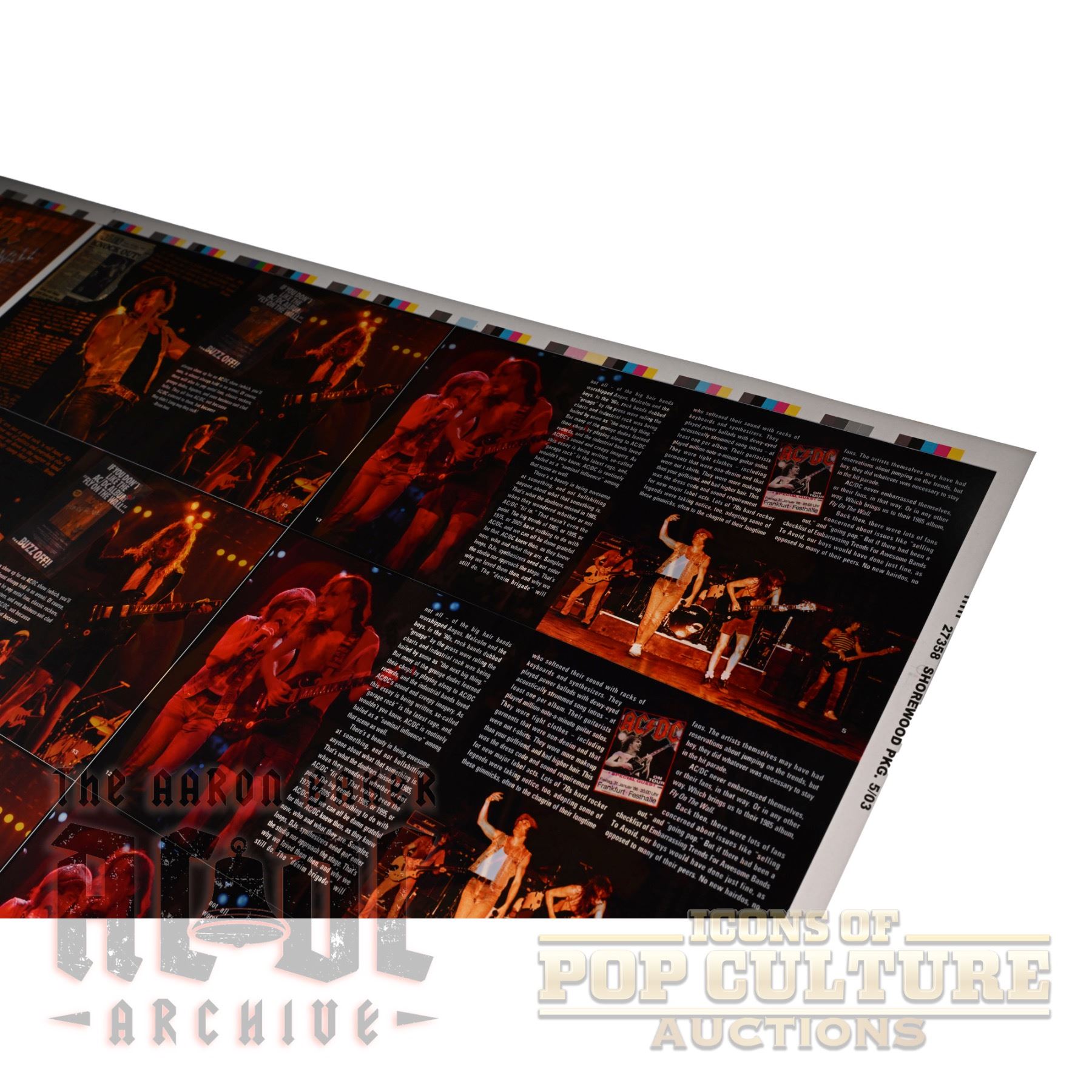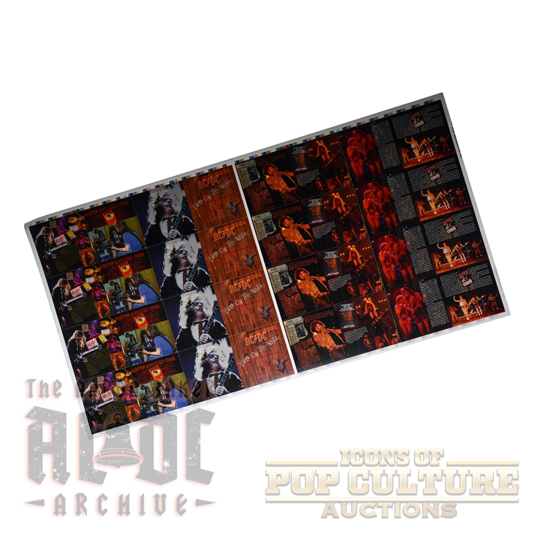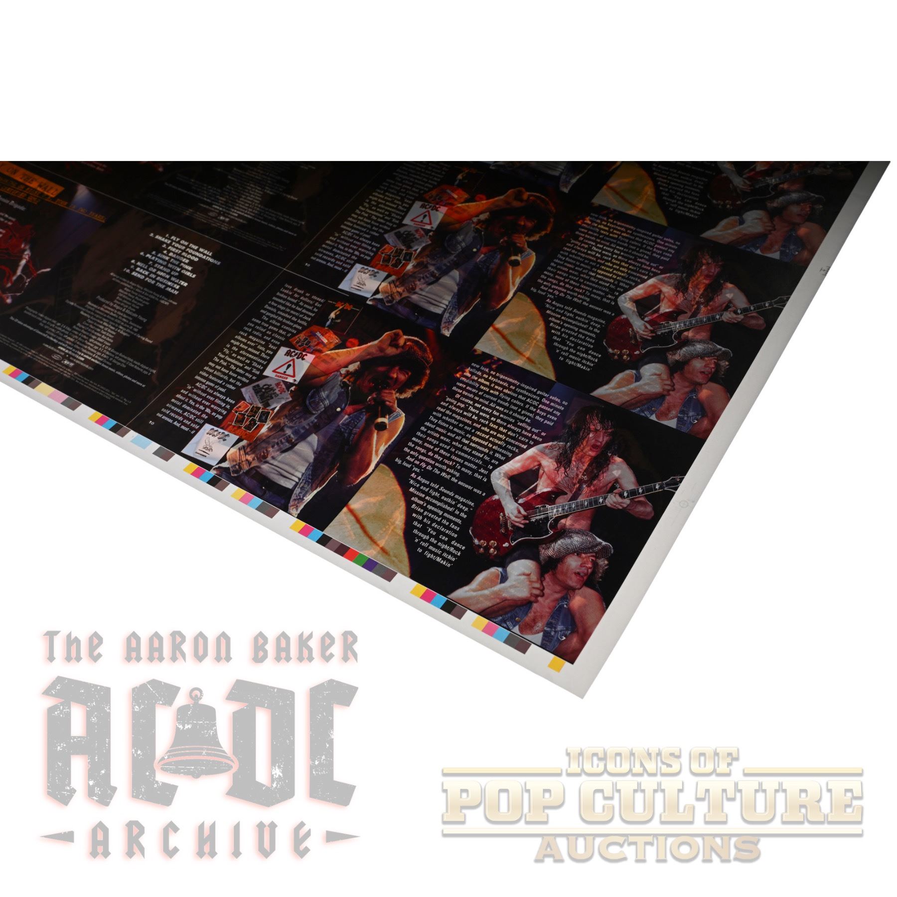Featured here is an original two-sided full-color printer’s proof sheet measuring 40" x 21", created for a compact disc release of AC/DC’s 1985 album Fly on the Wall. The sheet shows multiple repetitions of the CD packaging artwork, including cover panels, booklet pages, and inner layouts, arranged for pre-production alignment and review. Printer’s proofs like this were produced to check design accuracy, registration, and color quality prior to mass printing, and were never meant for commercial distribution. This rare production artifact offers a behind-the-scenes look at the packaging process for Fly on the Wall, one of AC/DC’s mid-1980s releases, making it a unique collectible for serious fans and collectors.