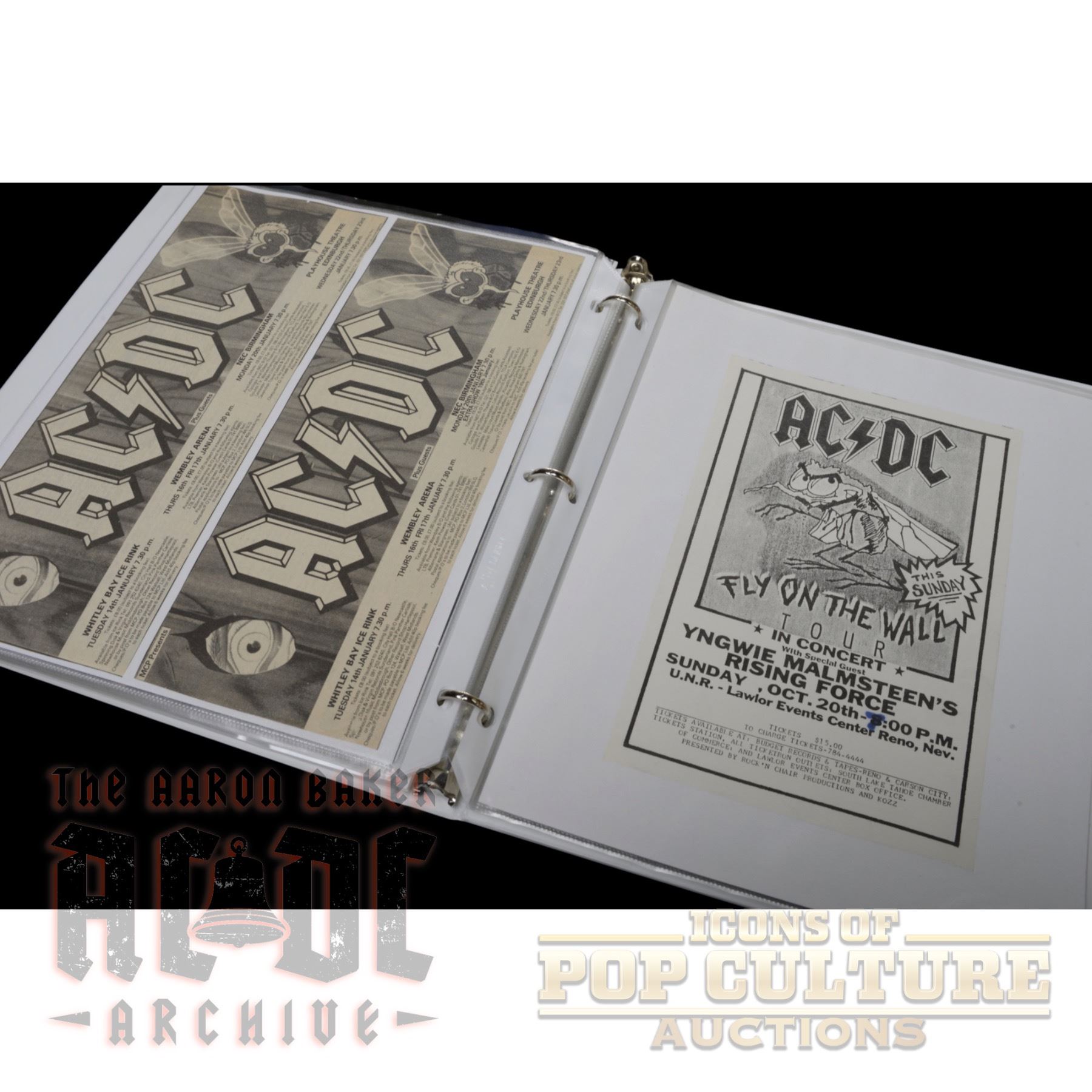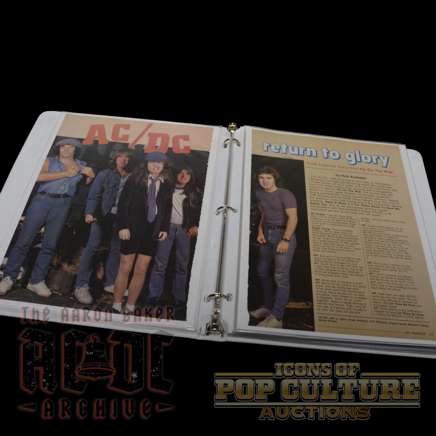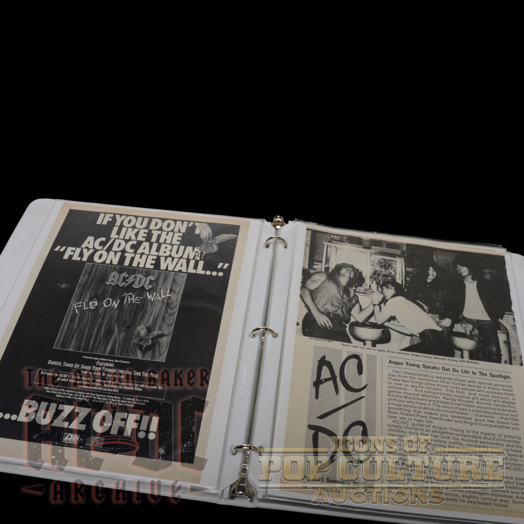 Offered here is a scrapbook compiled by noted AC/DC archivist and collector Aaron Baker, dedicated to the band’s Fly on the Wall era (1985–1986). This carefully assembled collection includes original news clippings, concert advertisements, fold-out posters, and photographs documenting AC/DC during this unique chapter of their career. Featured within are articles, promotional pieces, and live imagery highlighting Angus Young, Brian Johnson, Malcolm Young, Cliff Williams, and Simon Wright as they promoted the Fly on the Wall album and embarked on the corresponding world tour. A rare and comprehensive archive, this scrapbook captures the press coverage and visual history of AC/DC in the mid-1980s.