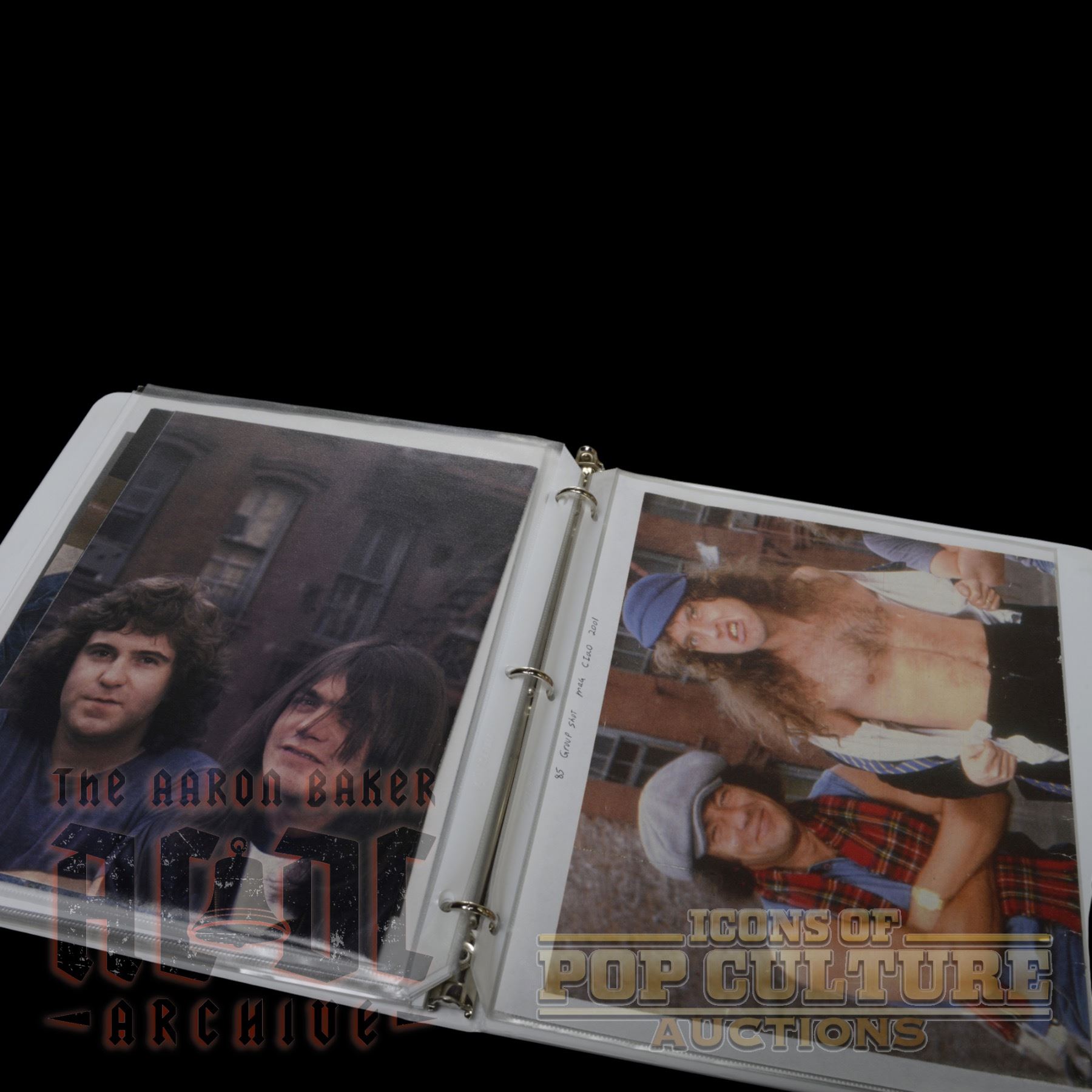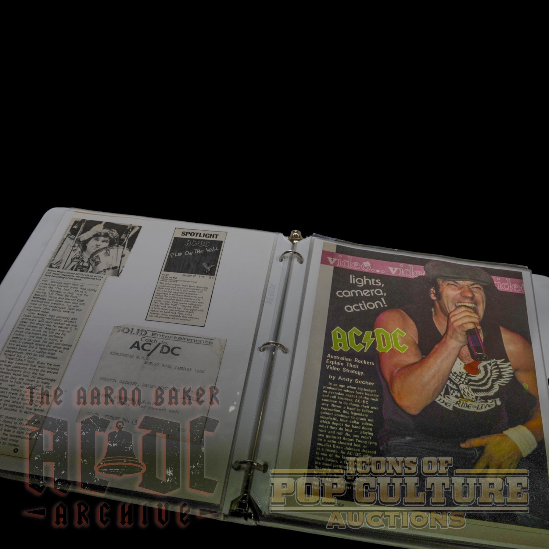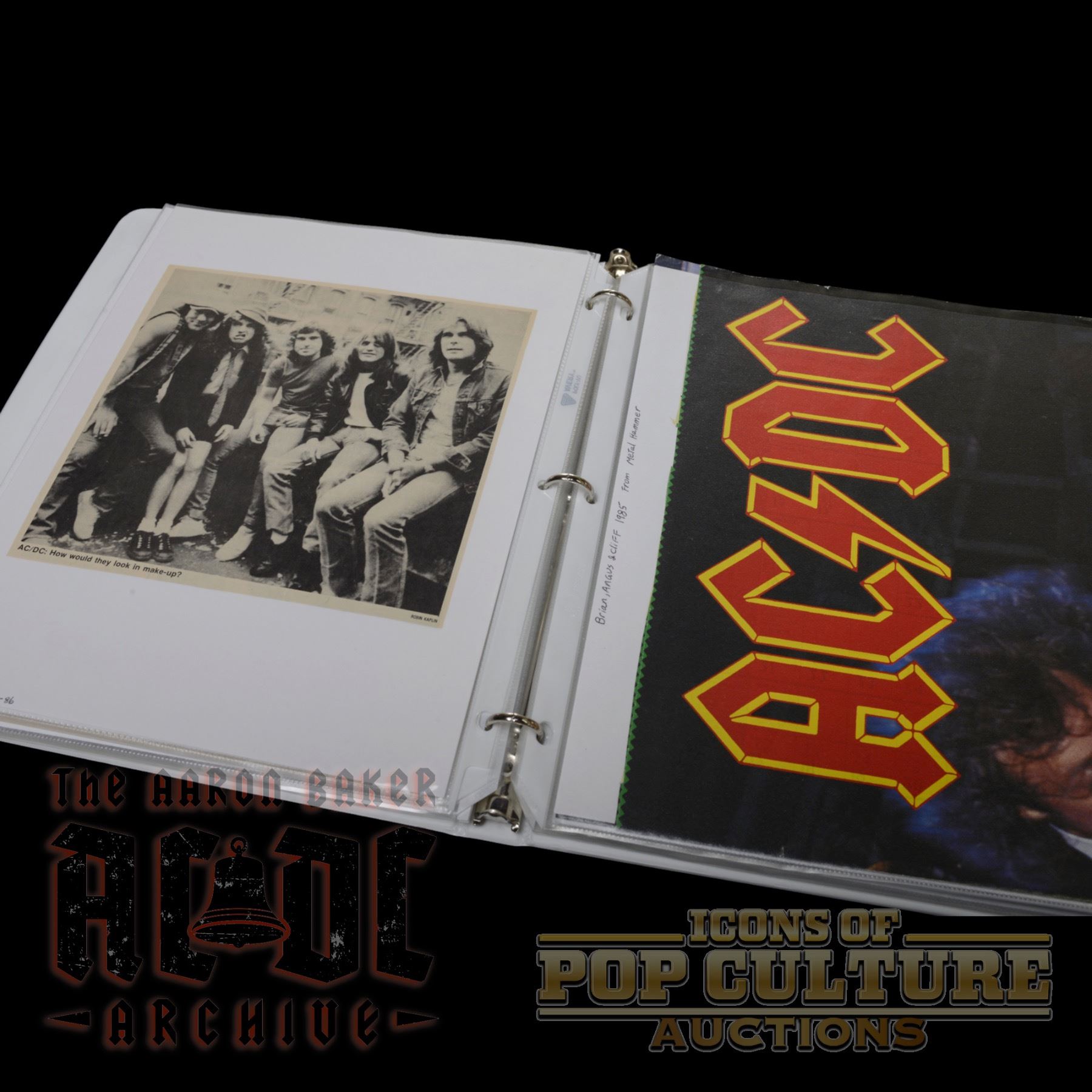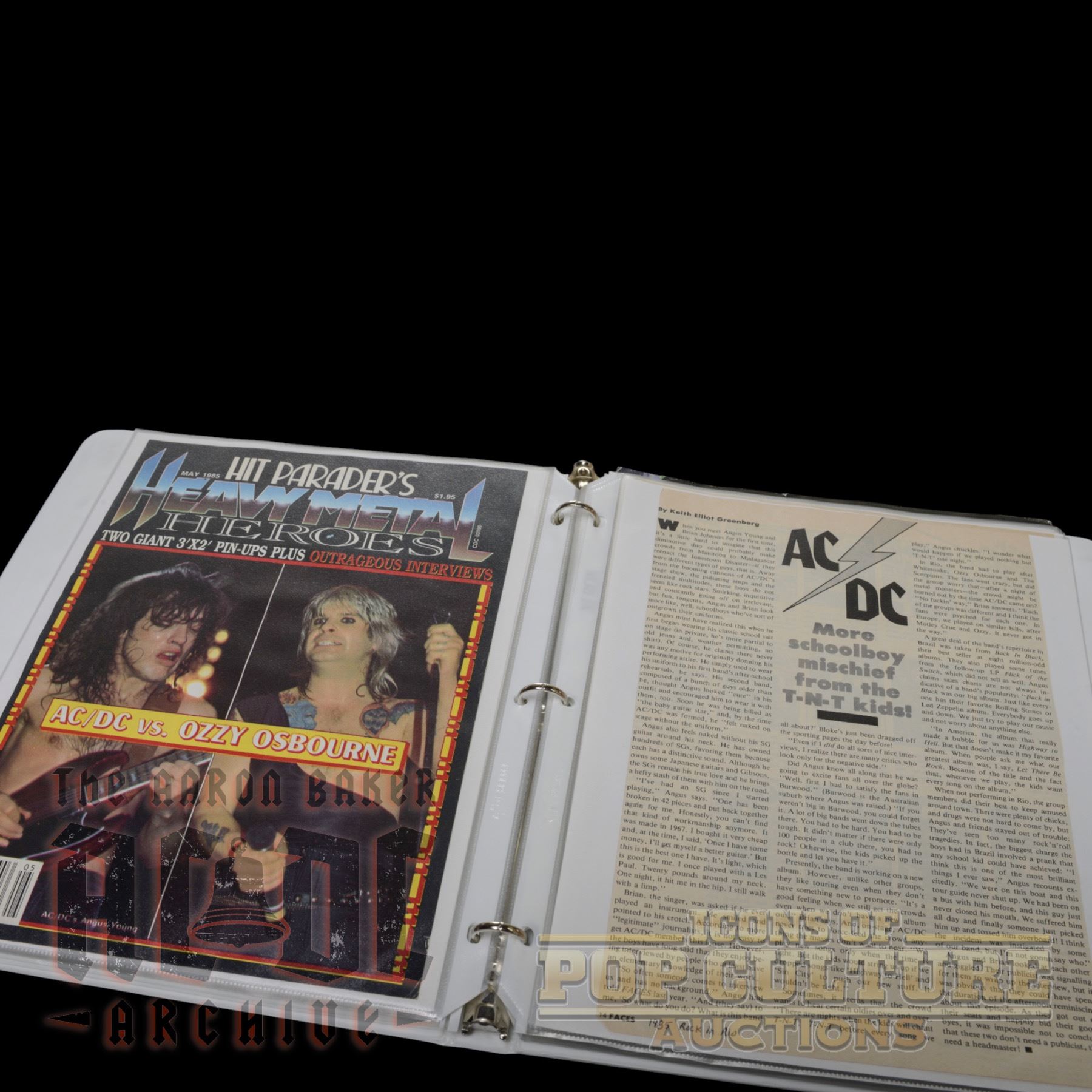 Offered here is a scrapbook compiled by noted AC/DC archivist and collector Aaron Baker, dedicated to the band’s Fly on the Wall era (1985–1986). This carefully assembled collection includes original news clippings, concert advertisements, fold-out posters, and photographs documenting AC/DC during this unique chapter of their career. Featured within are articles, promotional pieces, and live imagery highlighting Angus Young, Brian Johnson, Malcolm Young, Cliff Williams, and Simon Wright as they promoted the Fly on the Wall album and embarked on the corresponding world tour. A rare and comprehensive archive, this scrapbook captures the press coverage and visual history of AC/DC in the mid-1980s.