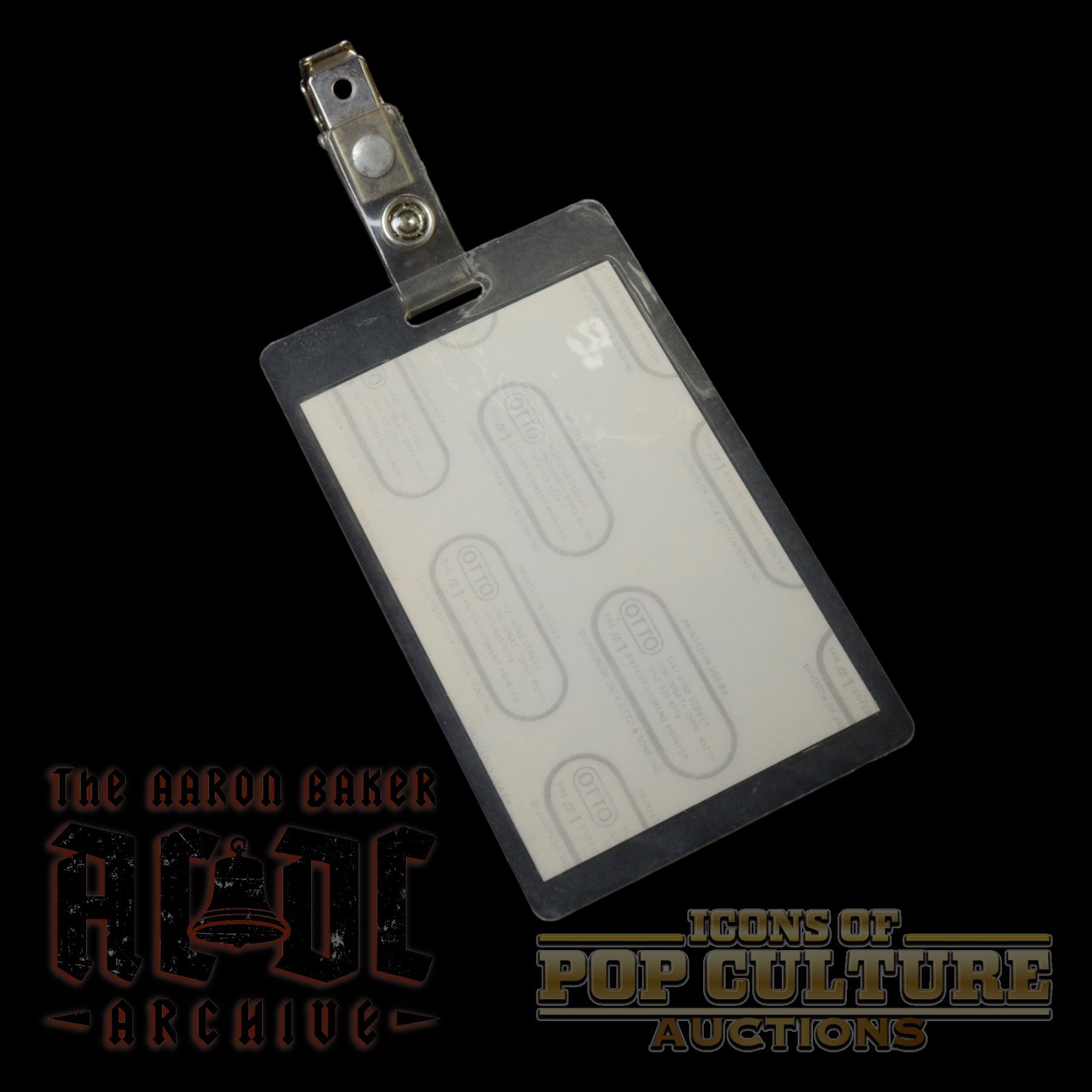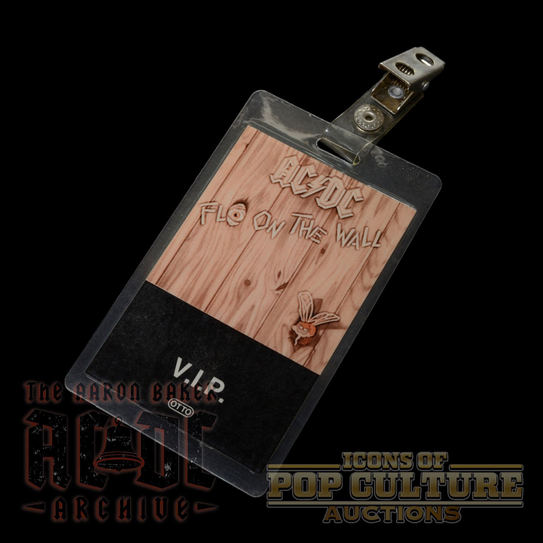Extremely rare laminated VIP pass issued for AC/DC’s Fly on the Wall tour, measuring 5.75" x 2.5". The design features the tour’s signature wood panel background with the cartoon fly peeking through a knothole, along with the bold AC/DC logo and “V.I.P.” designation across a solid black panel. Manufactured by Otto and retaining its original metal clip, the reverse displays the company’s printed security backing. Granted only to select guests with privileged backstage access, this pass is a scarce and authentic piece of AC/DC’s 1980s touring history.