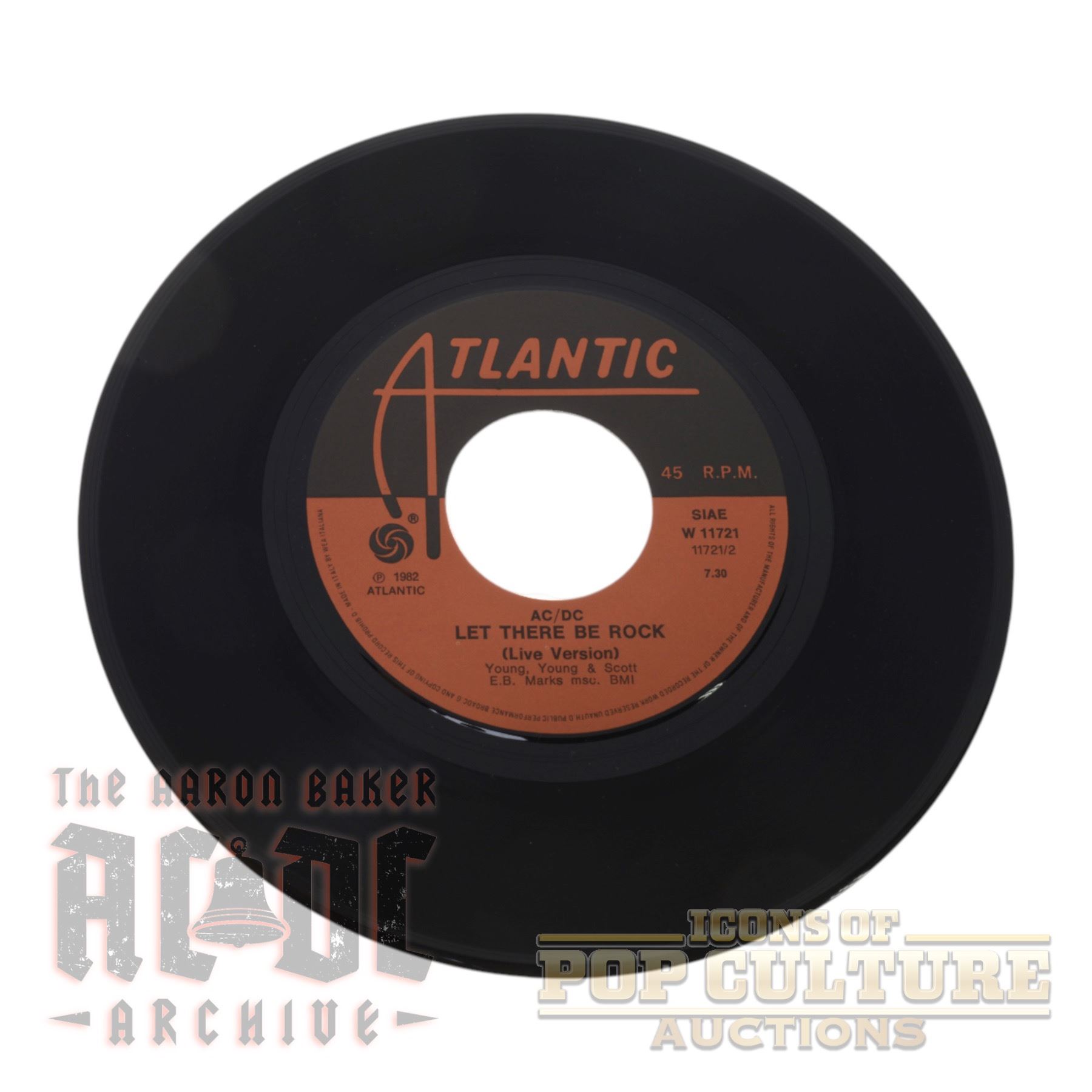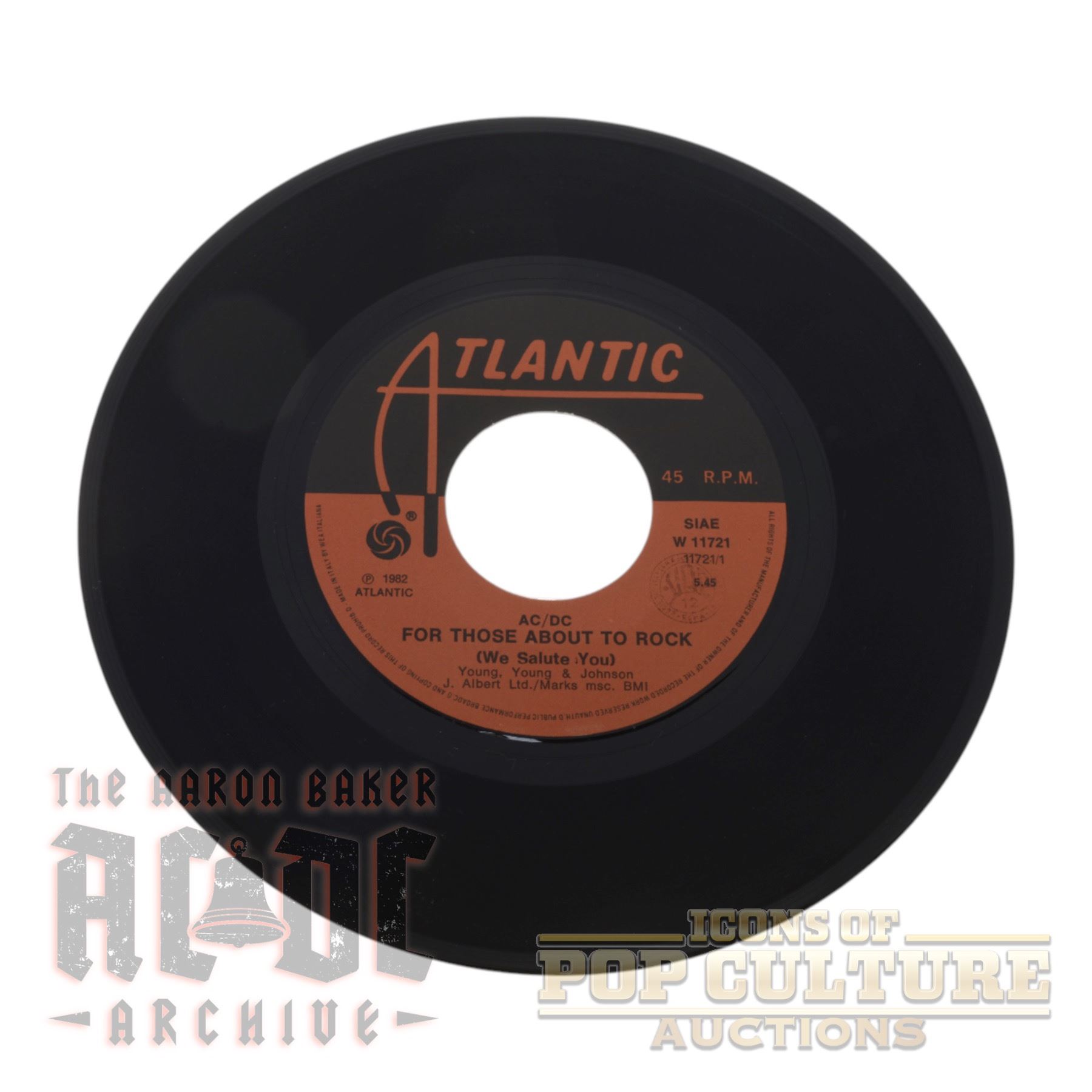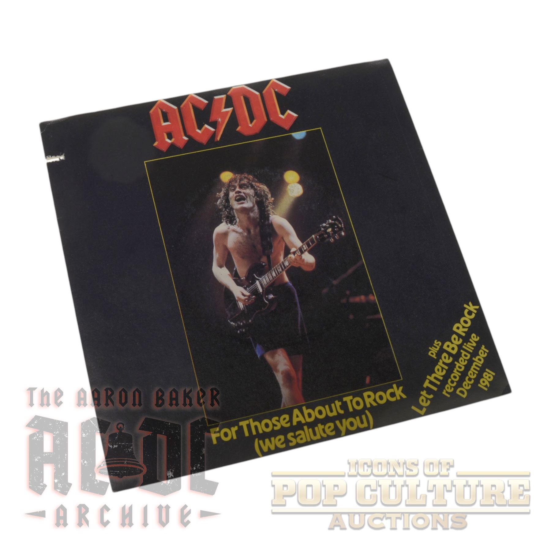 An original Italian 7-inch single release of AC/DC’s “For Those About To Rock (We Salute You)” backed with a live version of “Let There Be Rock,” recorded in December 1981. Issued in 1982 on Atlantic Records with catalog number W11721, this single features the title track from the band’s 1981 album, produced by Robert John “Mutt” Lange, and showcases the band’s powerful live performance on the B-side. The picture sleeve highlights Angus Young in full performance mode, and the rear sleeve includes album artwork and tour dates from the early 1980s European tour. A collectible piece for fans of AC/DC’s classic era.