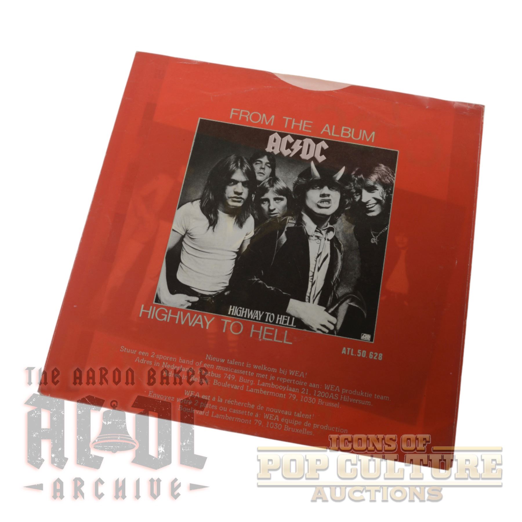 The striking red picture sleeve features a black-and-white shot of the band on the front, with Angus Young in full schoolboy regalia, flanked by Malcolm Young, Cliff Williams, Phil Rudd, and Bon Scott. The reverse promotes Highway to Hell with its iconic album cover and includes WEA Belgium and Netherlands contact details in both Dutch and French, underscoring its regional release.