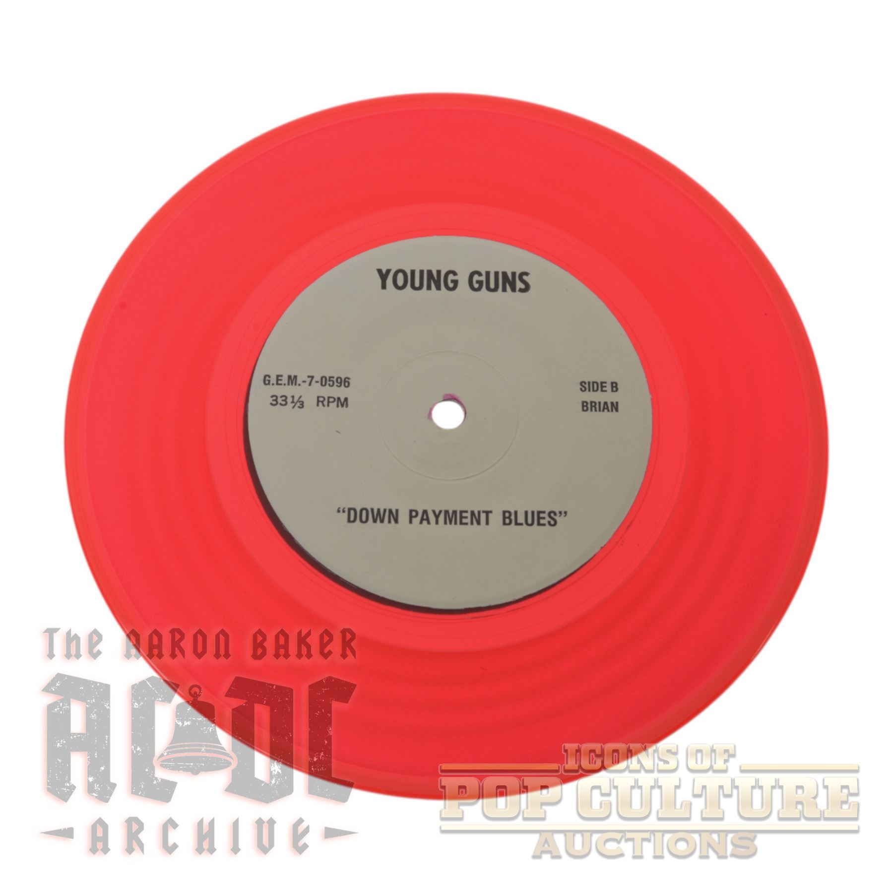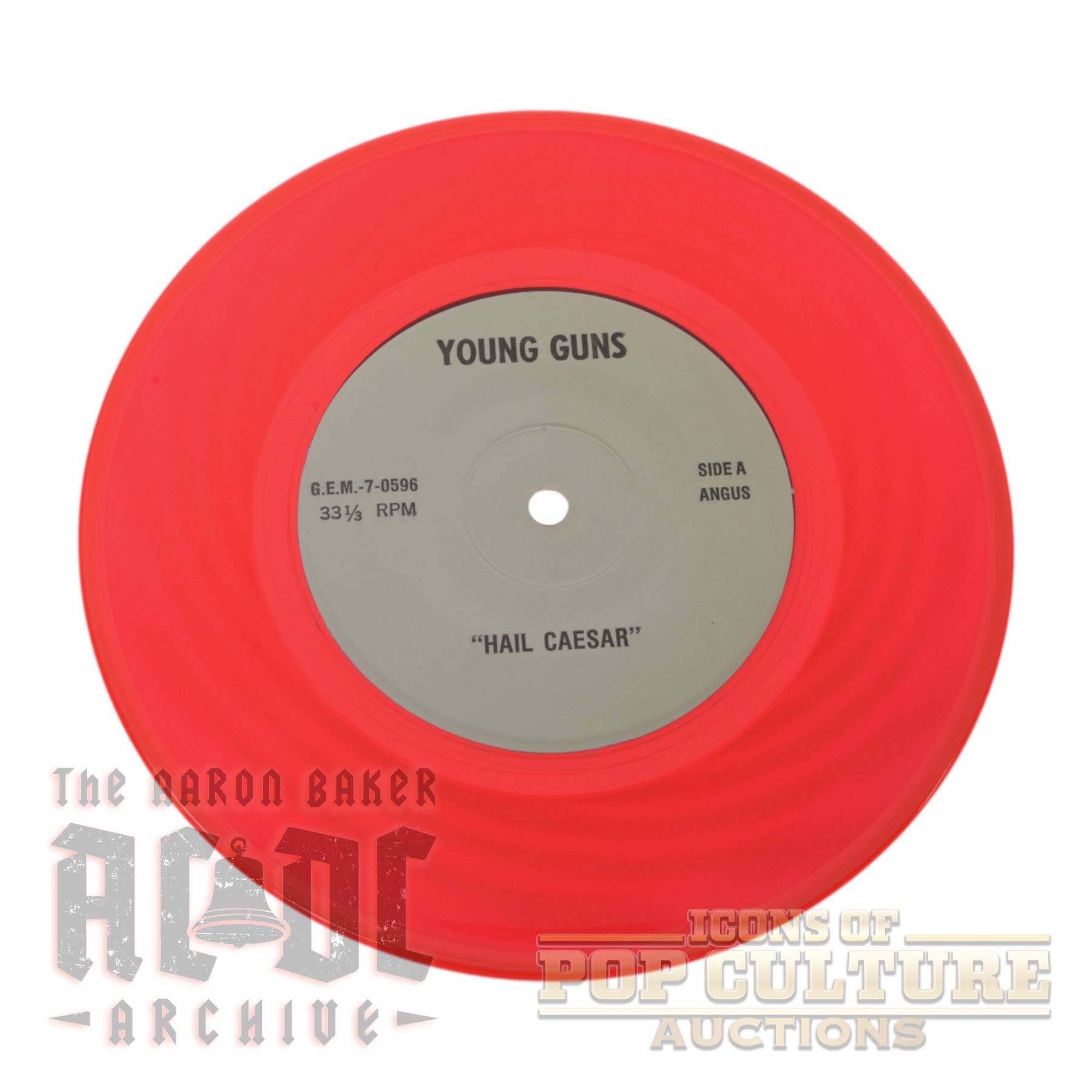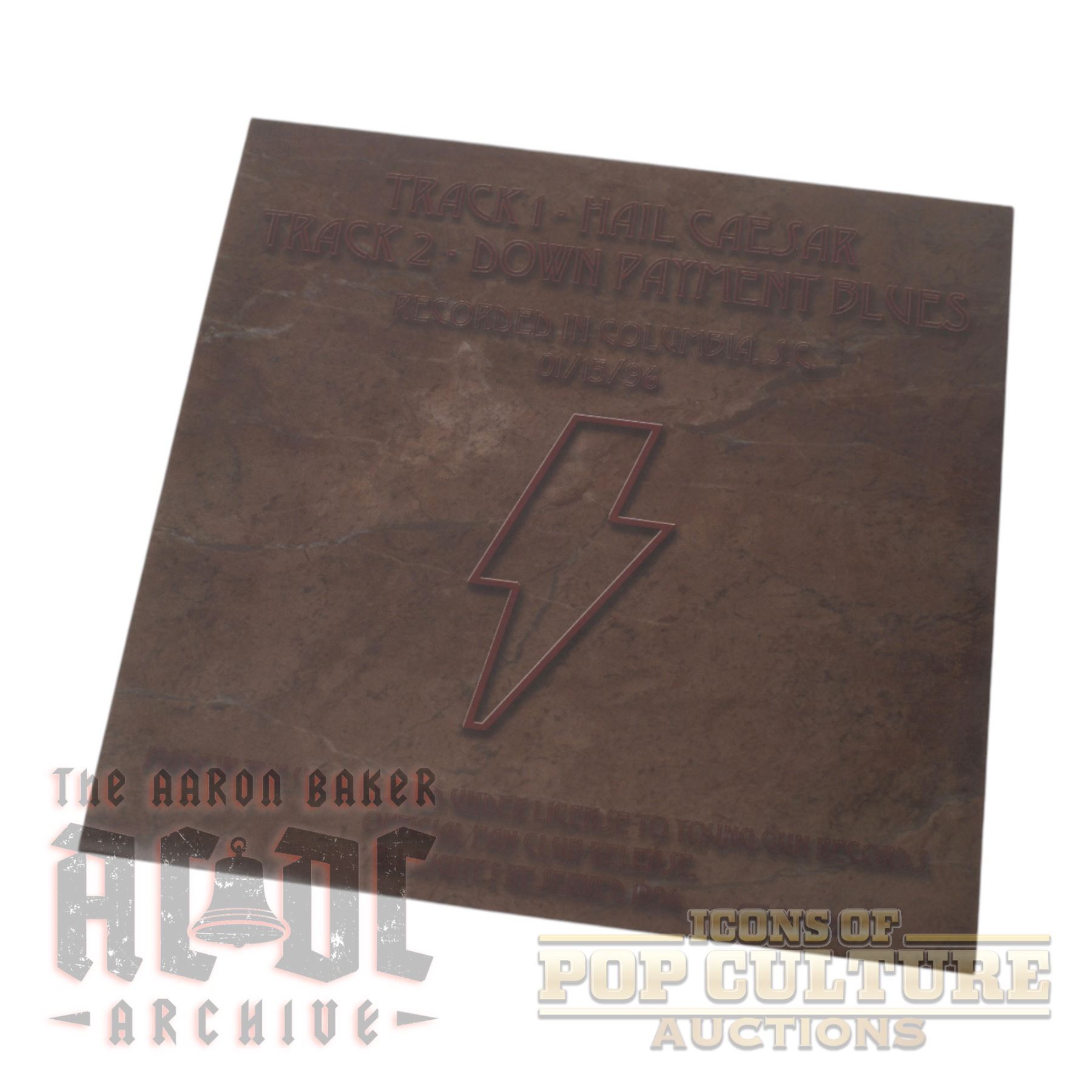 Offered here is an unofficial AC/DC 7" single titled Hail Angus, released on red vinyl under the Young Guns label with catalog number GEM-7-0596. This release features two live recordings: “Hail Caesar” on Side A and “Down Payment Blues” on Side B, both noted as recorded in Columbia, South Carolina, on January 28, 1996, during the Ballbreaker world tour. The single is pressed on striking translucent red vinyl and comes housed in a custom picture sleeve that depicts Angus Young performing against a dramatic fiery backdrop with the phrase “Hail Angus” emblazoned at the top. The back cover lists track details in a stone-style design with an embossed lightning bolt. As an unofficial fan-produced pressing, this record was not part of AC/DC’s official catalog, but it has become a collectible piece among enthusiasts for its unique presentation and live concert connection.