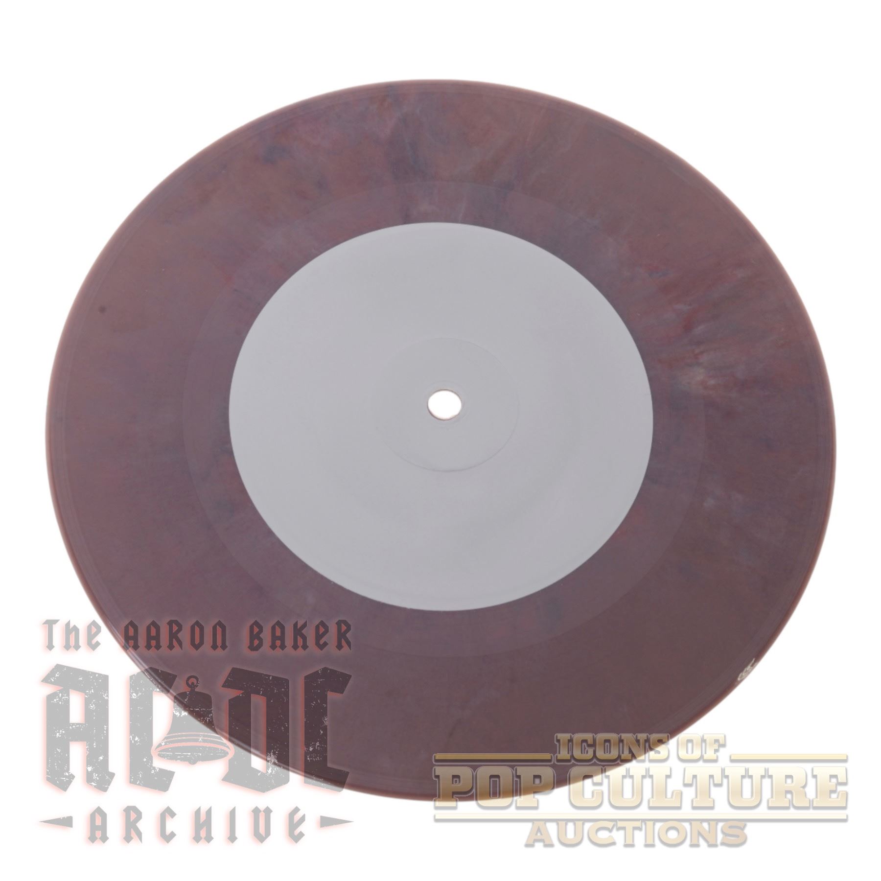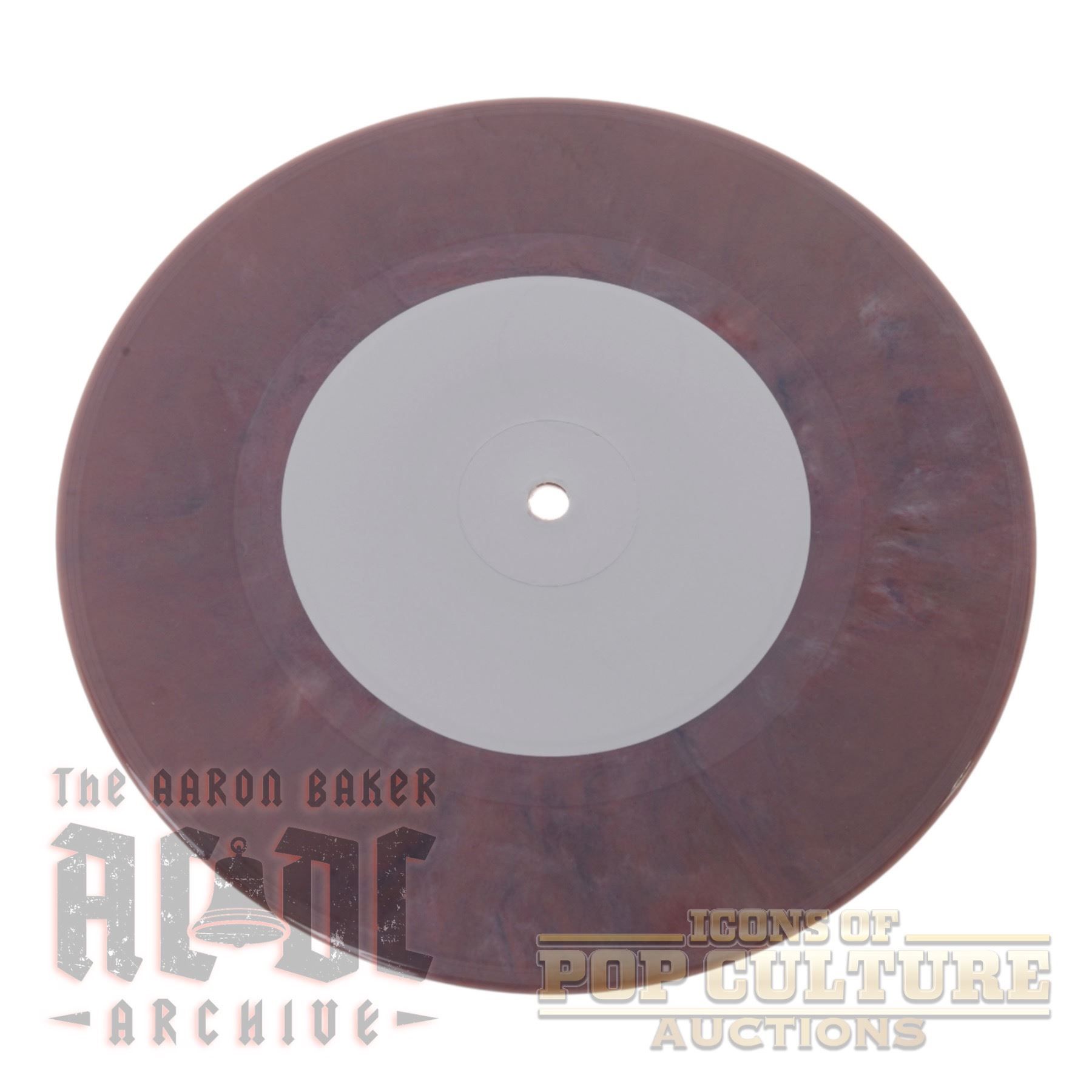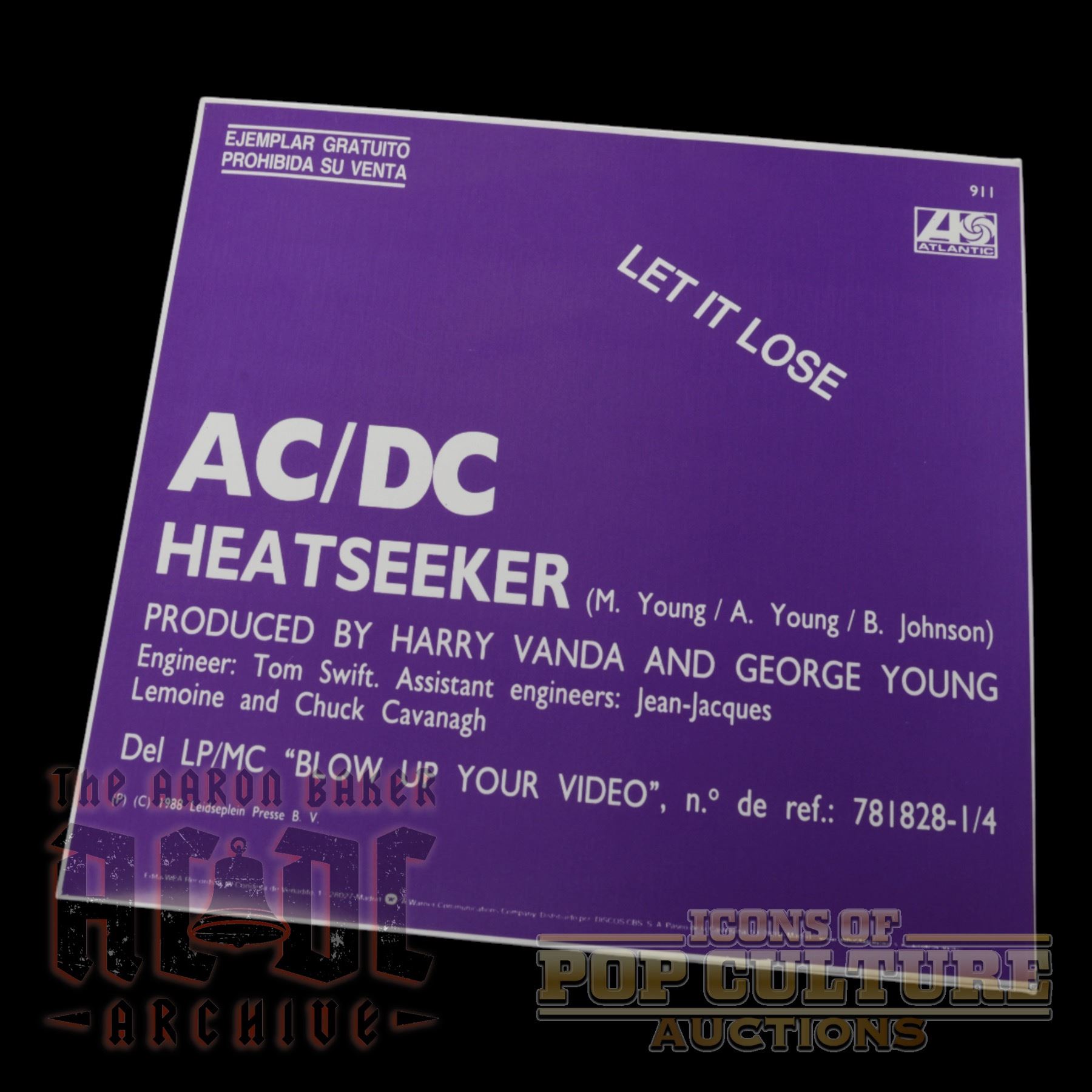 Offered here is an unofficial 7-inch single of AC/DC’s “Heatseeker,” presented on purple marbled vinyl. This release features the tracks “Heatseeker” and “Let It Loose,” both tied to the band’s 1988 album Blow Up Your Video. The sleeve artwork depicts Angus Young in performance with a striking purple-toned design, while the reverse credits production to Harry Vanda and George Young. Issued without catalog markings typical of official Atlantic Records releases, this pressing is a fan-produced item, not part of AC/DC’s authorized discography. Unofficial singles such as this one were often circulated in small numbers among collectors, making them interesting artifacts for fans seeking unique variations of the band’s work.