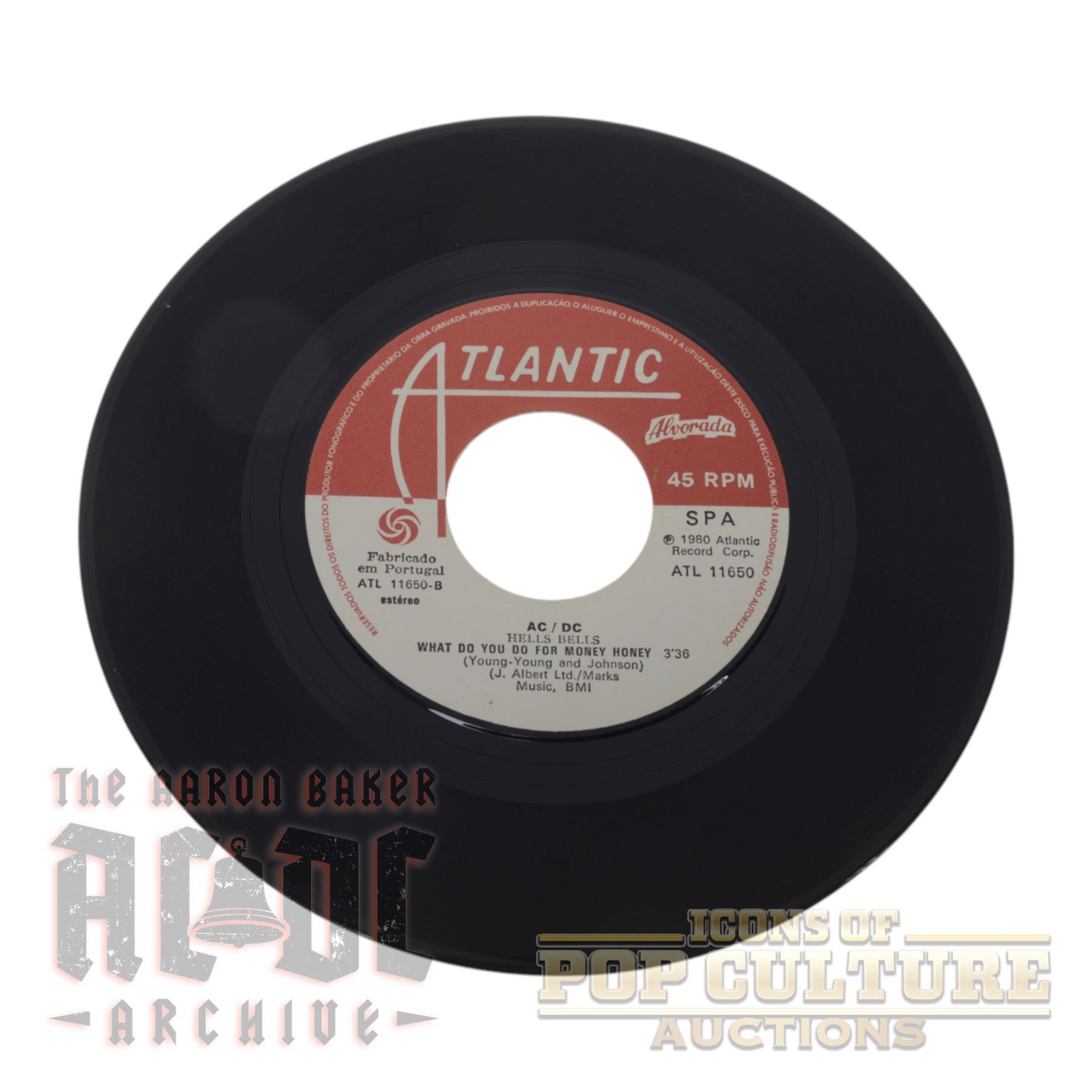 Presented here is an original Portuguese pressing of AC/DC’s 7-inch single Hell’s Bells, backed with What Do You Do for Money Honey. Issued on Atlantic Records under catalog number ATL 11650 in 1980. The record features distinctive Portuguese Atlantic/Alvorada labels and comes housed in a unique picture sleeve showcasing AC/DC performing live under a dramatic stage lighting display on the front, with additional album artwork reproductions and release details on the back. A classic collectible from the Back in Black era, this pressing highlights the band’s international reach at the height of their career.