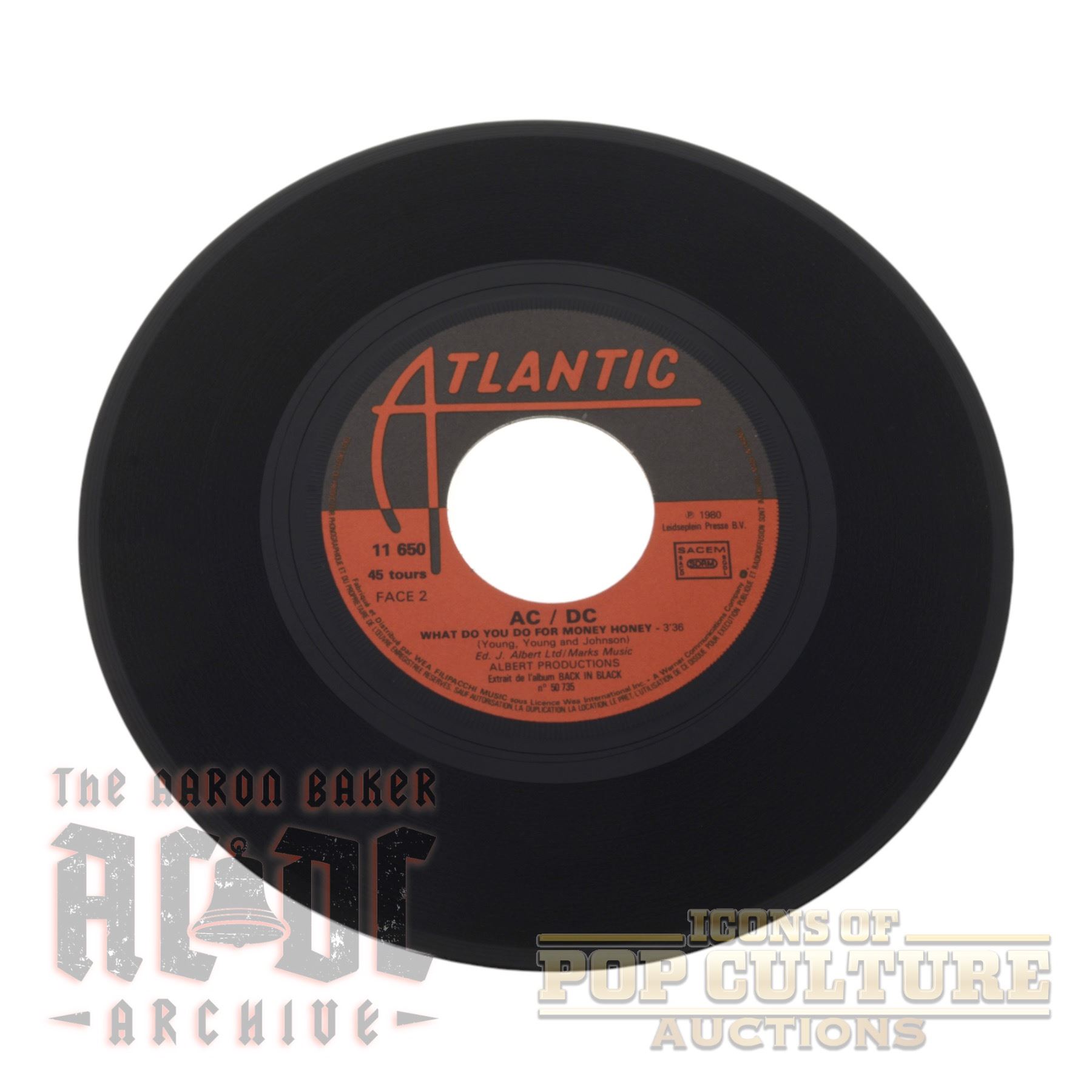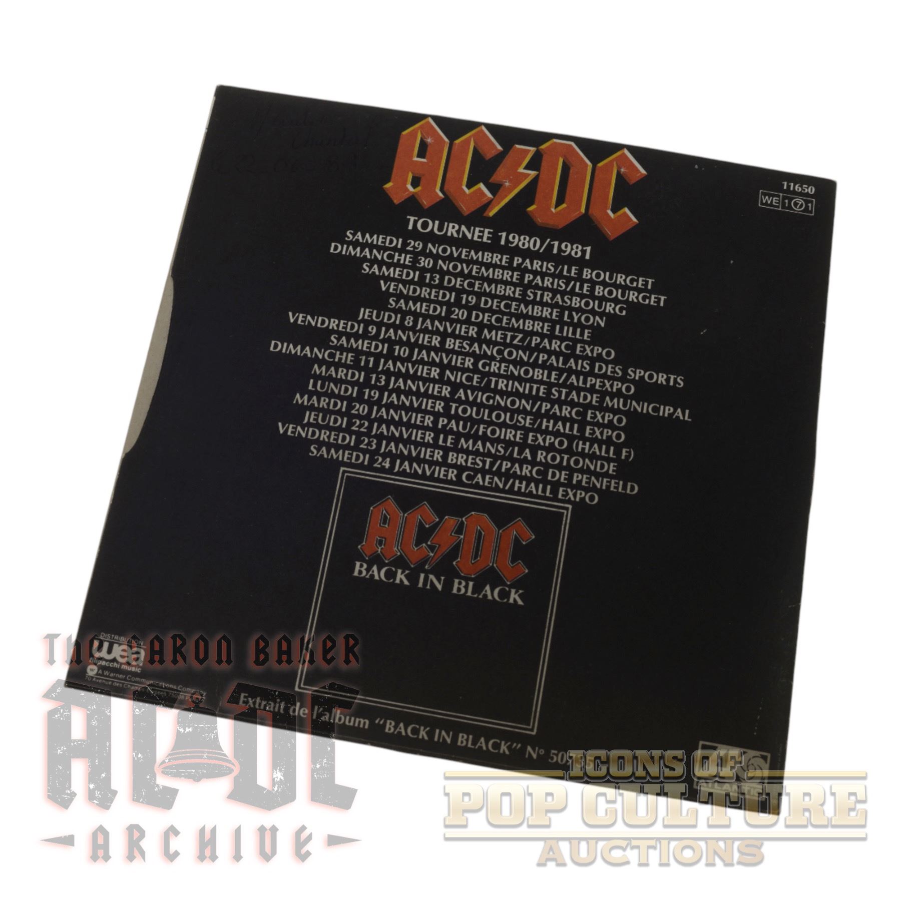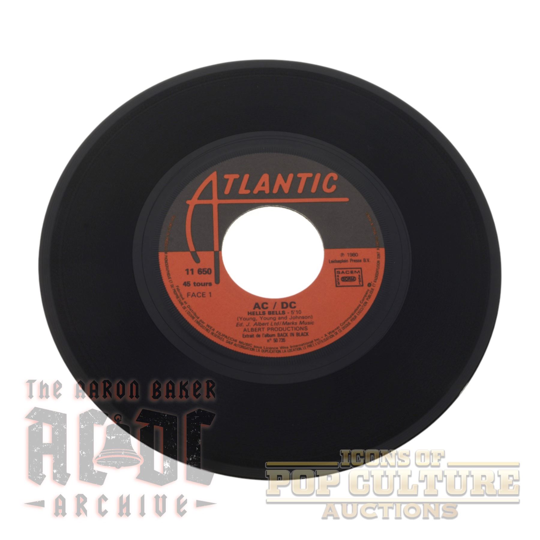 This is the original French 7-inch vinyl single release of AC/DC’s “Hell’s Bells,” backed with “What Do You Do for Money Honey,” issued in 1980 under catalog number 11 650 on Atlantic Records. Pulled from the legendary Back in Black album, this single captures the raw power and precision of AC/DC at their peak, featuring Brian Johnson’s searing vocals, Angus Young’s electrifying lead guitar, Malcolm Young’s rock-solid rhythm, Cliff Williams’ bass thunder, and Phil Rudd’s unshakable groove. The striking picture sleeve showcases the iconic “Hell’s Bell” artwork on the front, while the reverse lists dates from AC/DC’s 1980/1981 French tour, making it a standout collectible for fans of both the band and rock history. This pressing was manufactured and distributed in France by WEA Filipacchi Music.