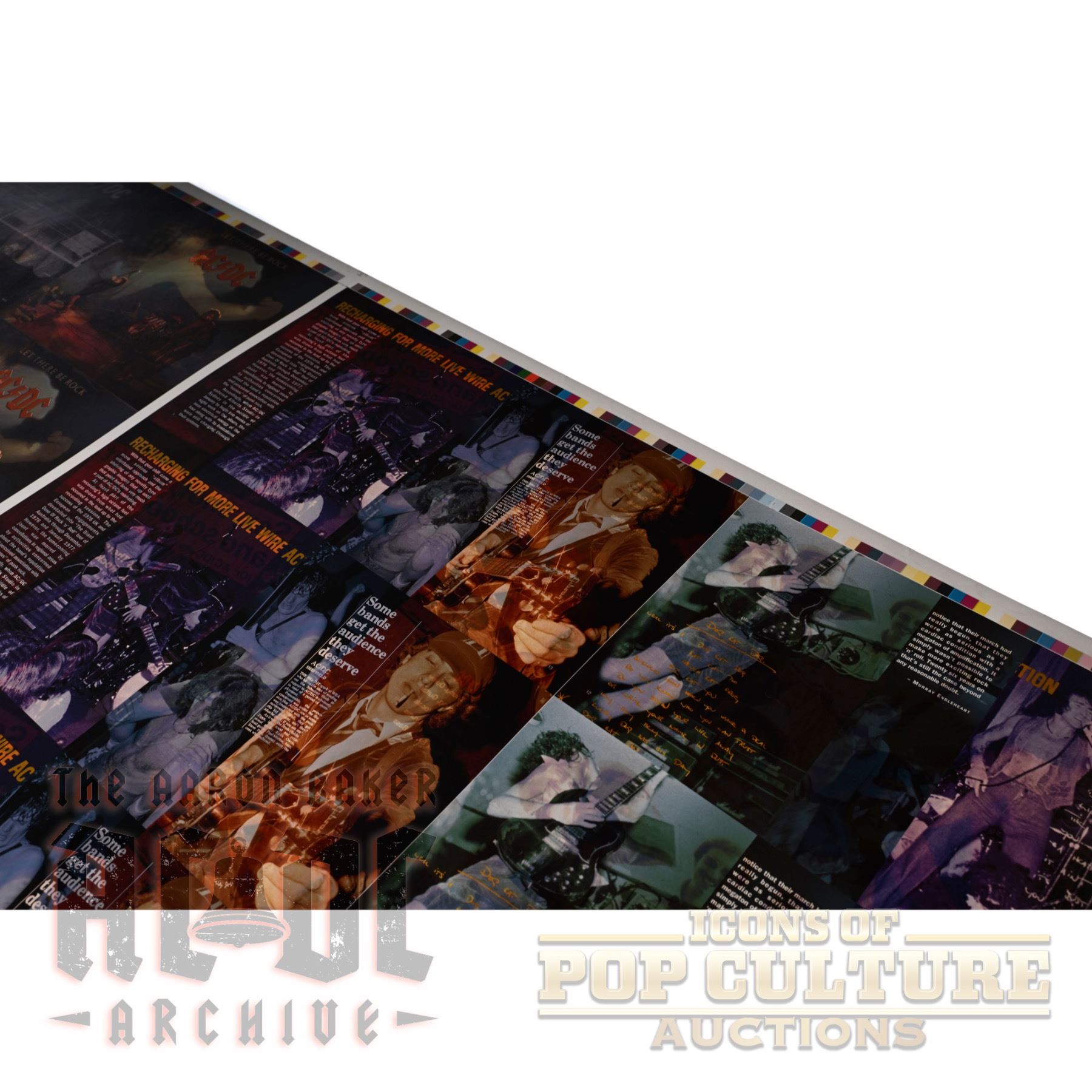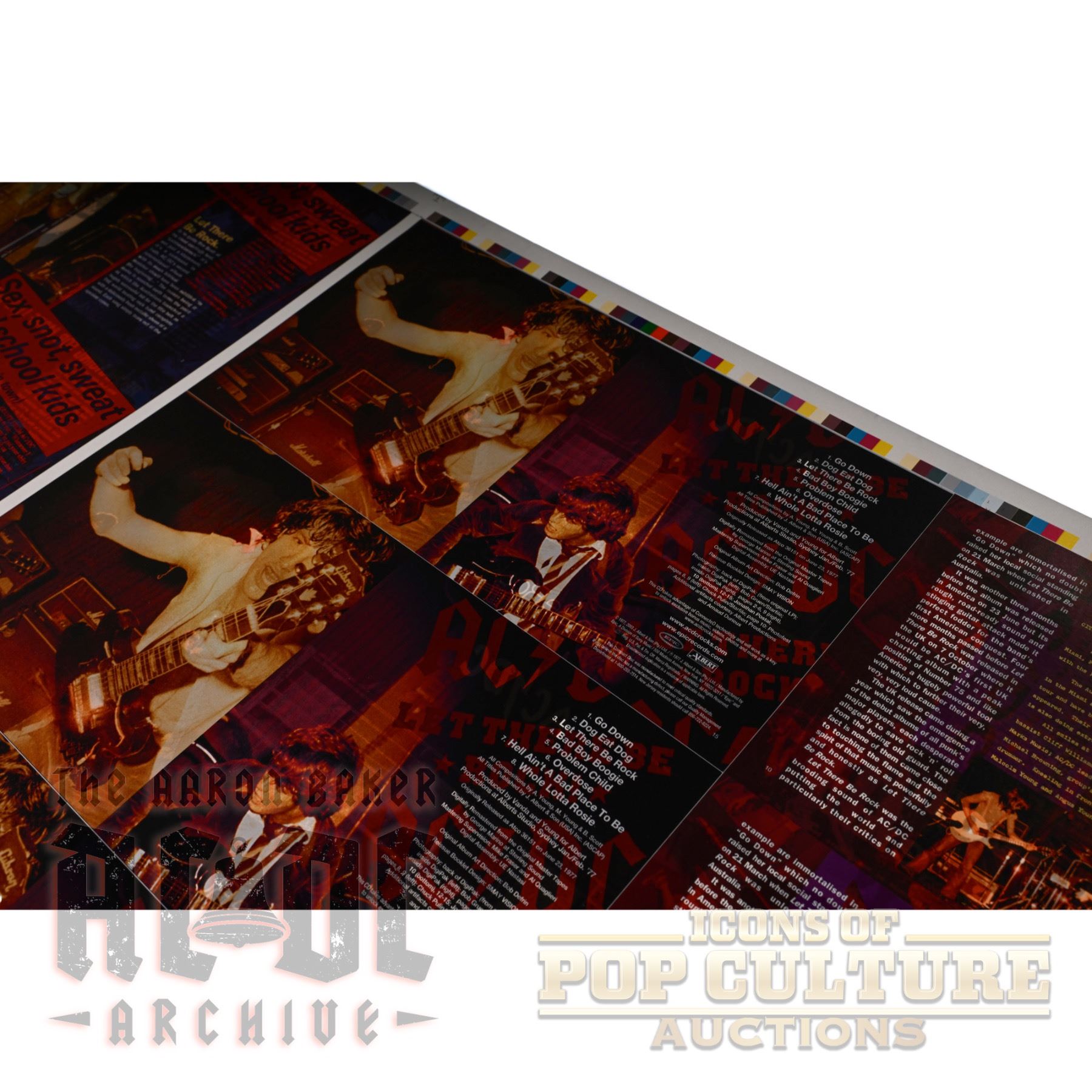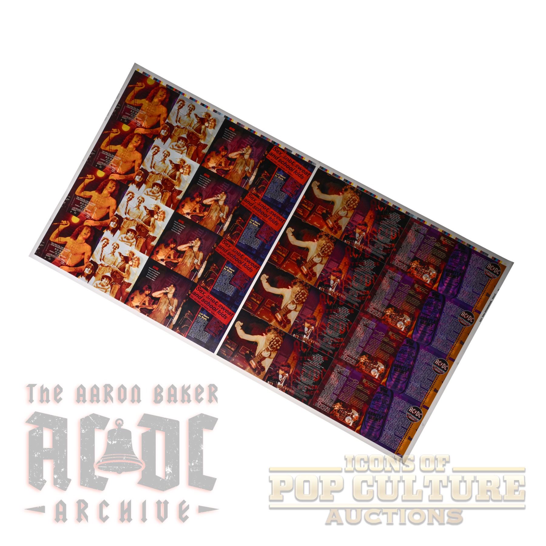 Presented here is an original 40" x 21" full-color two-sided printer’s proof sheet created for a compact disc release of AC/DC’s classic 1977 album Let There Be Rock. The sheet features multiple repetitions of the CD packaging artwork, including front and back covers, inner panels, and text layouts, arranged for pre-production printing alignment. Printer’s proofs like this were used by record labels and print houses to check image quality, color balance, and registration before final production. Items of this nature were never intended for public sale, making them rare artifacts tied directly to the manufacturing process. A unique display piece representing one of AC/DC’s most iconic albums, this proof captures the raw energy of Let There Be Rock while highlighting the behind-the-scenes work of its CD-era reissues.