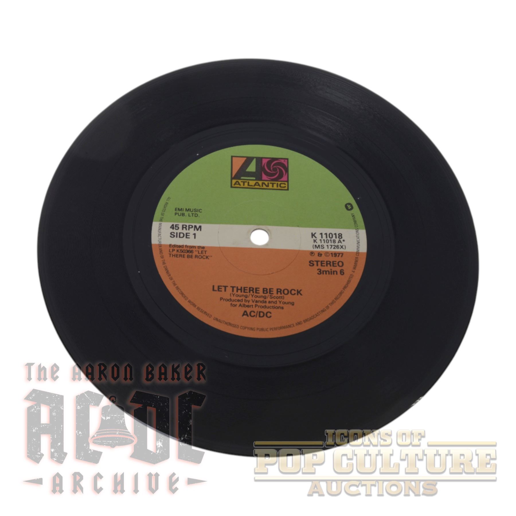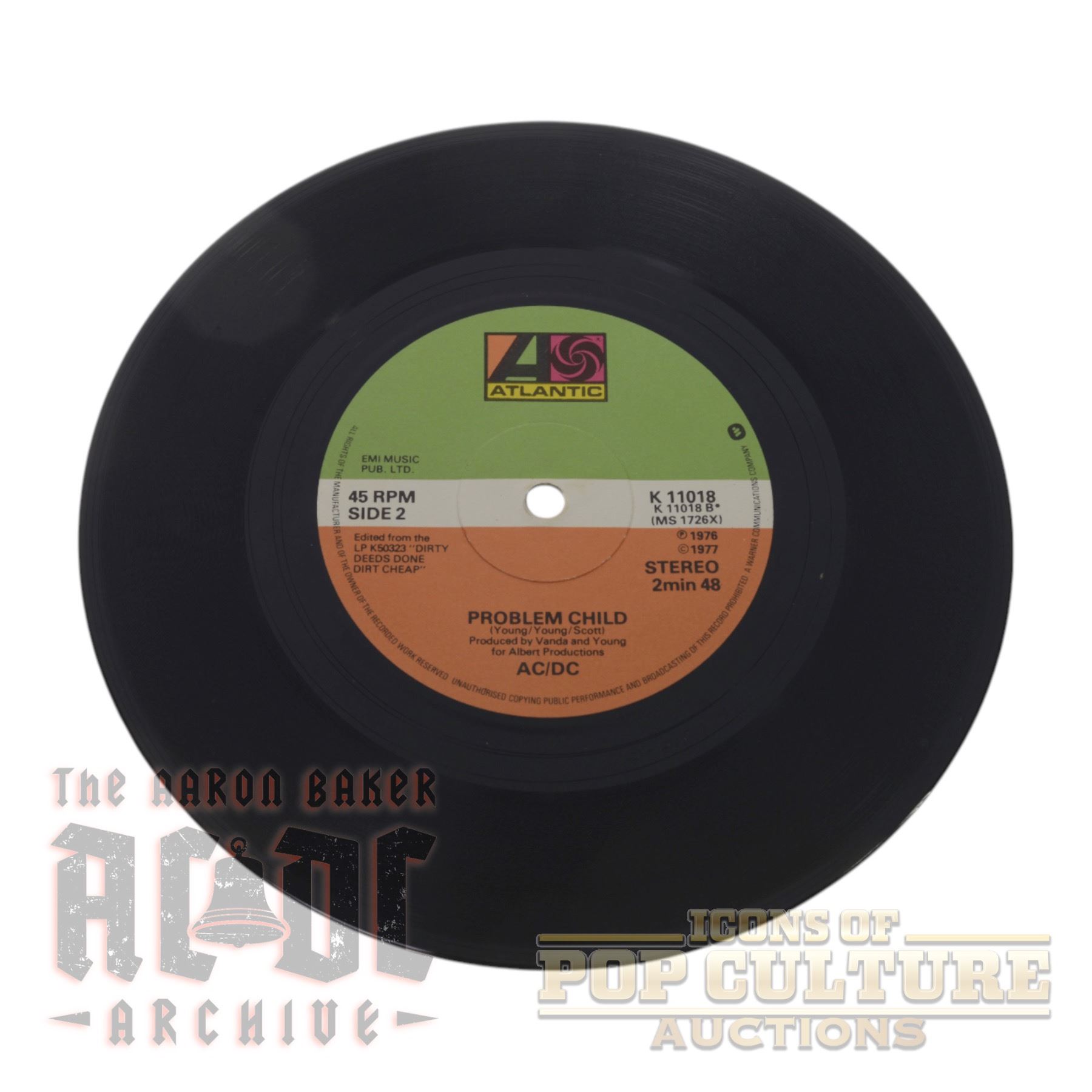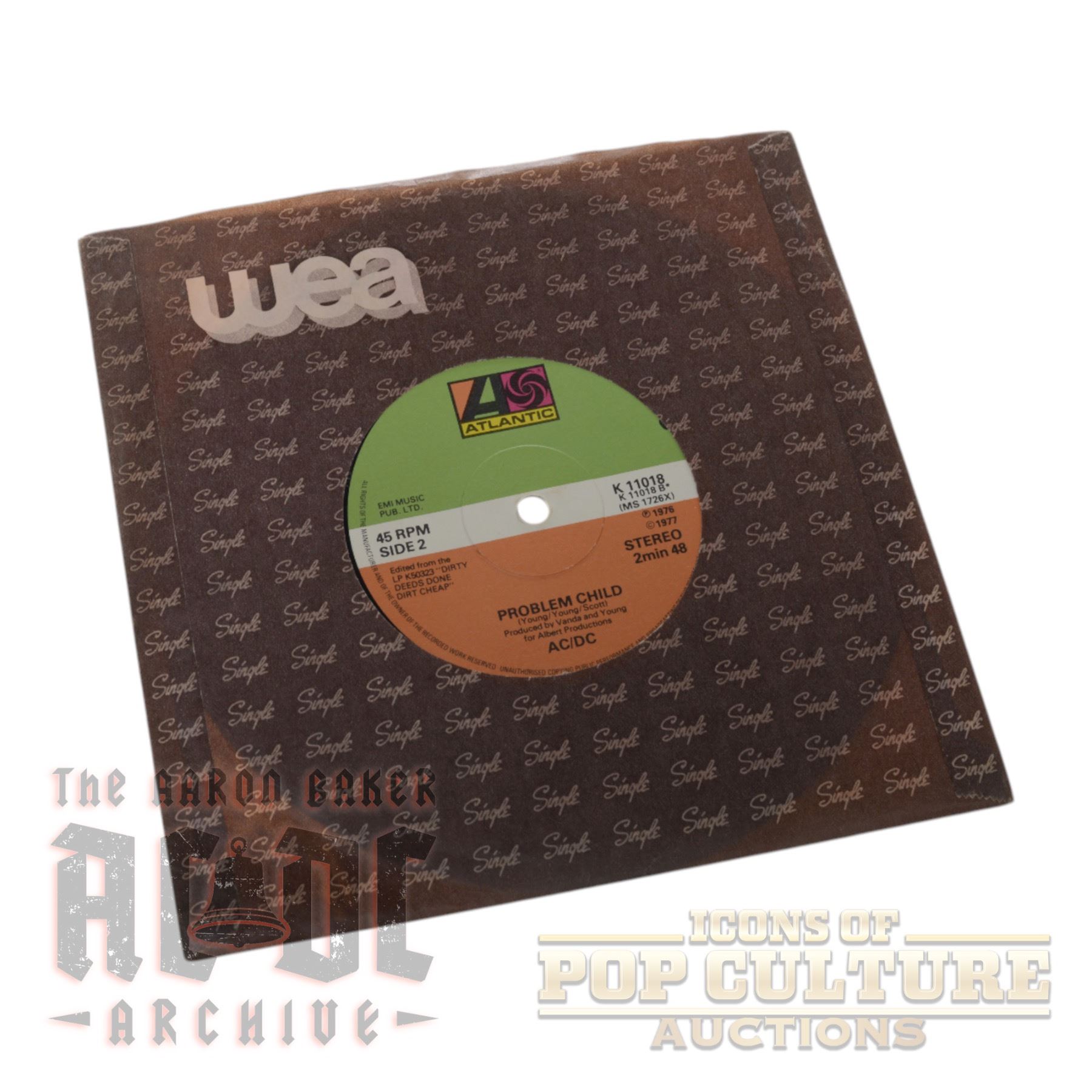 An original UK 7-inch vinyl single by AC/DC, released in 1977 on Atlantic Records with the catalog number K 11018. This release features “Let There Be Rock” on the A-side, running at 3 minutes and 6 seconds, backed with “Problem Child” on the B-side, running at 2 minutes and 48 seconds. Both tracks were written by Angus Young, Malcolm Young, and Bon Scott, with “Let There Be Rock” taken from the landmark album of the same name and “Problem Child” appearing in edited form from Dirty Deeds Done Dirt Cheap. This pressing was issued in a WEA company sleeve and represents an early and highly collectible single from the band’s classic Bon Scott era. A true piece of hard rock history.