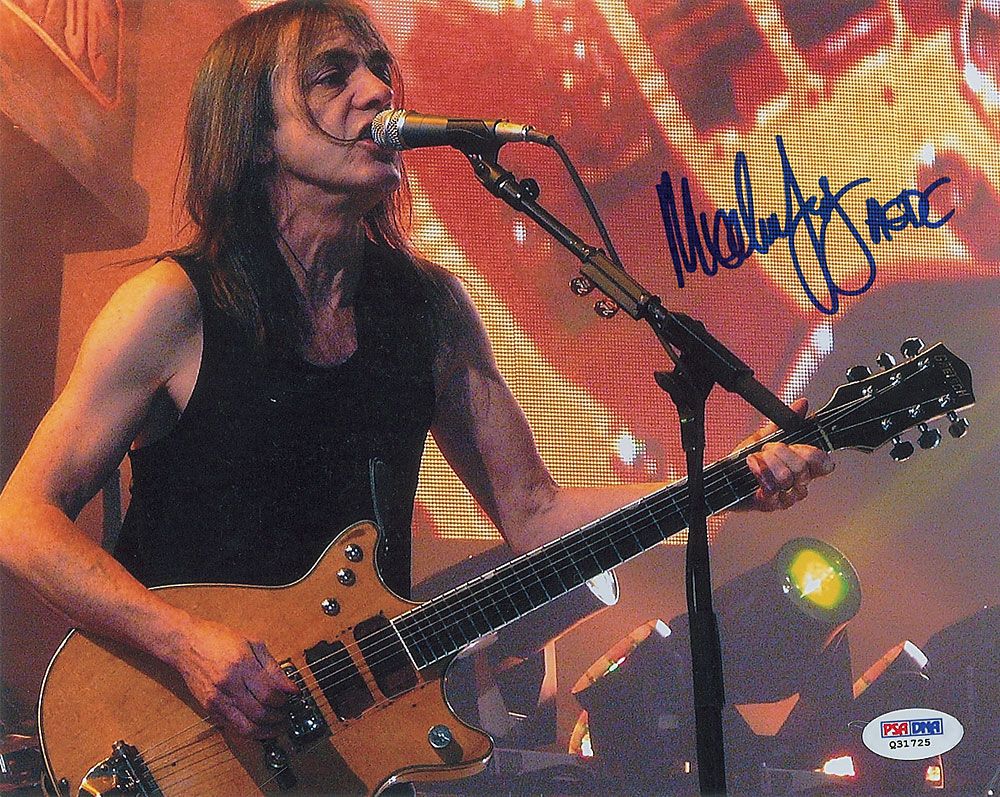 Color satin-finish 10 x 8 photo of Young on stage, signed in blue felt tip, “Malcolm Young AC/DC.” In fine condition, with a small corner tip crease and a PSA/DNA authentication label affixed to lower corner. Accompanied by a certificate of authenticity from PSA/DNA.