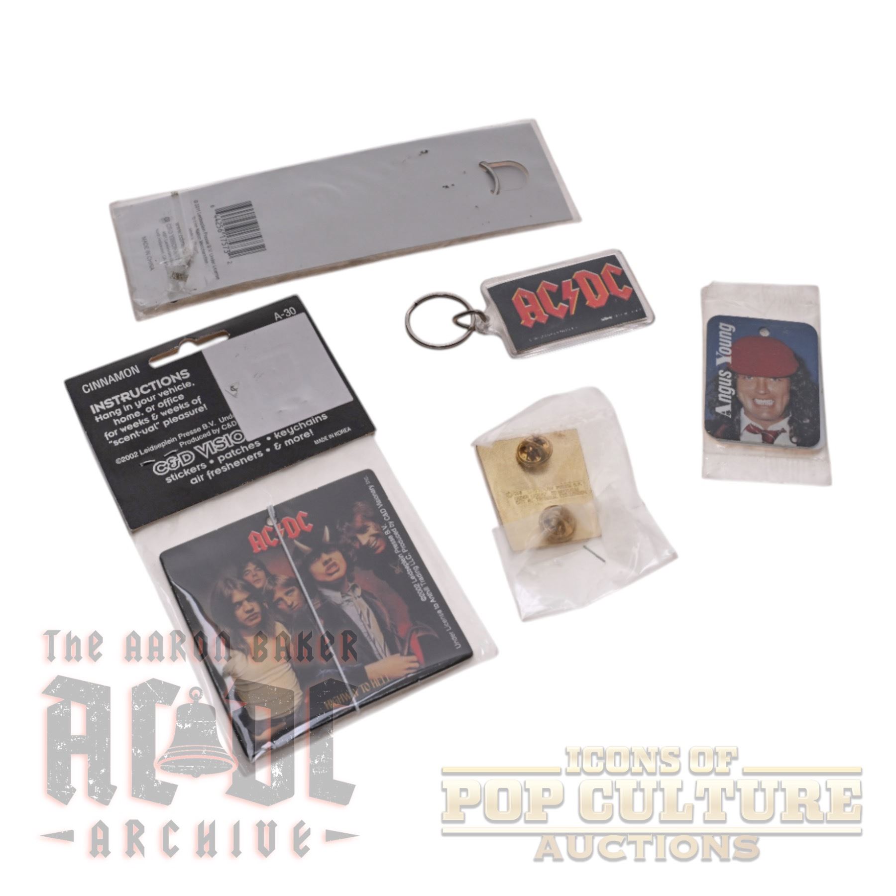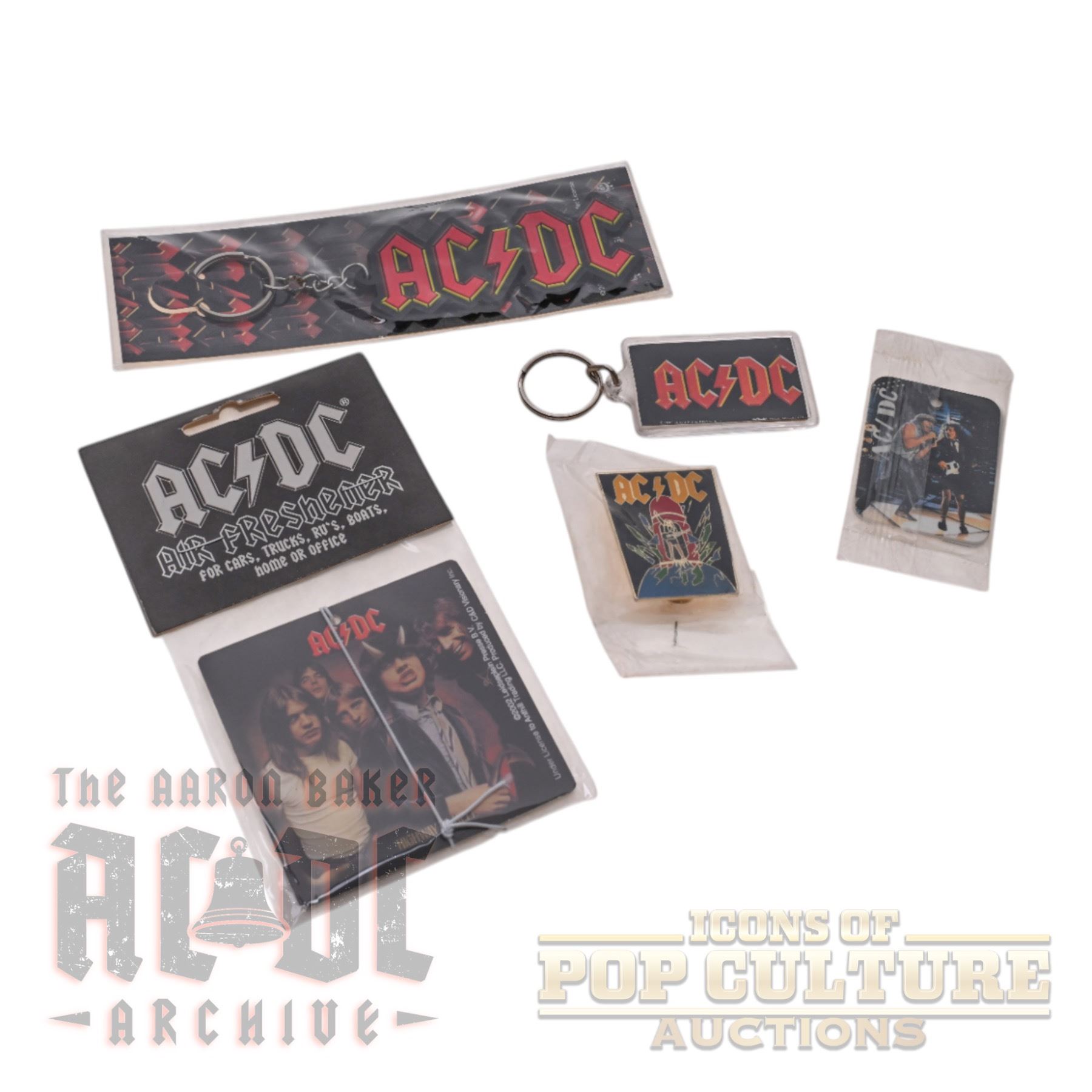 This collection of AC/DC merchandise includes a mix of branded accessories and memorabilia. Featured are two AC/DC logo keychains, one still sealed in original packaging, along with a colorful metal lapel pin bearing AC/DC artwork. Also included are two sealed air fresheners, one showcasing the band’s classic logo and another depicting the early lineup. Rounding out the lot is a double-sided dog tag featuring an image of Angus Young and Brian Johnson performing on stage on one side, with a solo image of Angus Young on the reverse. A varied selection of collectibles celebrating AC/DC’s legacy.