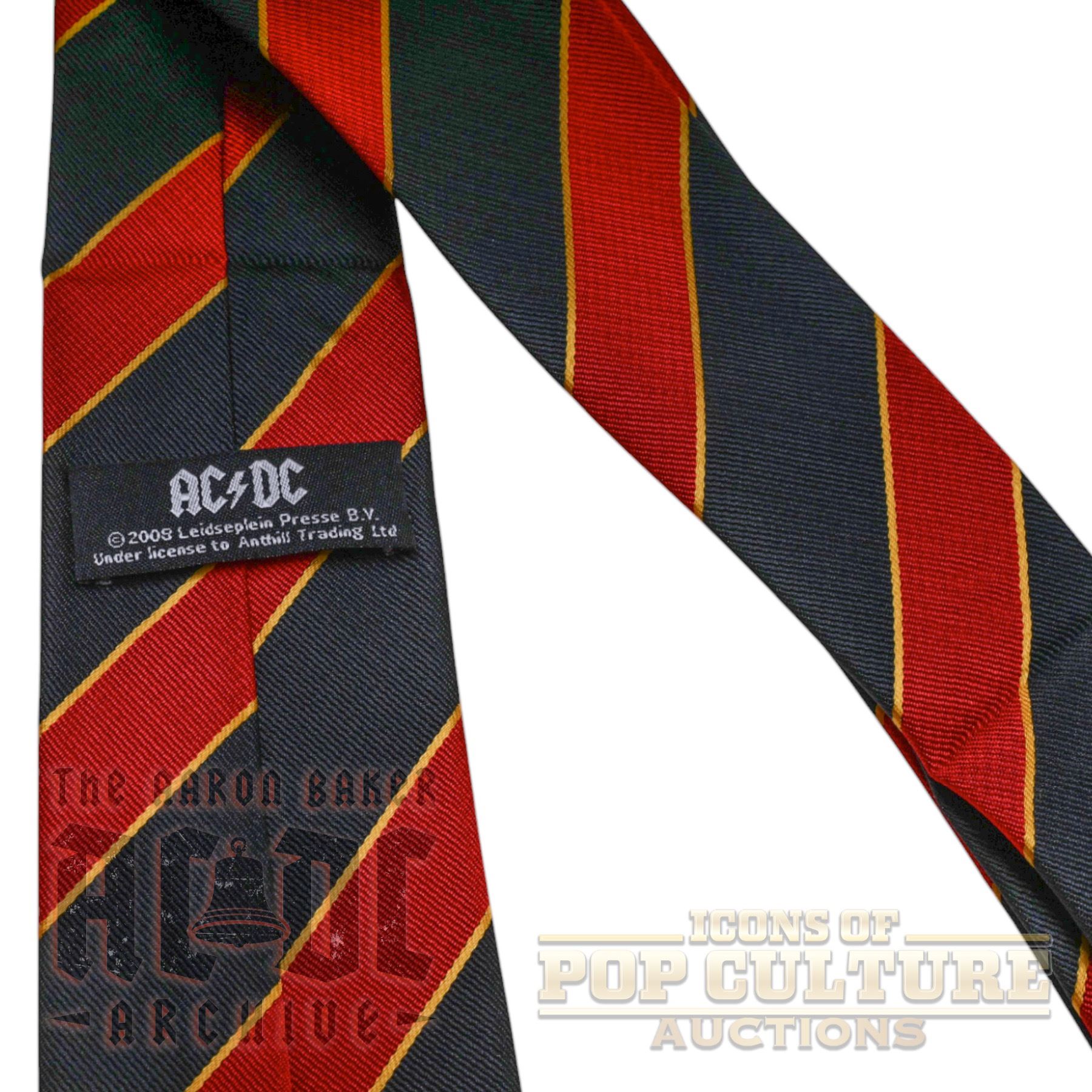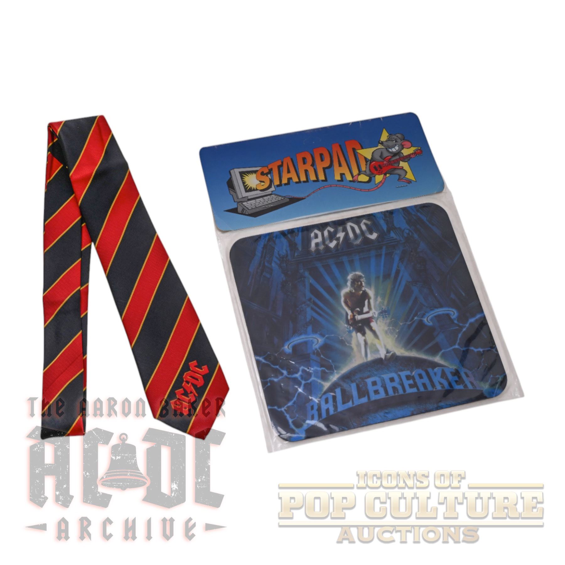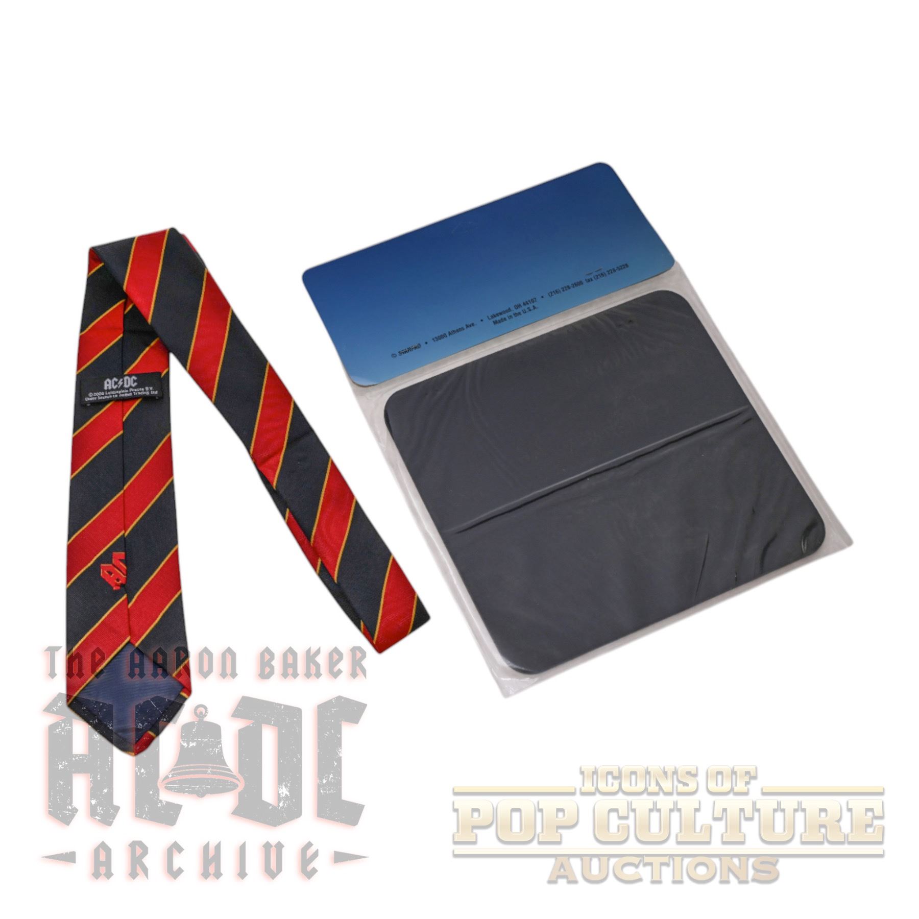 This lot includes two unique AC/DC collectibles. The first is an official AC/DC necktie with red and black stripes, featuring the band’s logo at the base. Produced under license in 2008, this tie was sold during the band’s Black Ice world tour, paying homage to Angus Young’s iconic schoolboy stage outfit. Also included is a factory-sealed mousepad featuring artwork from the Ballbreaker album, part of the licensed StarPad series. Together, these items highlight both AC/DC’s stage legacy and their wide range of officially licensed merchandise.
