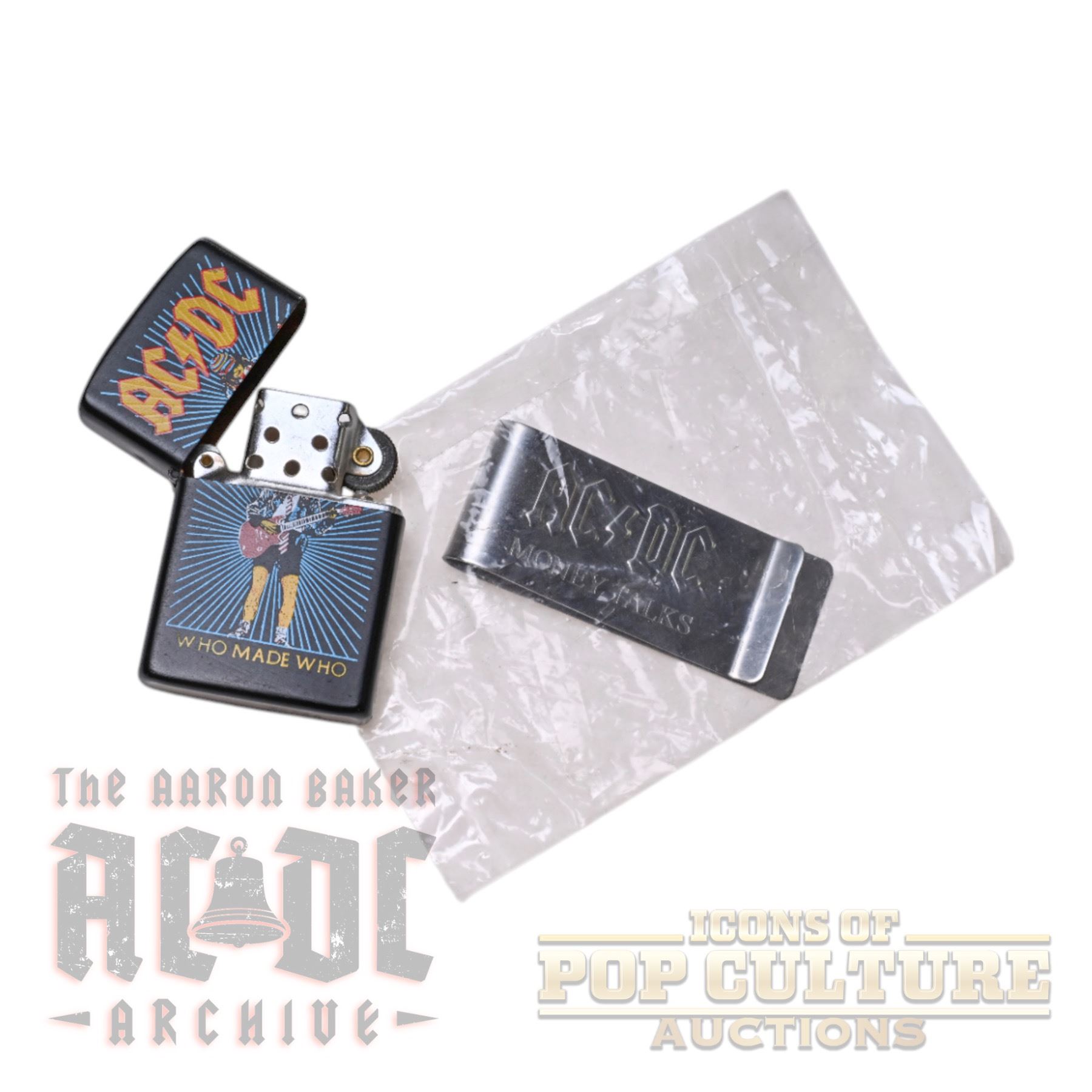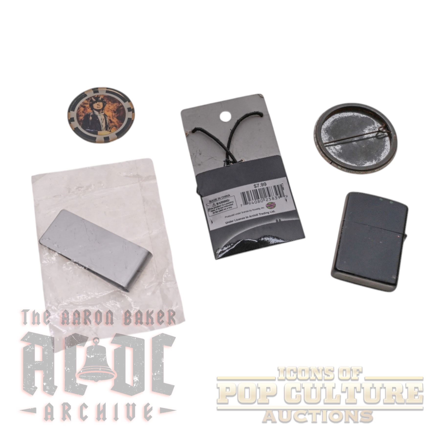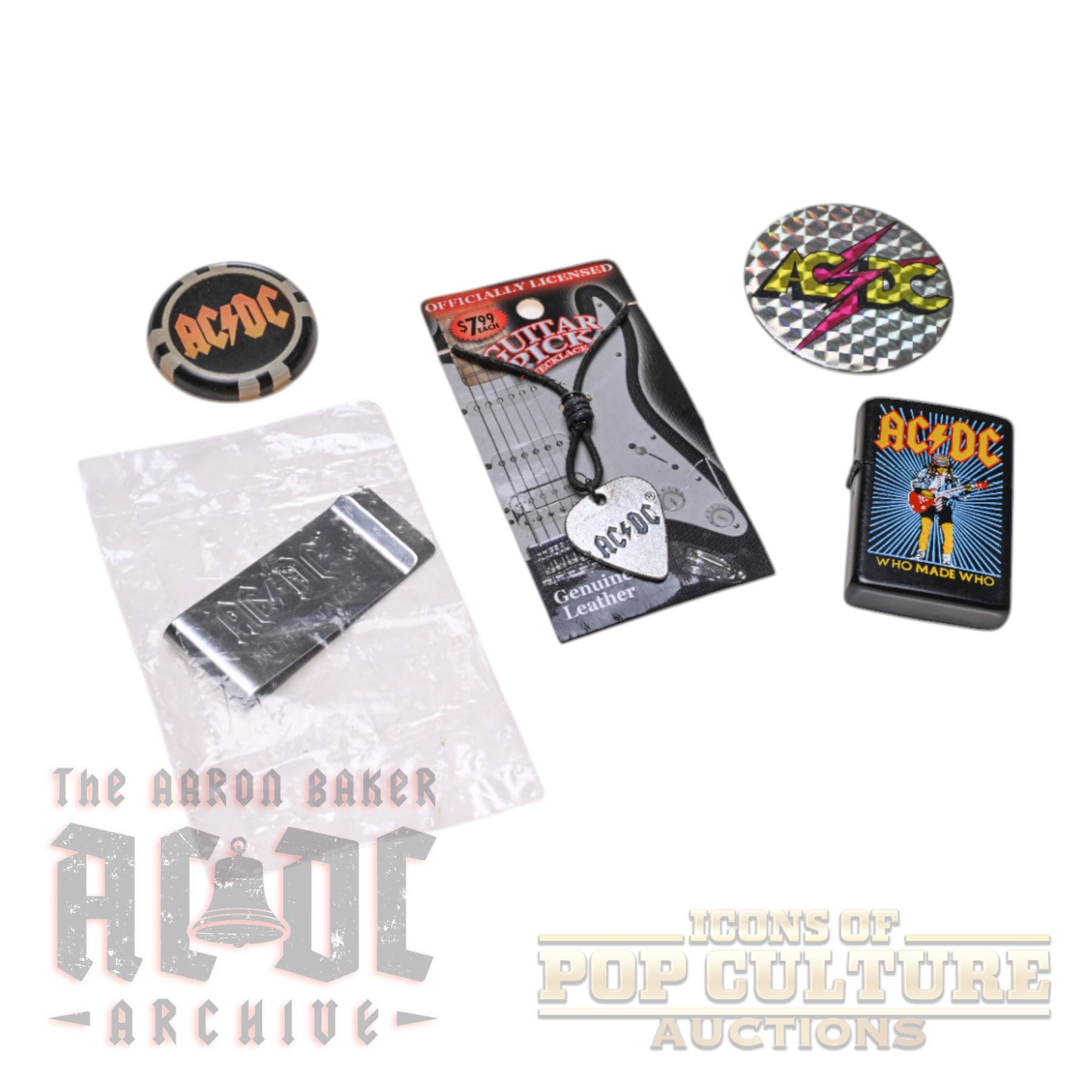 This collection of AC/DC merchandise includes a variety of unique items. Featured is a Who Made Who lighter with Angus Young artwork, a metal money clip engraved with “AC/DC Money Talks,” and a necklace with an AC/DC guitar pick pendant. Also included are two logo collectibles: a holographic pinback button and a custom poker chip featuring the AC/DC logo on one side and Angus Young on the reverse. A varied and distinctive grouping of accessories and memorabilia celebrating the band.
