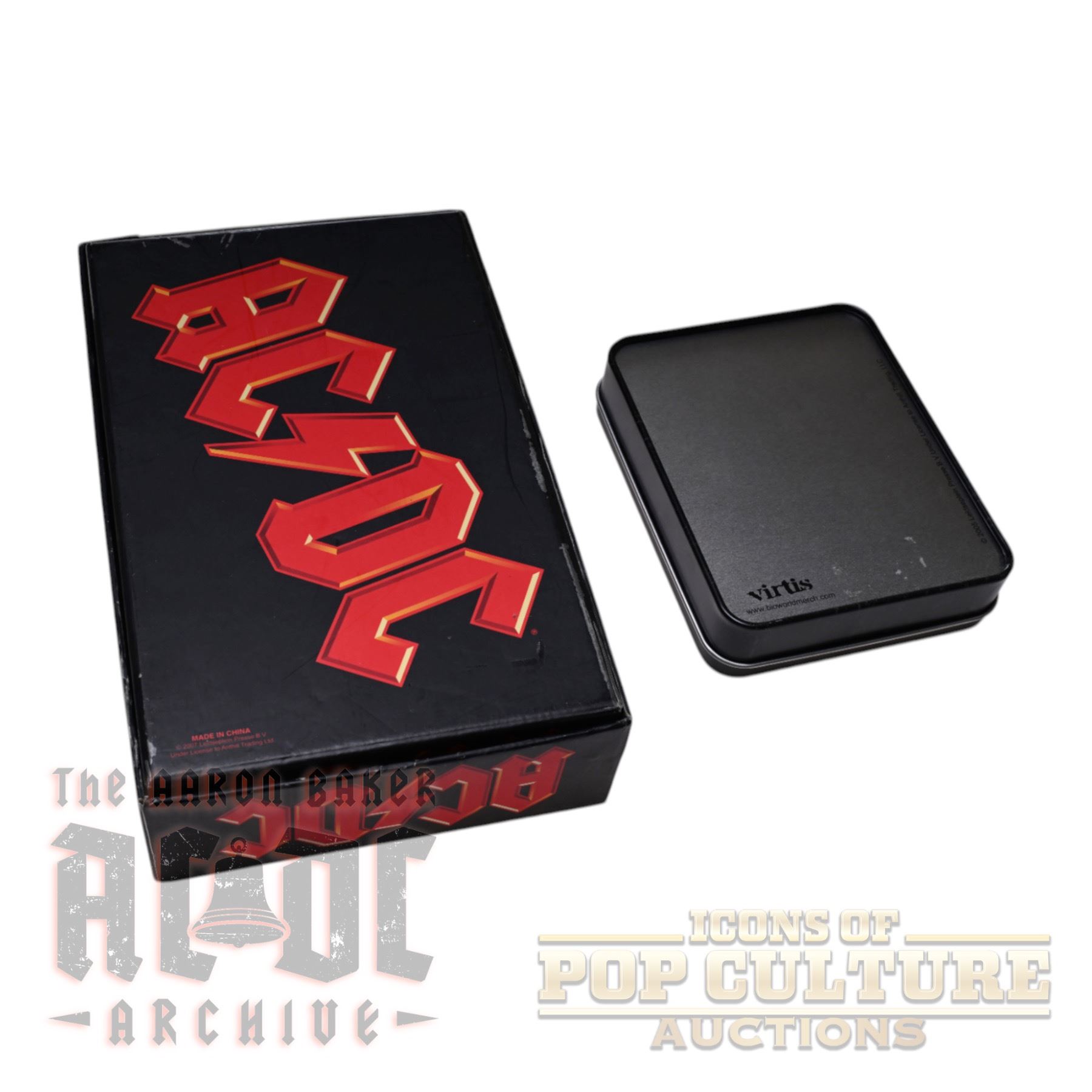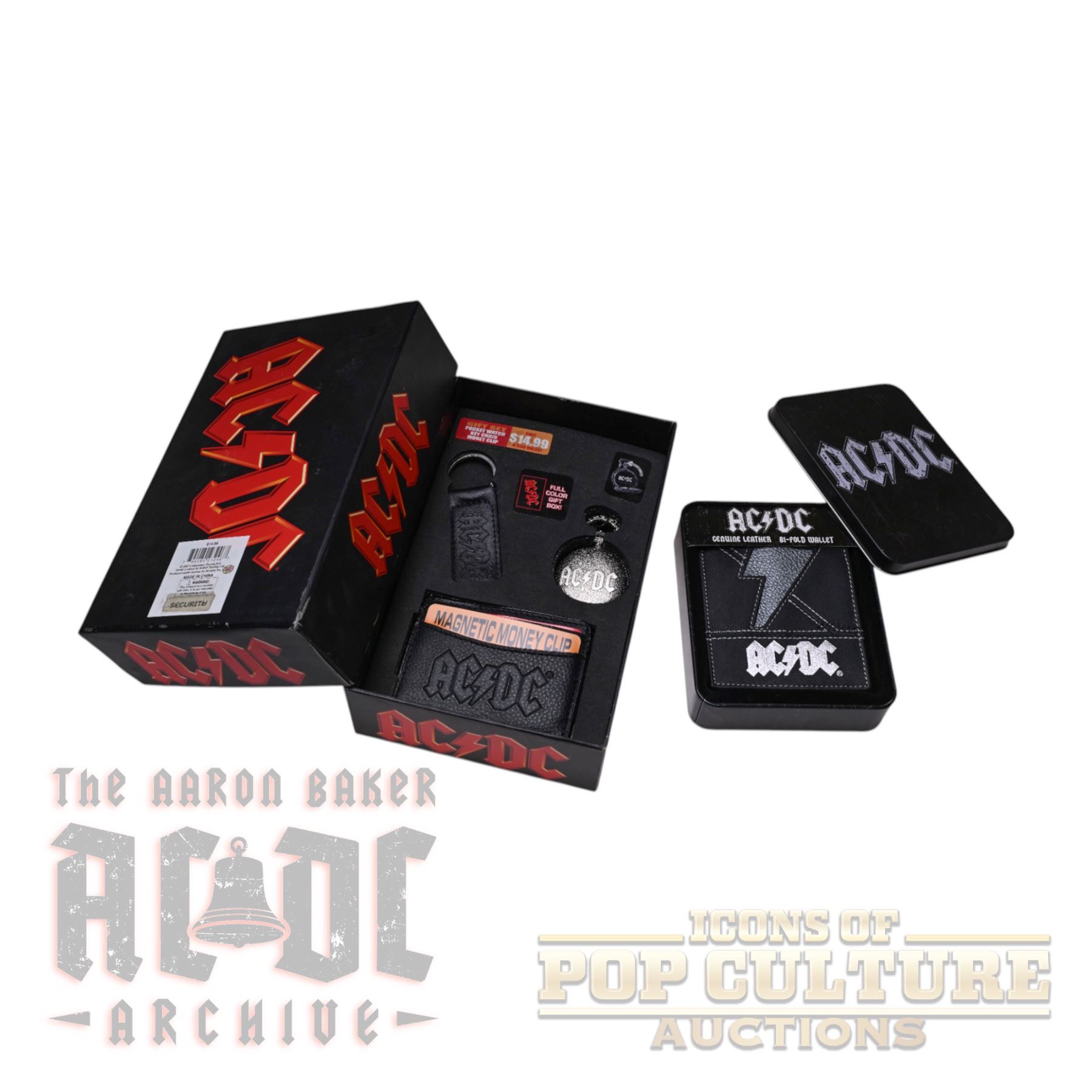 Featured here are two boxed AC/DC merchandise sets. The first is a collector’s gift set containing multiple branded items, including a keychain, button, leather key fob, money clip, and other accessories, all housed in a custom AC/DC logo box. The second is a tin box set featuring a genuine leather bi-fold wallet decorated with the AC/DC lightning bolt logo. Both sets highlight officially licensed AC/DC merchandise, offering a mix of practical items and collectibles for fans of the band.