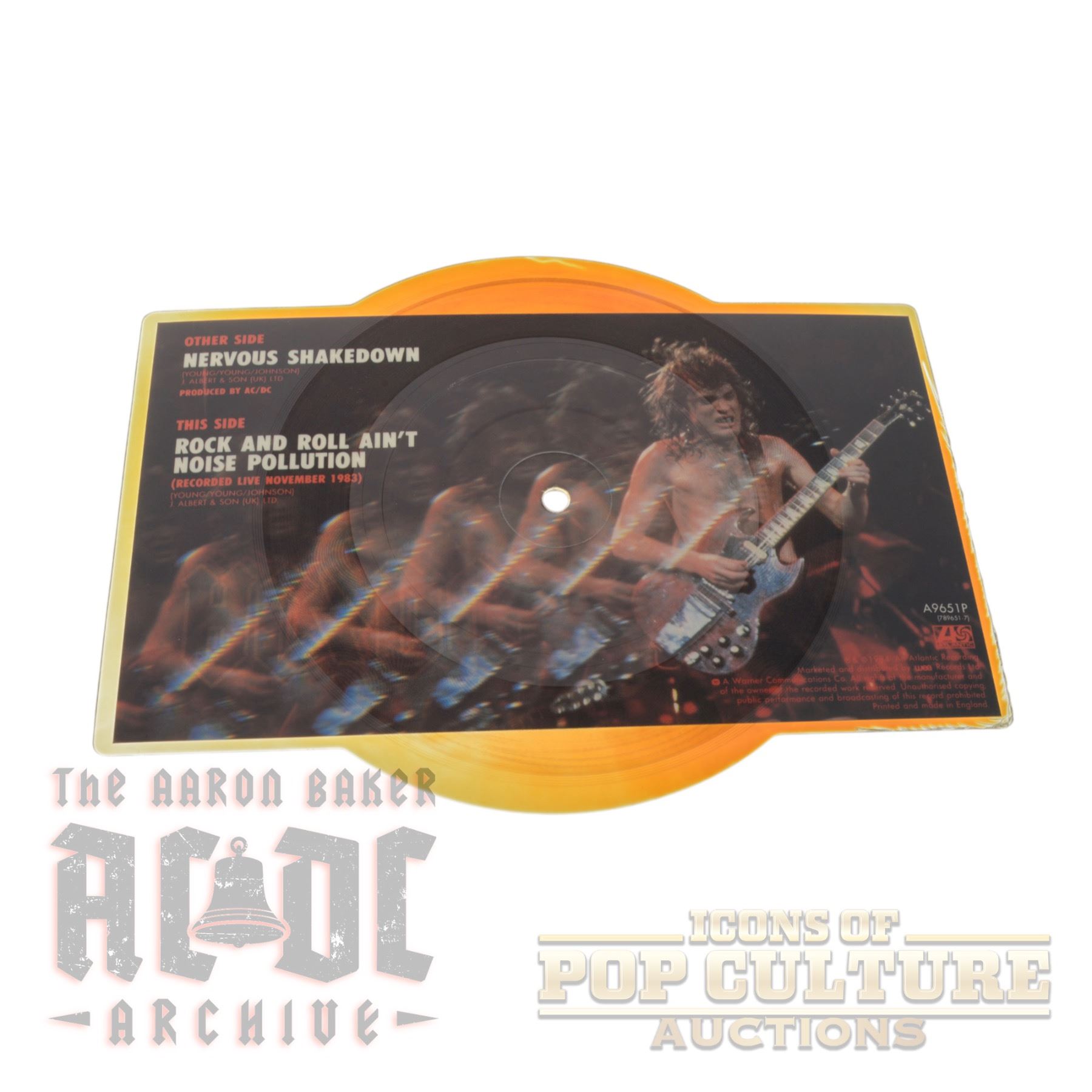 Offered here is a striking UK-shaped 7" picture disc from AC/DC, released in 1984 under the catalog number A9651P on Atlantic Records. This limited edition features “Nervous Shakedown” on one side and a live version of “Rock and Roll Ain’t Noise Pollution,” recorded in November 1983, on the reverse.