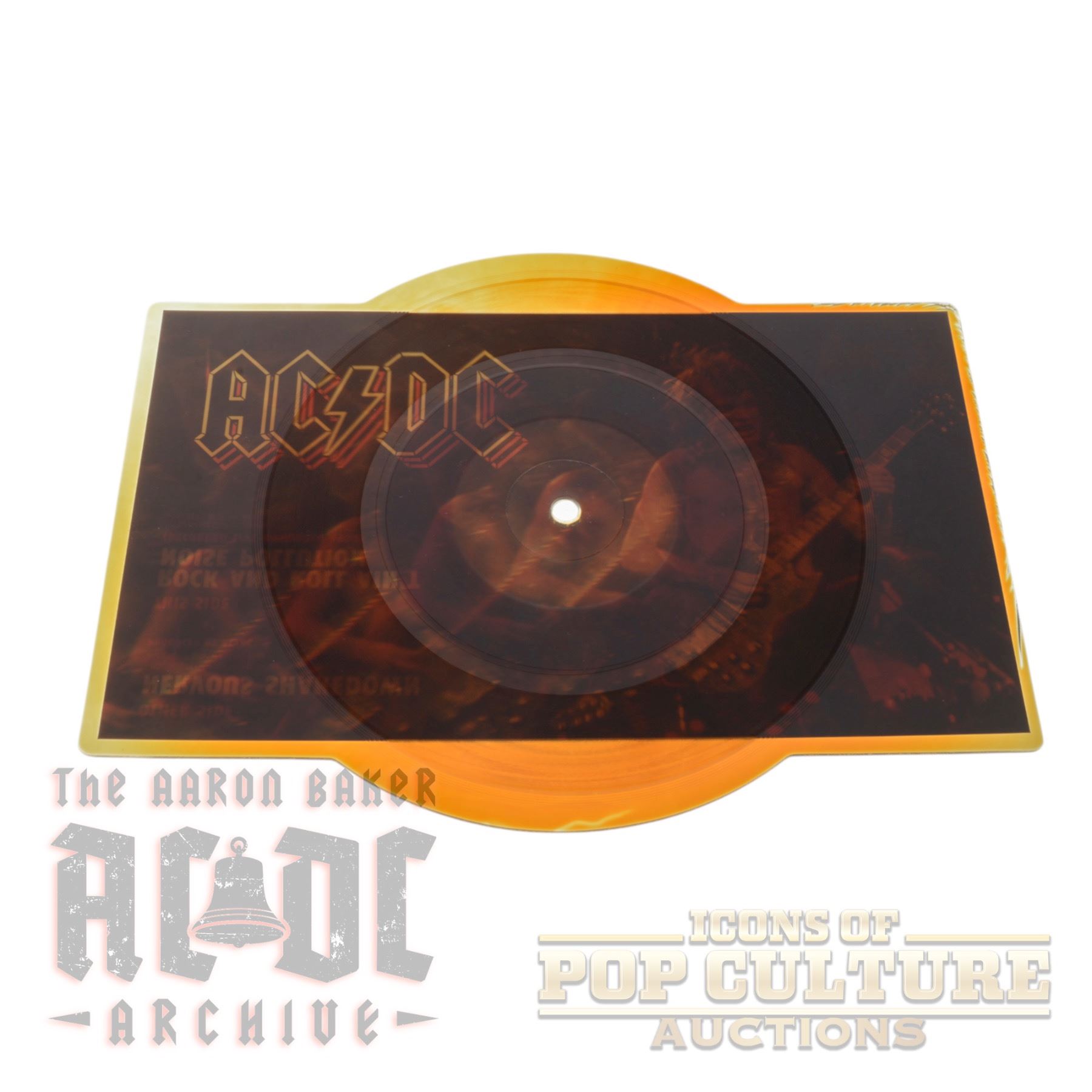 The disc is pressed in translucent orange vinyl and cut into a bold rectangular shape with a circular playing area. One side showcases a powerful multi-exposure image of Angus Young in action, while the flip side features the iconic AC/DC logo.