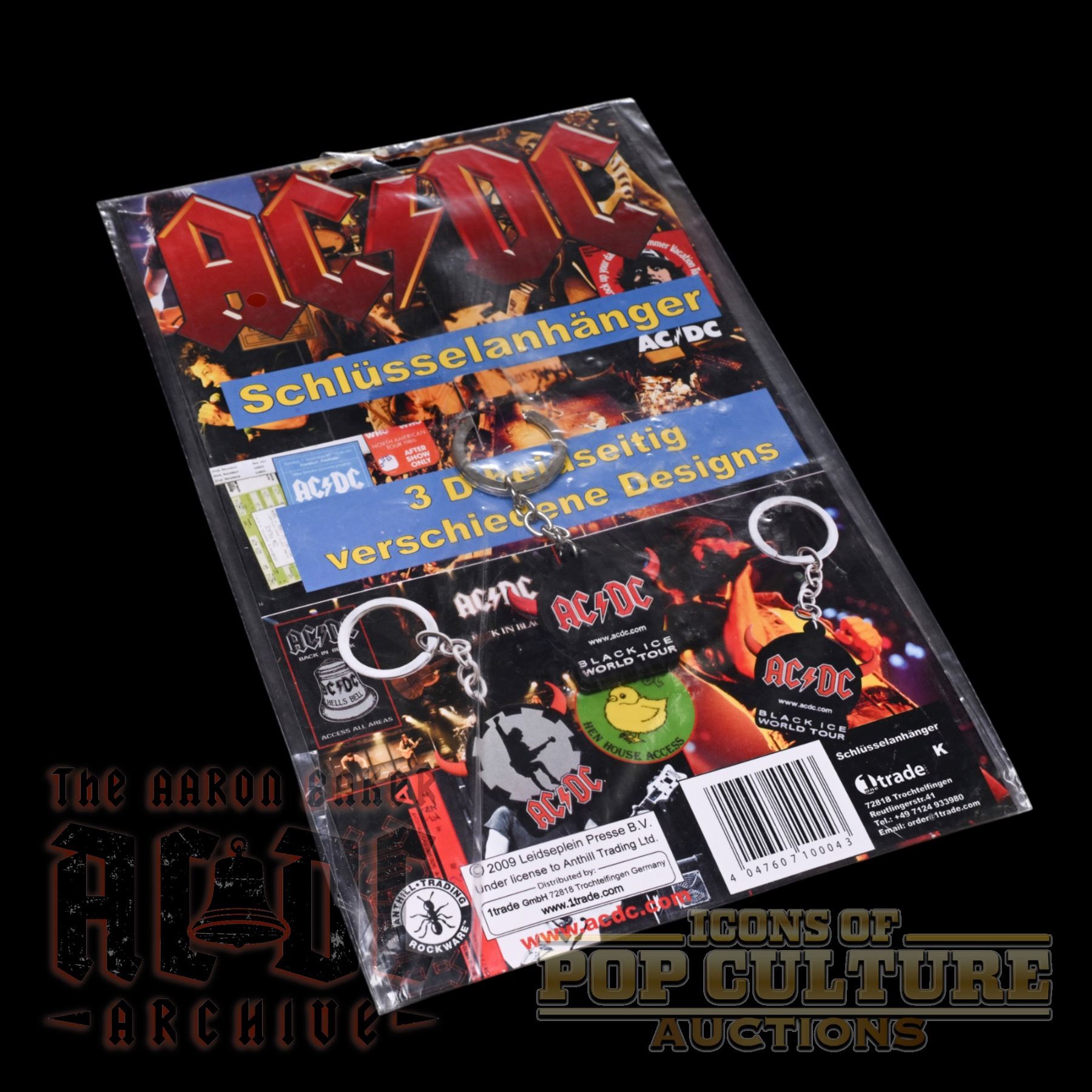 This is an officially licensed AC/DC keychain presented in its original 11" x 6.5" retail packaging. Produced in 2009 under license from Leidseplein Presse B.V. and Anthill Trading Ltd., the release featured three different double-sided designs, each sold separately. This package contains one of the three official AC/DC keychains, with artwork connected to the band’s Black Ice World Tour. The packaging highlights the keychain design along with bold AC/DC graphics and the official authenticity mark, making it both a collectible display item and a functional accessory for fans of the band.