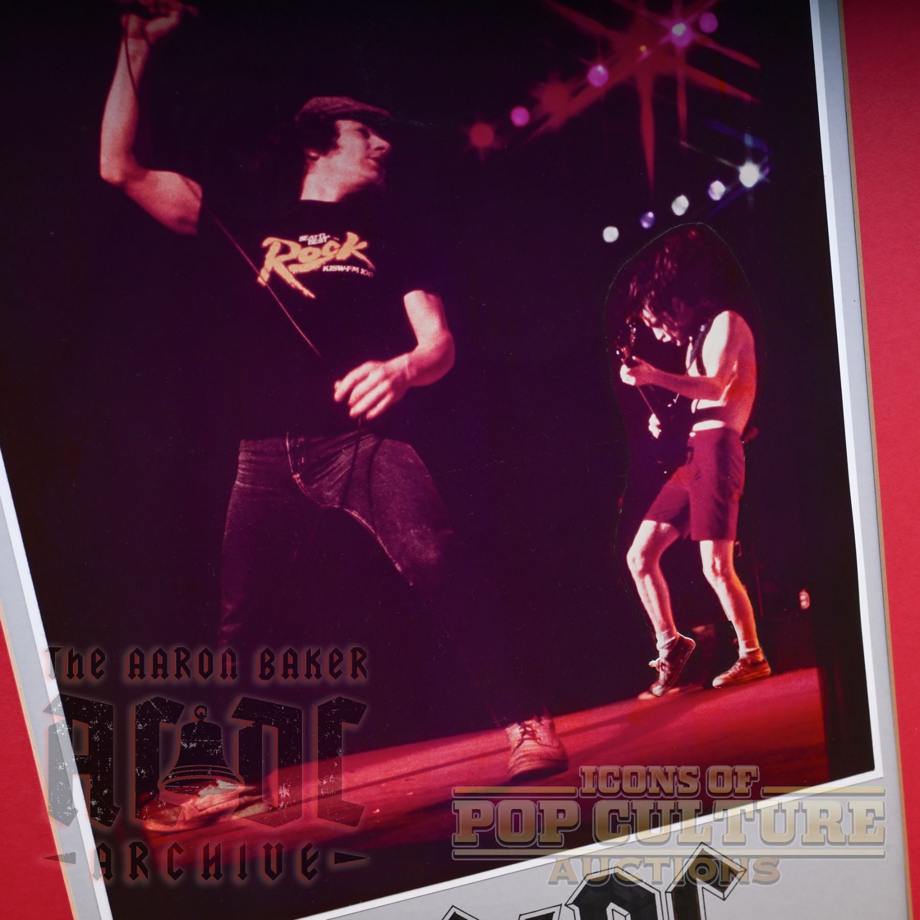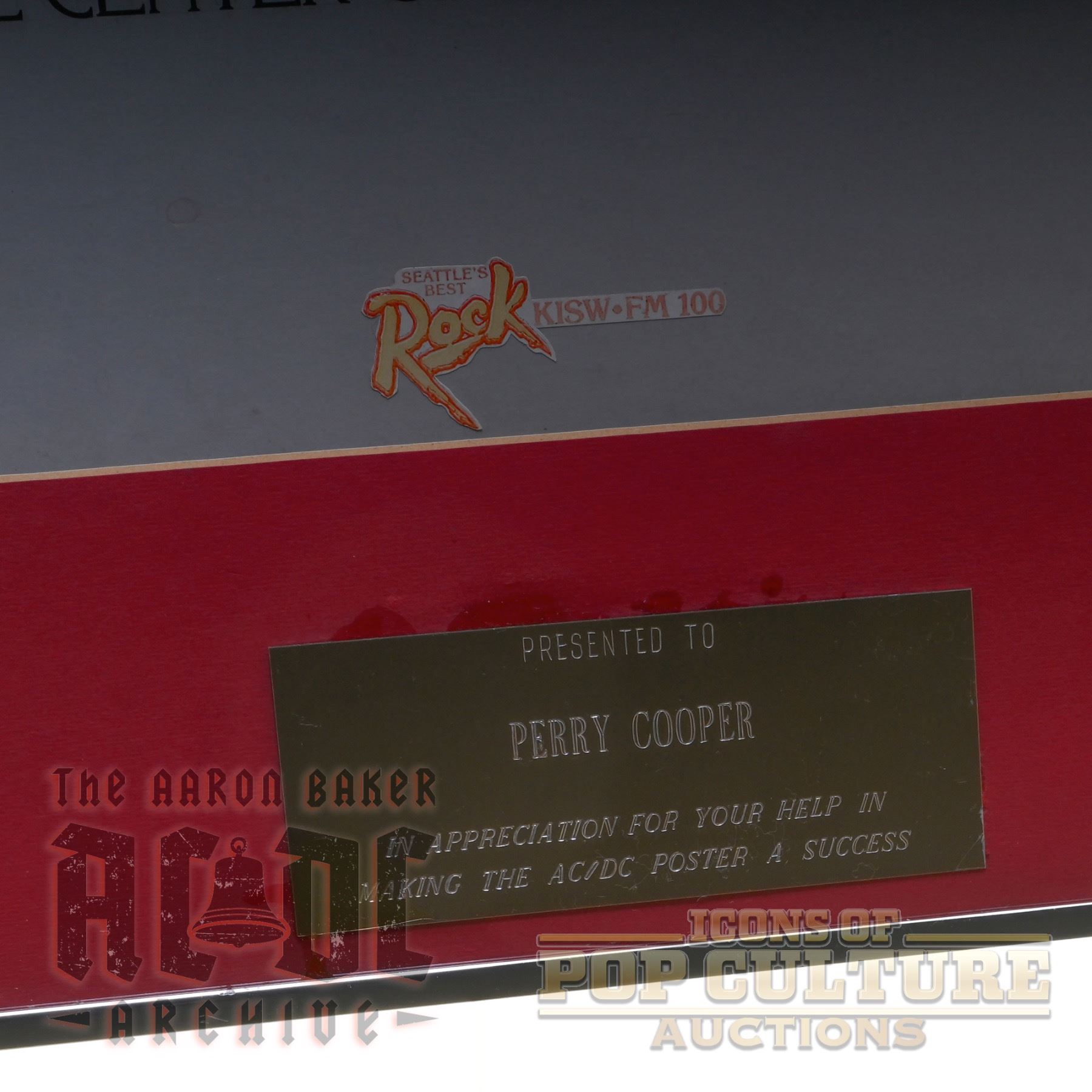 Offered here is a unique, one-of-a-kind mock-up concert poster for AC/DC’s February 9, 10, and 11, 1982 performances at the Seattle Center Coliseum. The poster itself measures 21.25" x 12", while the overall frame measures 17.75" x 28". This striking piece features a live stage image of Brian Johnson with an added cut-out and applied image of Angus Young, a hand-colored AC/DC logo, and the applied logo of Seattle’s KISW radio station. Created in the era before digital design tools, this mock-up represents the hands-on graphic design methods of the time, when cut-and-paste techniques were used to build promotional artwork. Adding to its uniqueness, the piece was formally presented to Perry Cooper in appreciation for his help in making the AC/DC poster a success.