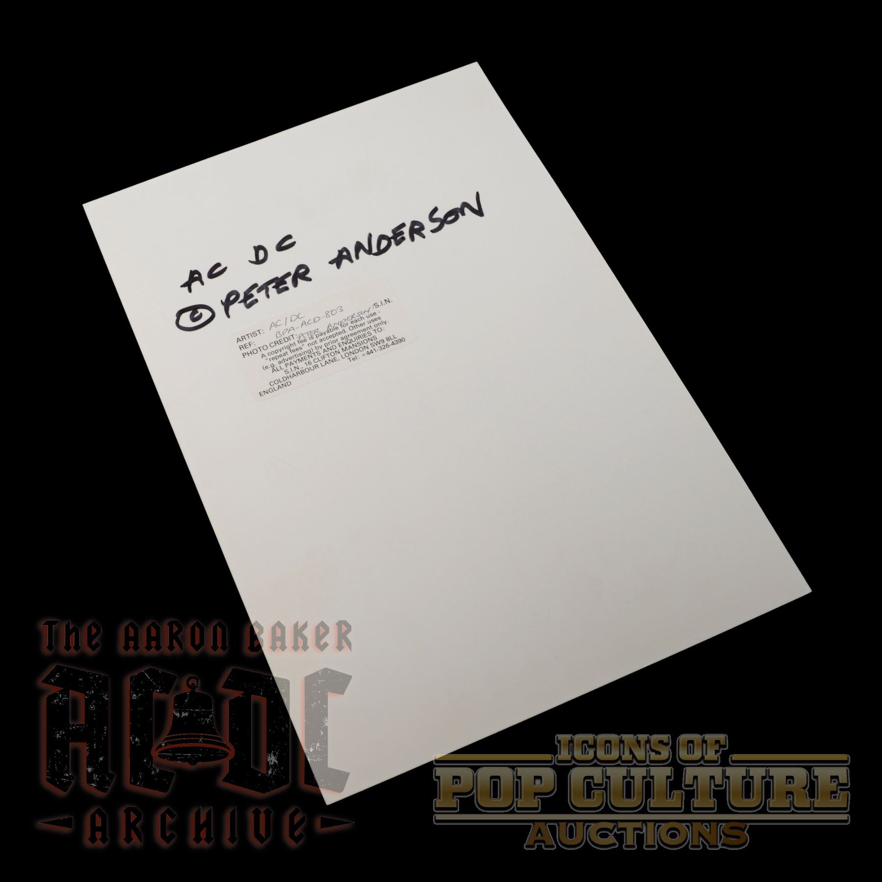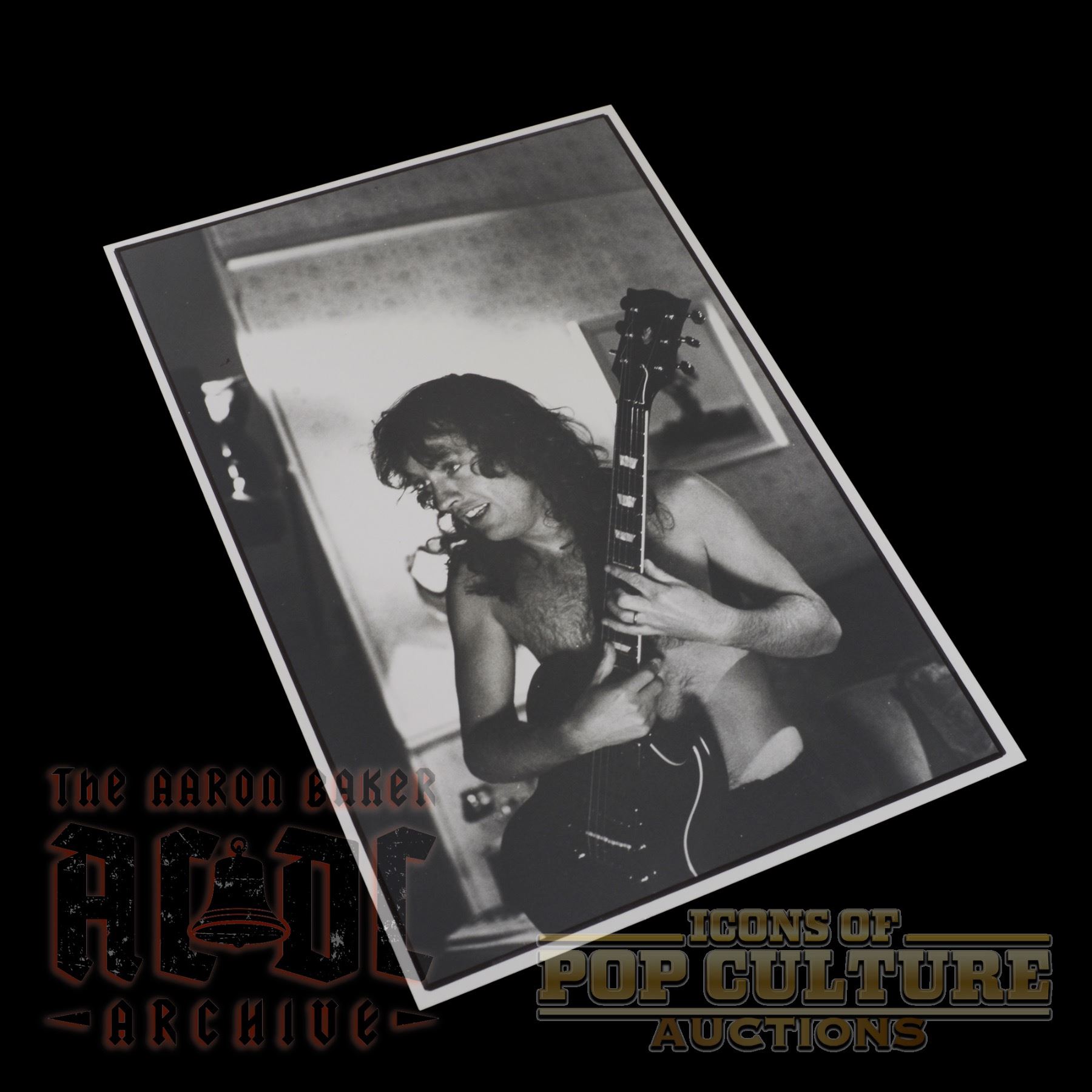 This stunning 6.75" x 10" black-and-white photograph captures Angus Young, the iconic lead guitarist of AC/DC, in a strikingly intimate and raw portrait. Photographed by acclaimed rock photographer Peter Anderson, the image shows Angus shirtless, clutching his Gibson SG, embodying the gritty, no-frills essence of rock ‘n’ roll.