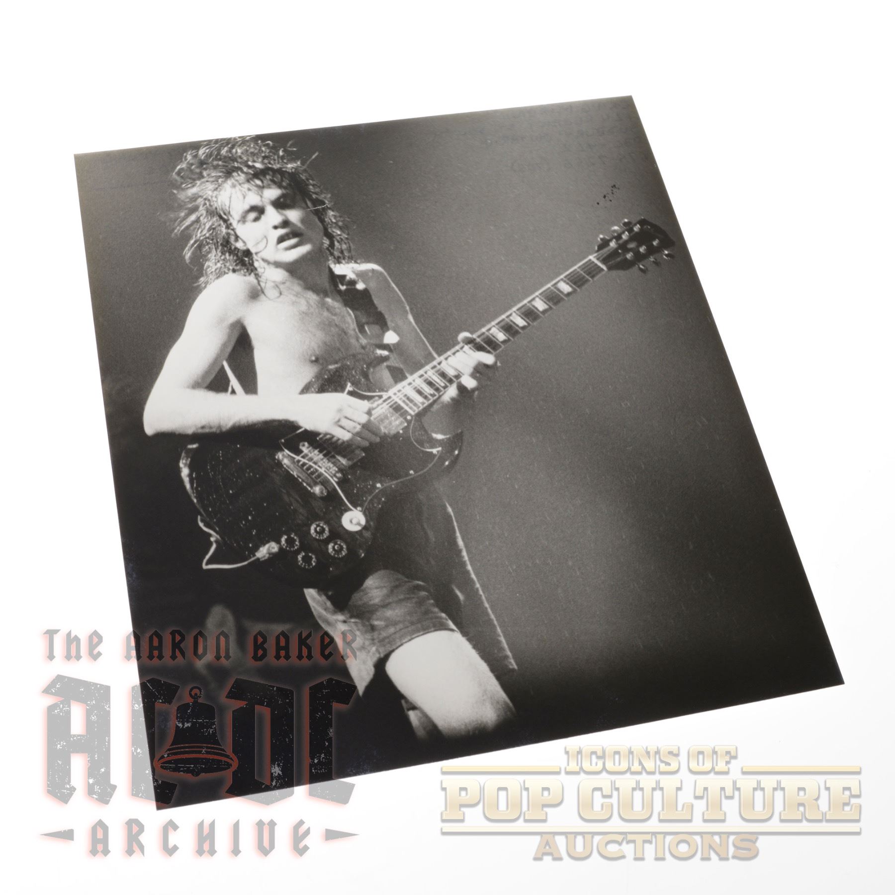 This is an original 8" x 9" black-and-white photograph of Angus Young, the legendary lead guitarist of AC/DC, captured mid-performance in his signature high-voltage style. Shirtless and in motion, Angus wields his Gibson SG with the unrelenting energy that has made him one of rock’s most iconic performers.