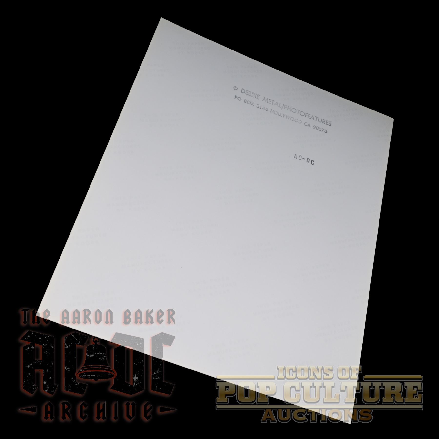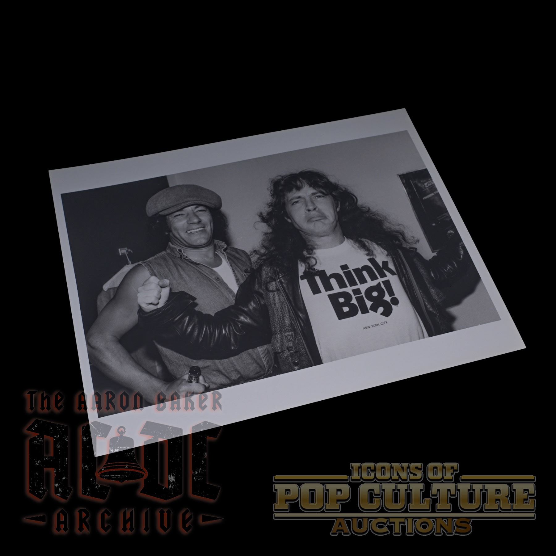 Presented here is an original 8" x 10" black-and-white photograph featuring AC/DC’s Brian Johnson and Angus Young backstage. The candid image captures Johnson smiling in his signature flat cap while Angus stands beside him in a “Think Big!” shirt and leather jacket. The reverse of the photo is stamped by Deddie Metal/Photo Features, Hollywood, CA, identifying it as an authentic archival photograph. A classic piece of AC/DC history showcasing two of the band’s most iconic members off stage.