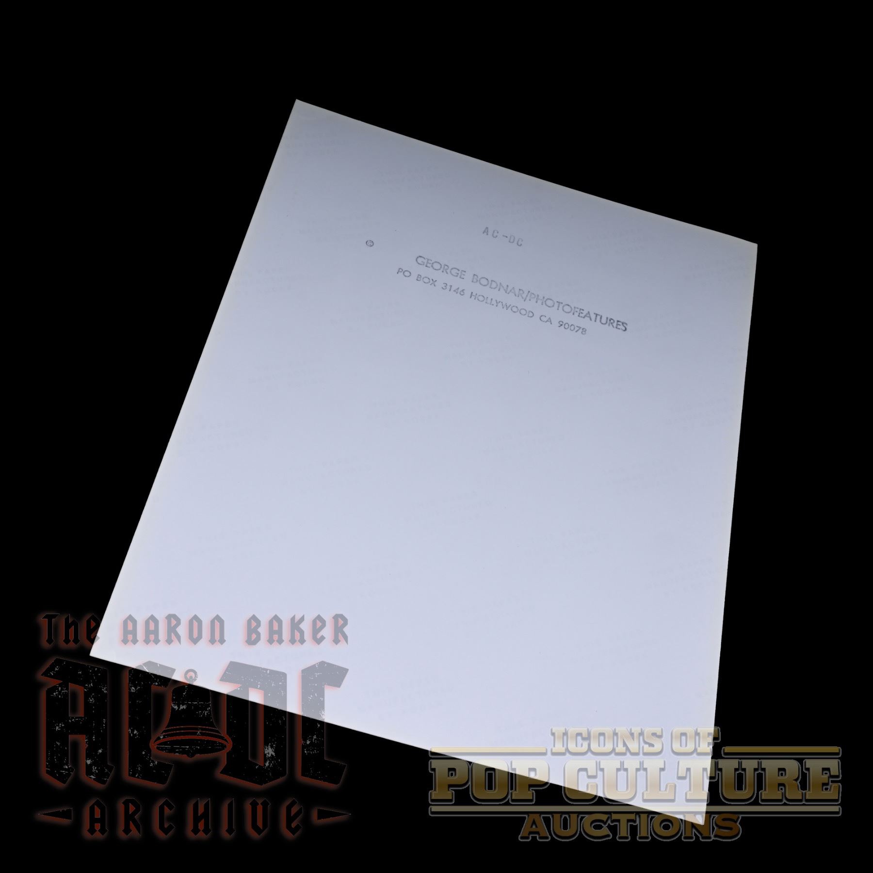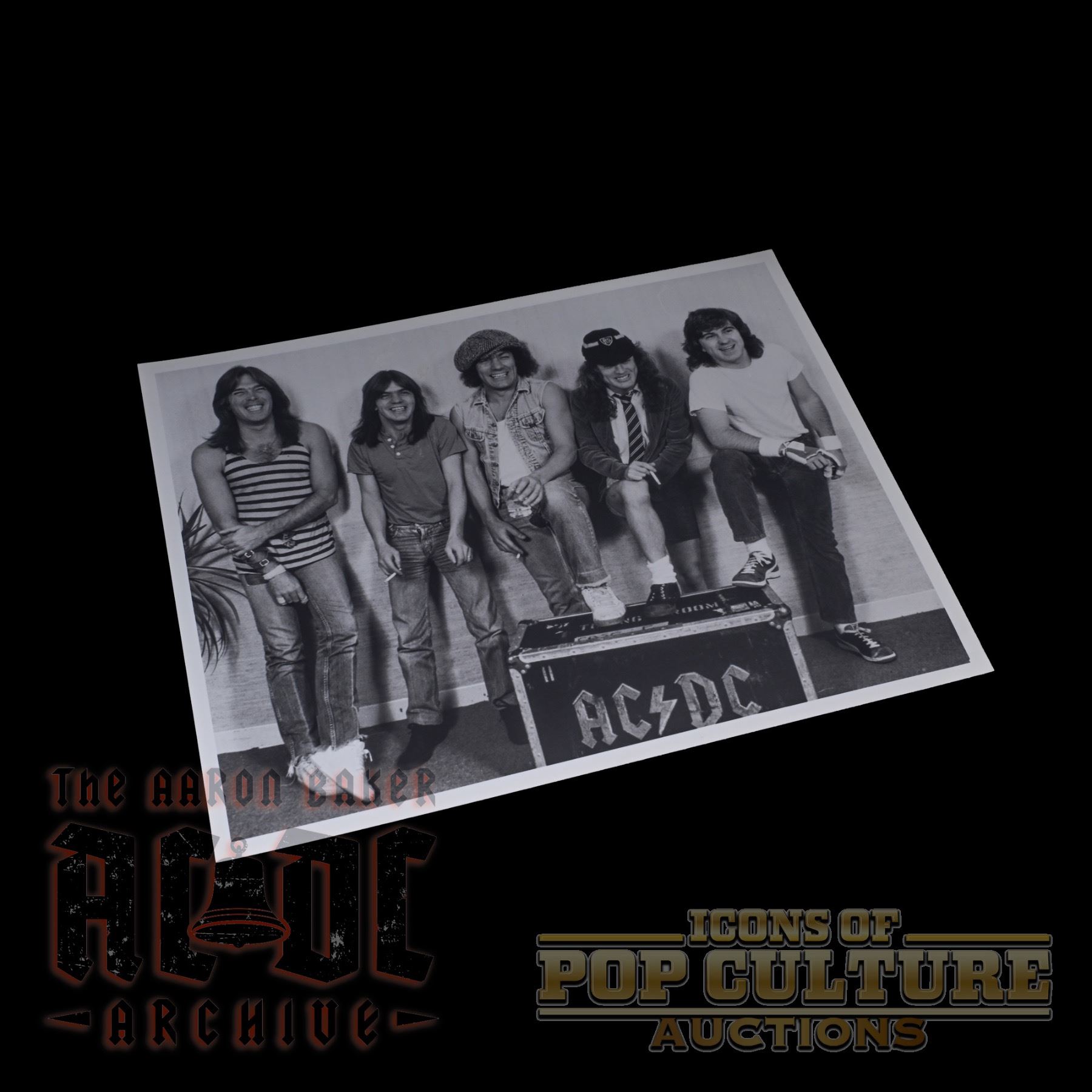 This original 8" x 10" black-and-white photograph captures AC/DC backstage during their Fly on the Wall tour era. The band is shown standing together behind a tour road case stenciled with the AC/DC logo, presenting a relaxed yet powerful group shot. The reverse of the photo is stamped “George Bodnar/Photofeatures,” confirming it as an authentic archival photograph. A striking image from the mid-1980s that highlights the band during a unique chapter of their career.