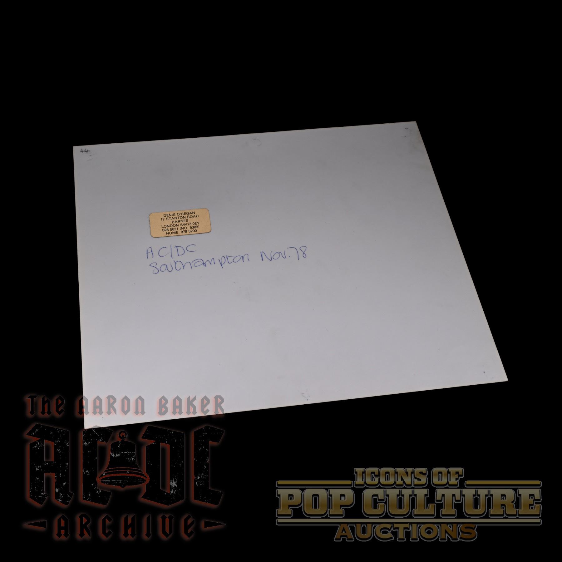 This original 8" x 10" black-and-white photograph captures Bon Scott and Malcolm Young of AC/DC relaxing backstage in Southampton, November 1978. The candid image shows Scott seated on the arm of a couch while Malcolm sits nearby, offering a rare behind-the-scenes glimpse of the band during the Bon Scott era. The reverse side is marked with the date and location and includes the credit sticker for photographer Denis O’Regan, known for documenting many iconic rock acts. A scarce and authentic piece of AC/DC history from their late 1970s touring years.