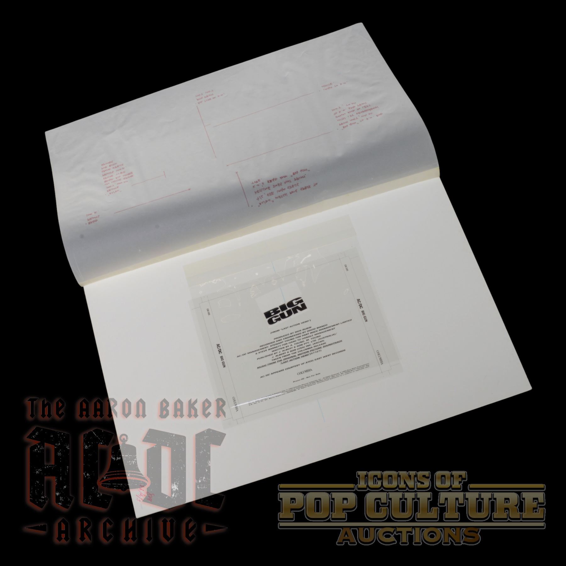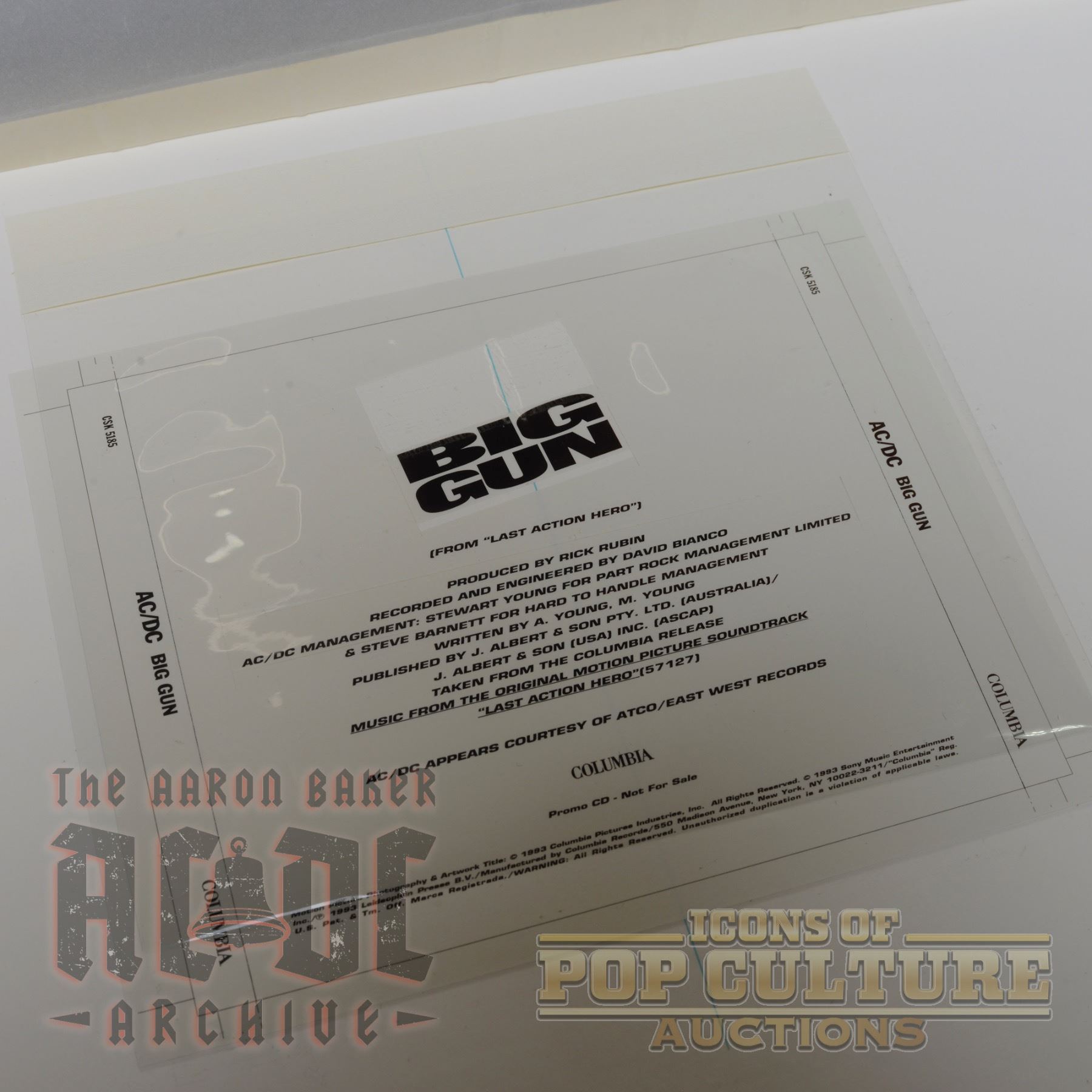 Presented here is a rare original 15" x 10" production mechanical proof for the CD single release of AC/DC's 1993 track “Big Gun,” recorded for the Last Action Hero soundtrack. This detailed layout was used by Columbia Records in finalizing the rear cover artwork for the promotional CD. Featuring the full printed design elements on acetate film over a white board backing, the proof includes hand-written production notes and alignment guides for typography and layout adjustments, offering a behind-the-scenes look into the physical design process before digital workflows took over.