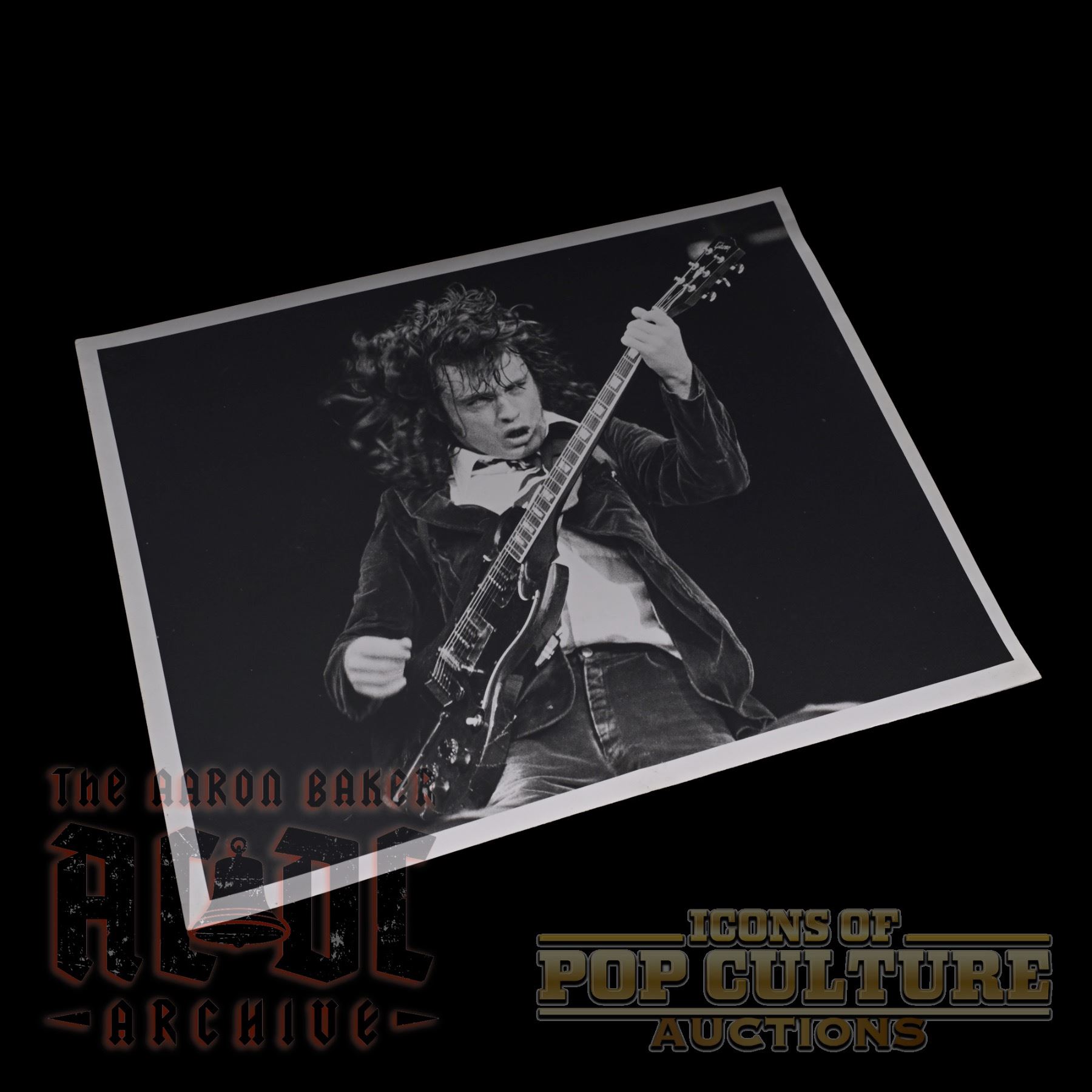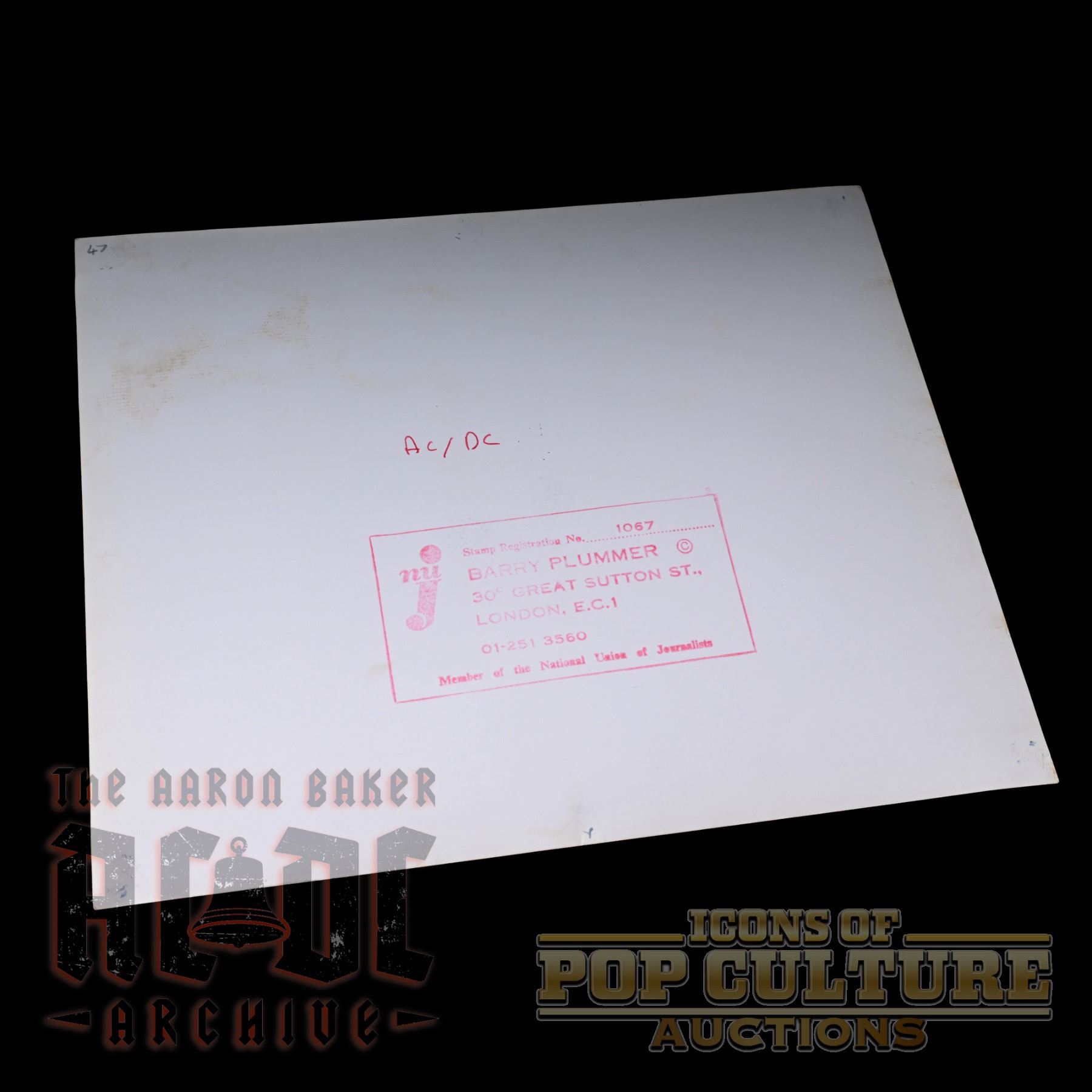 This original 8" x 10" black-and-white photograph captures Angus Young of AC/DC performing live on stage in his signature schoolboy outfit, mid-performance with his Gibson SG guitar. The reverse side bears the photographer’s stamp from Barry Plummer of London, a noted rock photographer and member of the National Union of Journalists. This striking image is a genuine vintage print and a rare piece of AC/DC history, showcasing Angus Young’s iconic stage presence.
