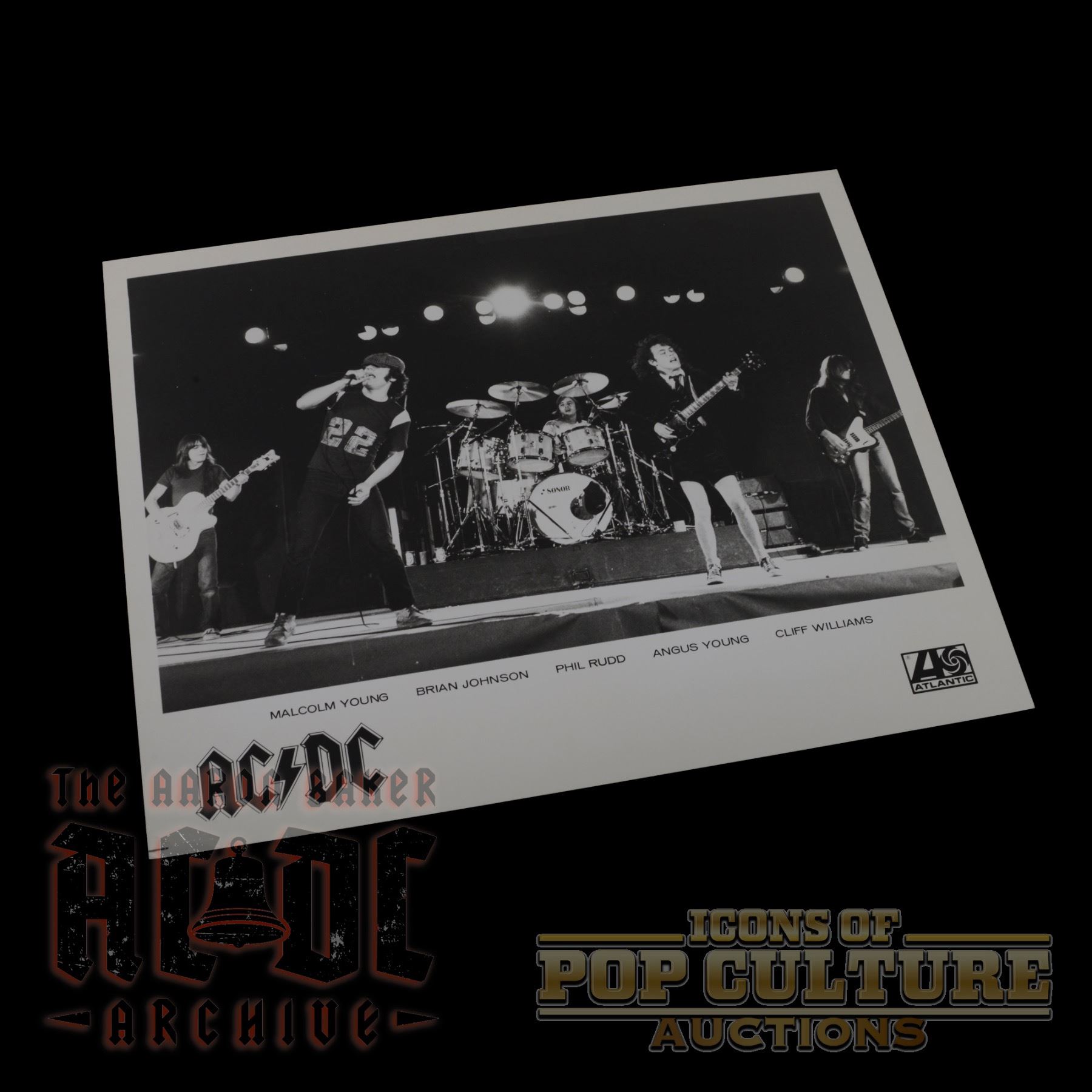 A rare and authentic 8" x 10" black-and-white press photo featuring the legendary rock band AC/DC, taken during the filming of the first videos with Brian Johnson following the release of Back in Black. This classic promotional image showcases the iconic lineup, including, from left to right, Malcolm Young, Brian Johnson, Phil Rudd, Angus Young, and Cliff Williams. The photo’s border features the Atlantic Records and AC/DC logos printed in bold black along the bottom edge.