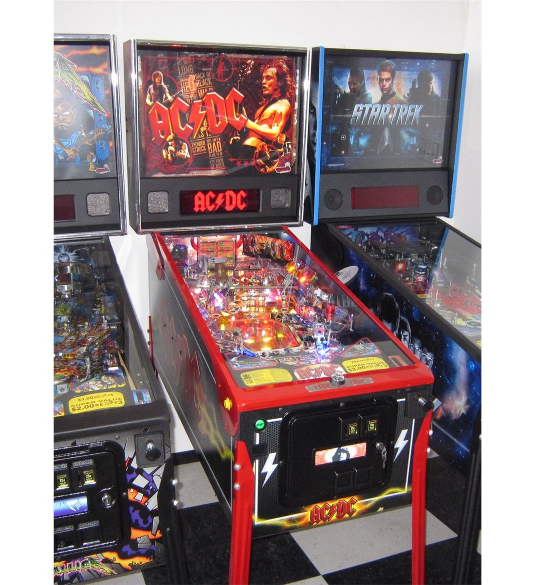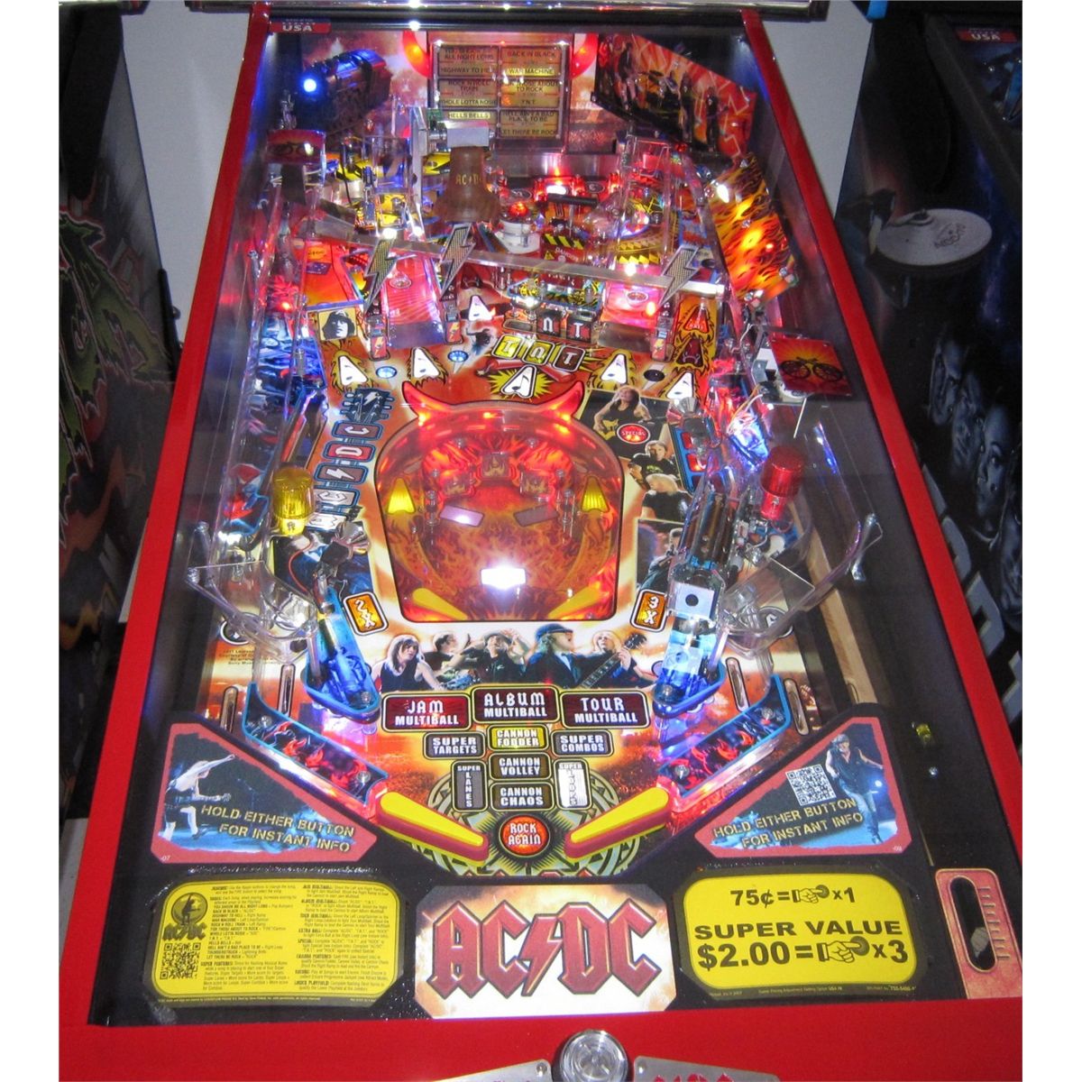 AC/DC Premium Model-- Additional Features: “Underworld” Lower Mini-Playfield W/2 Flippers and Targets Hells Bell Swinging Newton Ball Pendulum W/Score Sensor Hidden Magnet Pendulum Attractor To Start Bell Swinging Remotely Molded 3D "Rock N Roll" Train With LED Headlight and Horns 5 Bank AC/DC Drop Targets (on left) 3 Bank T.N.T. Drop Targets (in center) SLAM Action Target Behind Center TNT Drop Target Crossover Ball Track w/Diverter From Left Ramp To Right Ramp T.N.T. Detonator Animated W/Solenoid Actuated Handle Animated Band Member Display “Highway To Hell” Animated LED Flames Tunnel “Back In Black” Super Bright LED Strobe Lights Wedge-Based LED GIs LED Control Lamps including 16 Tri-Color LEDs Under Key Inserts Classic Lock Down Asssembly and Playfield Slide Supports Unique Backglass Translite Red Gloss Power Coated Legs, Hinges, Front Molding, and Side Armour with Flipper Button Protection