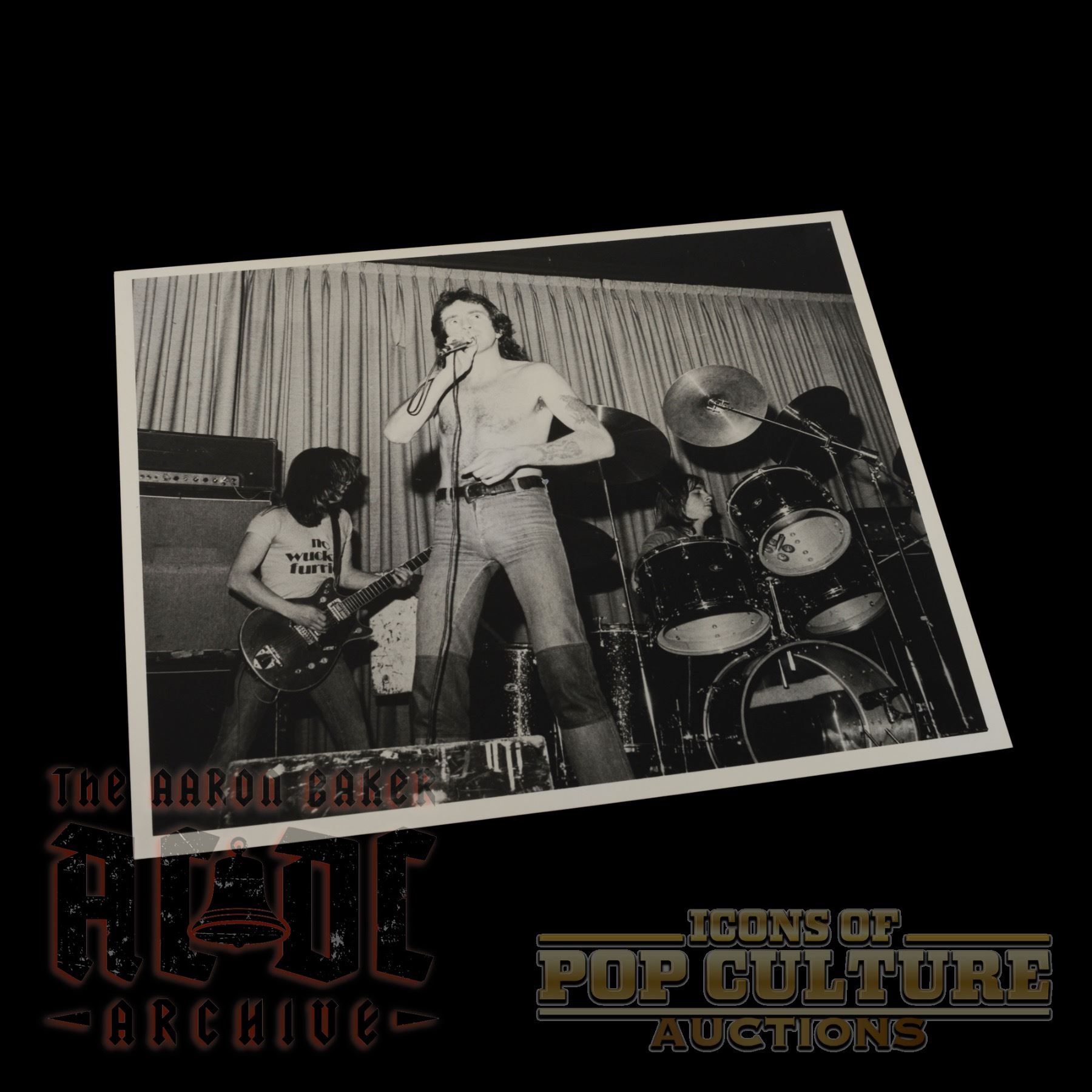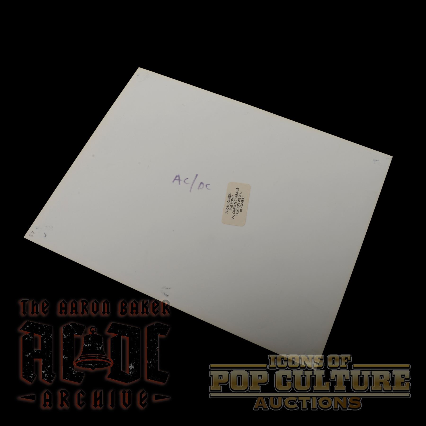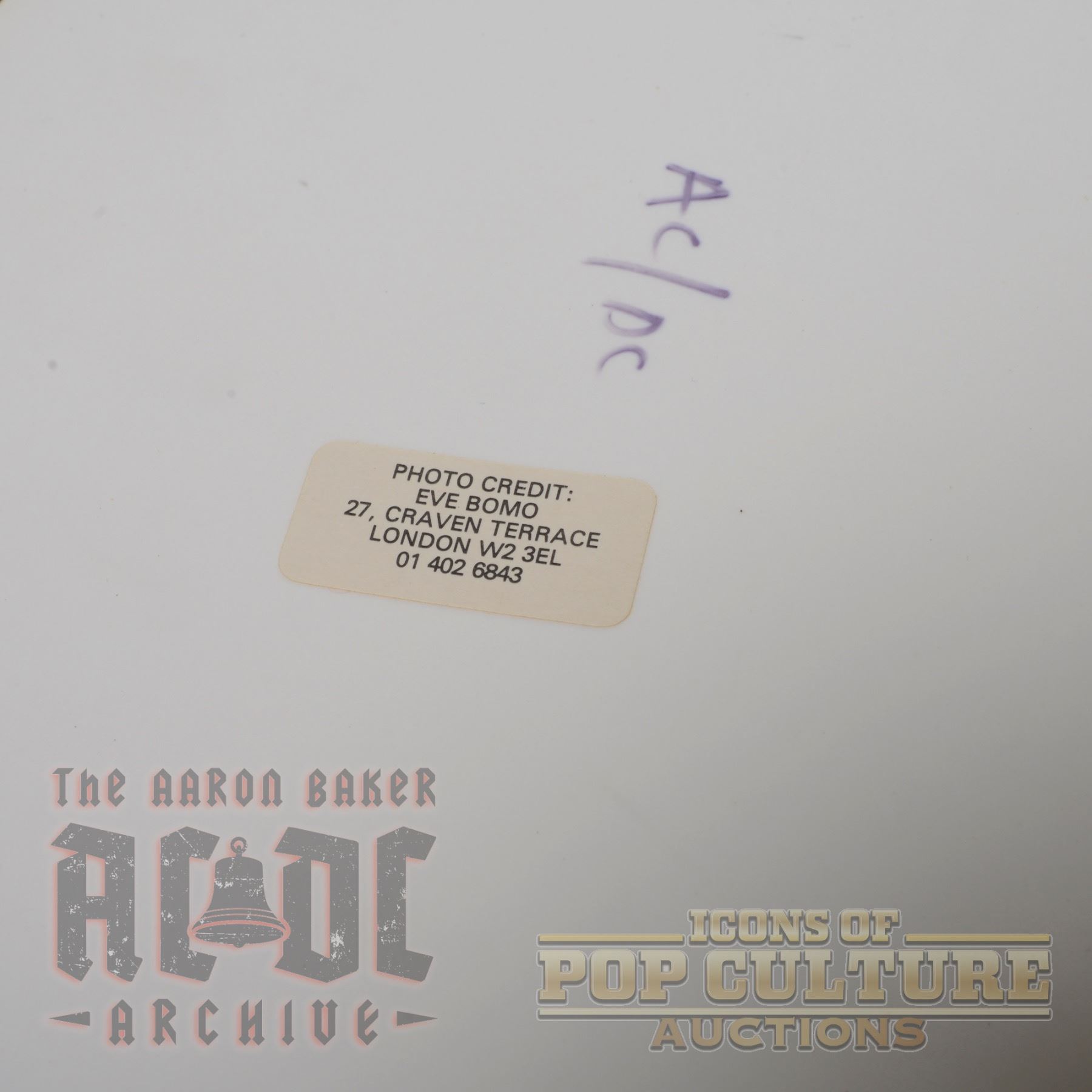 This striking 8" x 10" black-and-white photographic print by noted rock photographer Eve Bomo captures AC/DC delivering an electrifying live performance during the Bon Scott era. Front and center, Bon Scott commands the stage shirtless, gripping the microphone mid-vocal, while Malcolm Young drives the rhythm on guitar and Phil Rudd holds steady behind the drum kit. The intimate composition, framed against a simple curtain backdrop, channels the raw energy and unfiltered grit of the band’s early years. The reverse bears the photographer’s credit label, “Eve Bomo, 27 Craven Terrace, London,” adding provenance to this powerful image from rock history.