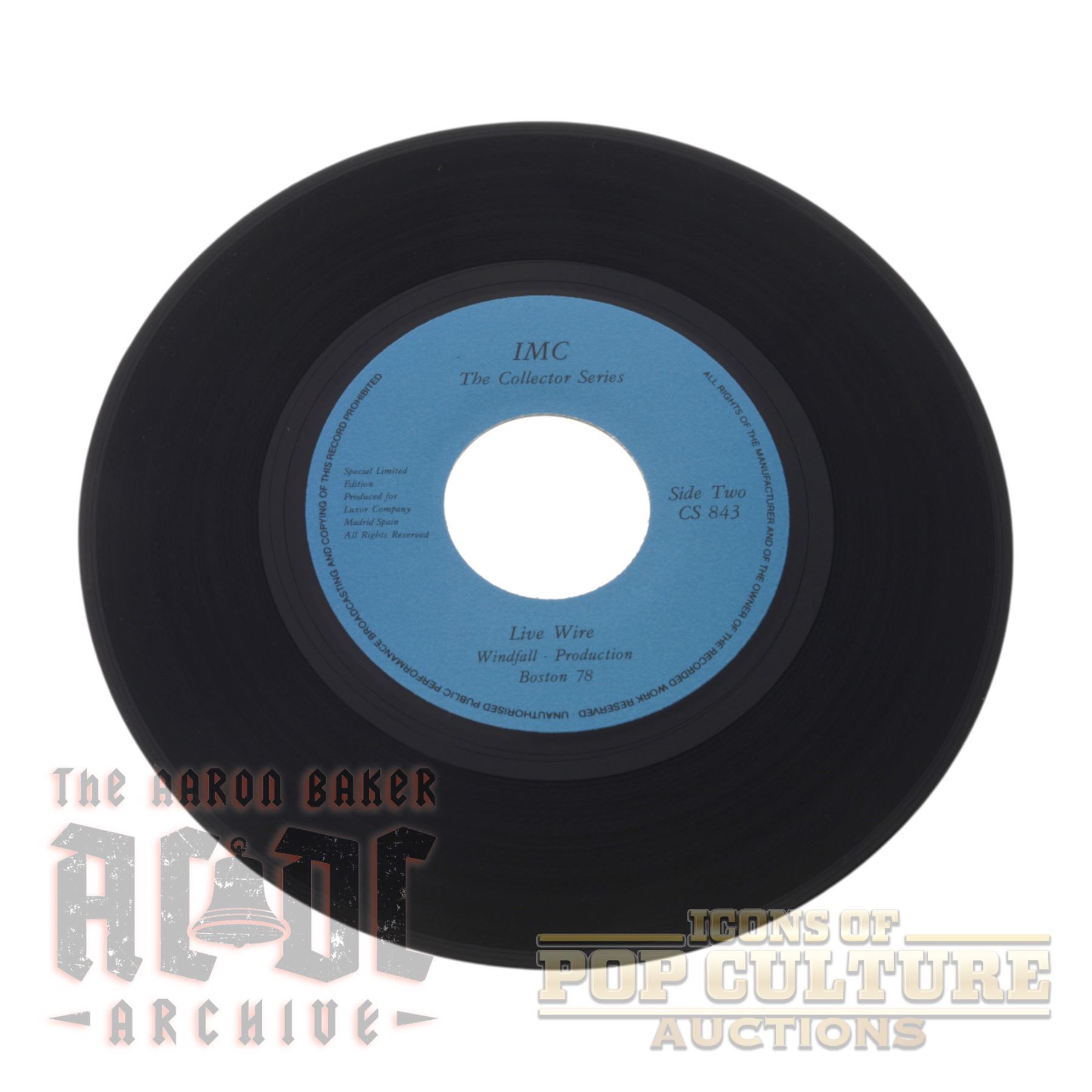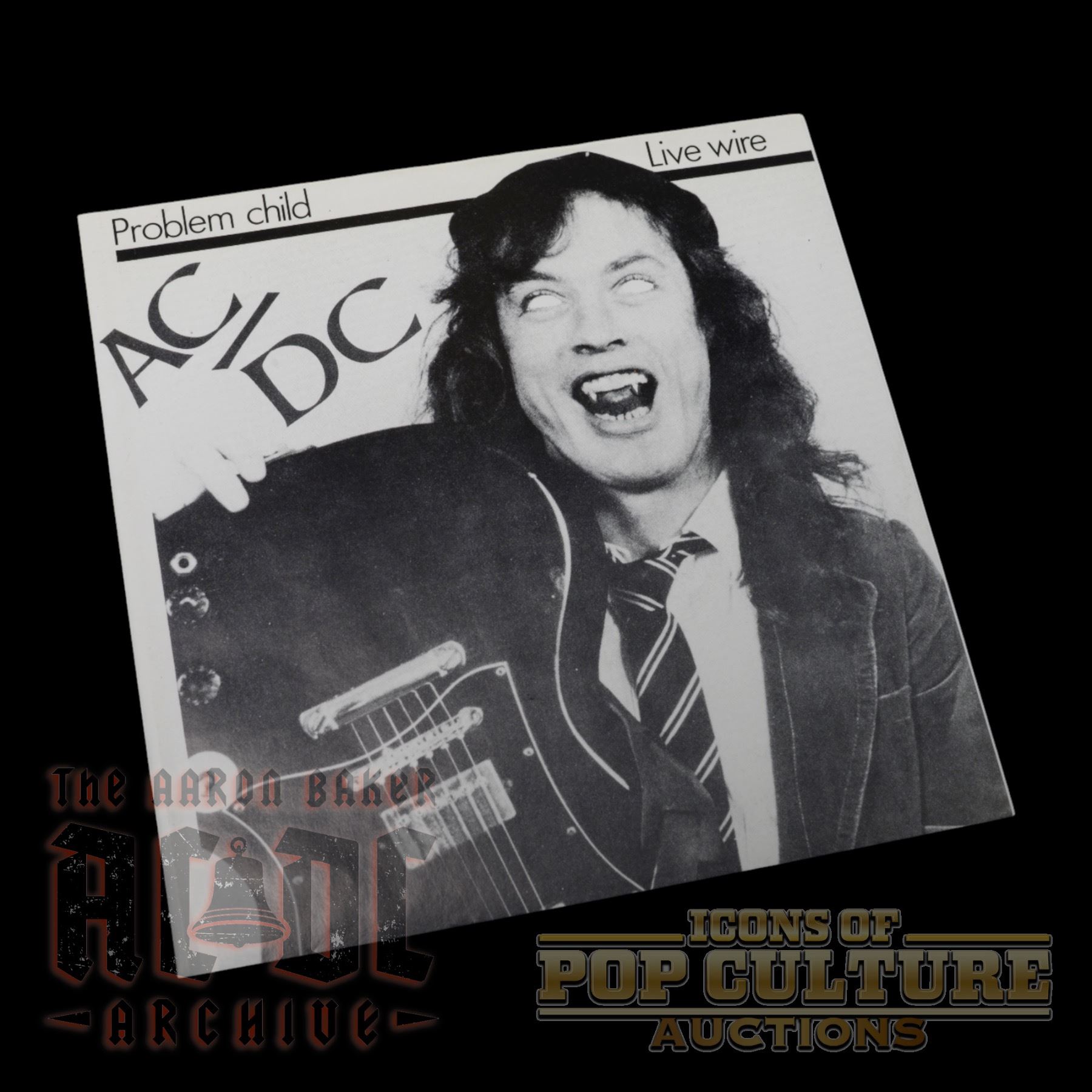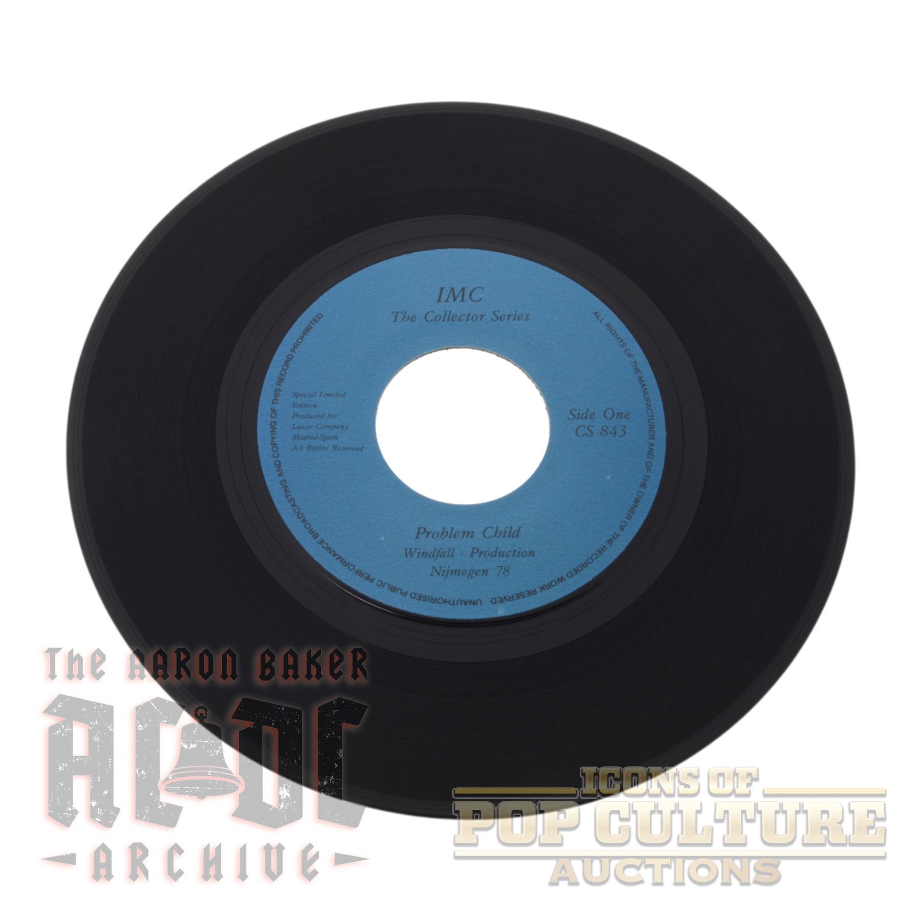 Presented here is an unofficial AC/DC 7" single released as part of the IMC "Collector Series," catalog number CS 843. This release features two live recordings: “Problem Child,” captured in Nijmegen in 1978, and “Live Wire,” recorded in Boston the same year. Issued by Windfall Production, this single was pressed for collectors rather than as an official Atlantic Records release. The picture sleeve showcases a striking black-and-white image of Angus Young in his signature schoolboy uniform. A unique addition to AC/DC collections, this single offers a glimpse into the band’s raw, high-voltage live performances from the Bon Scott era.