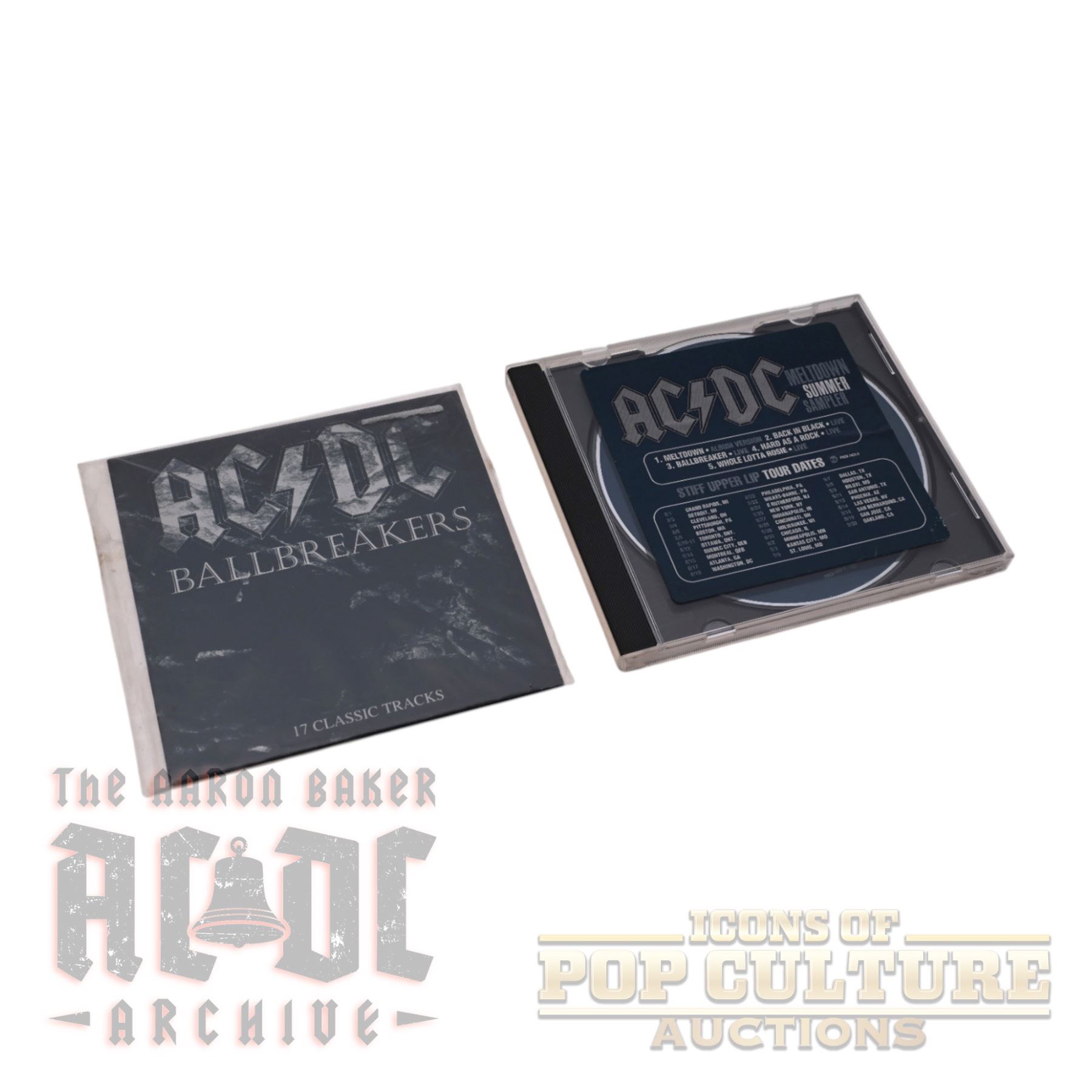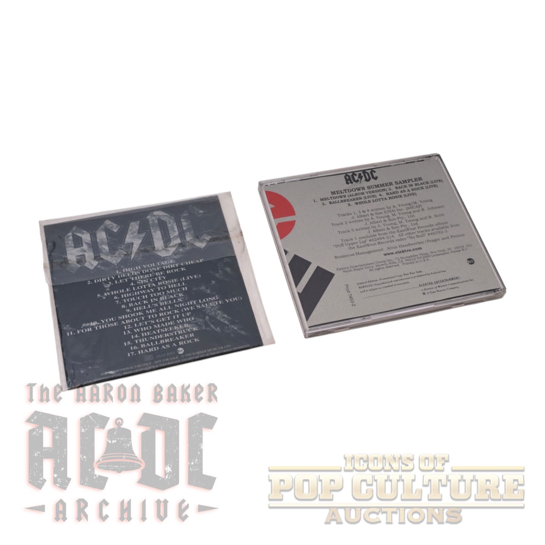 This lot contains two promotional-only AC/DC compact discs. The first is Ballbreakers, a 17-track compilation featuring classics such as High Voltage, Dirty Deeds Done Dirt Cheap, Let There Be Rock, Back in Black, and For Those About to Rock (We Salute You). The second is the Meltdown Summer Sampler, which includes tracks like Ballbreaker (Live) and Back in Black (Live), along with additional live cuts and promotional content tied to the Stiff Upper Lip tour. Both discs were issued for promotional purposes only and were not sold commercially, making them unique collectibles for fans and collectors of AC/DC memorabilia.