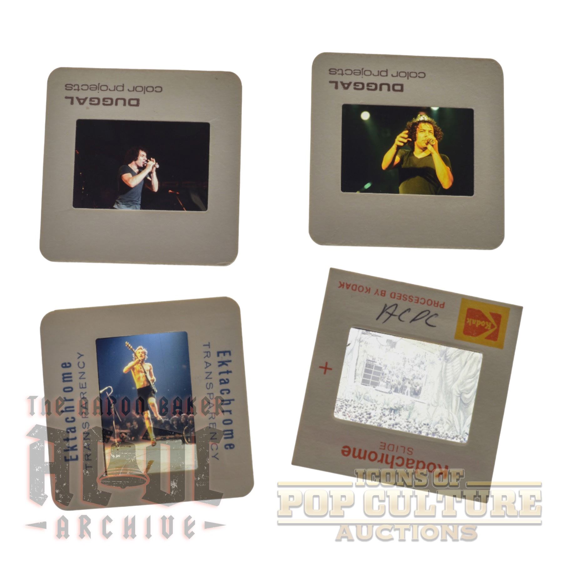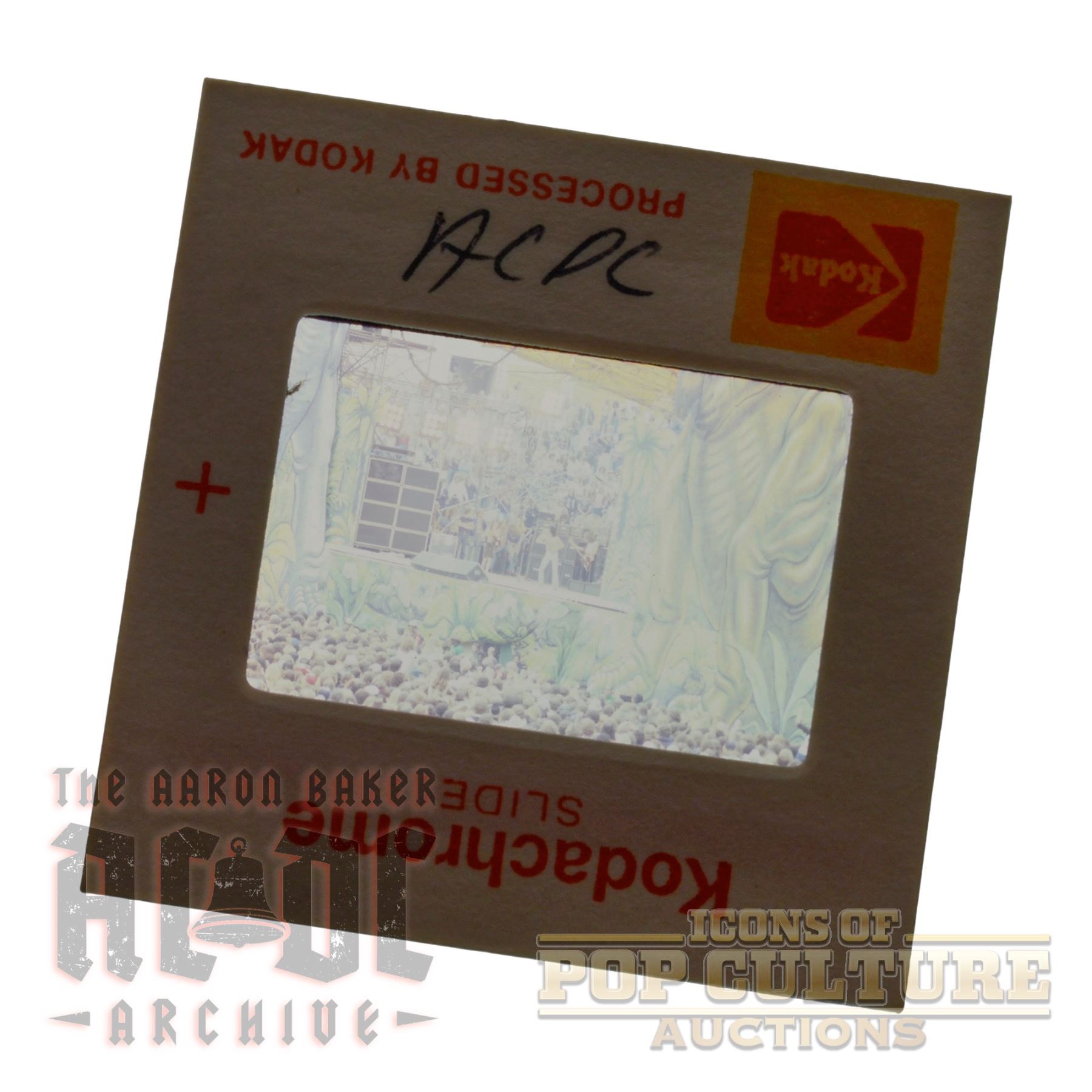 An exceptional set of four original 35mm color slides capturing AC/DC’s blistering stage presence during two pivotal eras. Two slides feature Brian Johnson in his early years with the band, commanding the crowd under brilliant stage lights. Another showcases Angus Young in mid-air, caught at the peak of his signature leap, perfectly timing his landing to close out a song. The highlight is a rare and historic image from AC/DC’s 1979 Oakland Coliseum concert, a vibrant outdoor shot featuring Bon Scott during his final tour. A powerful visual time capsule, this set offers an up-close and authentic look at the energy, charisma, and rock ‘n’ roll legacy of AC/DC.