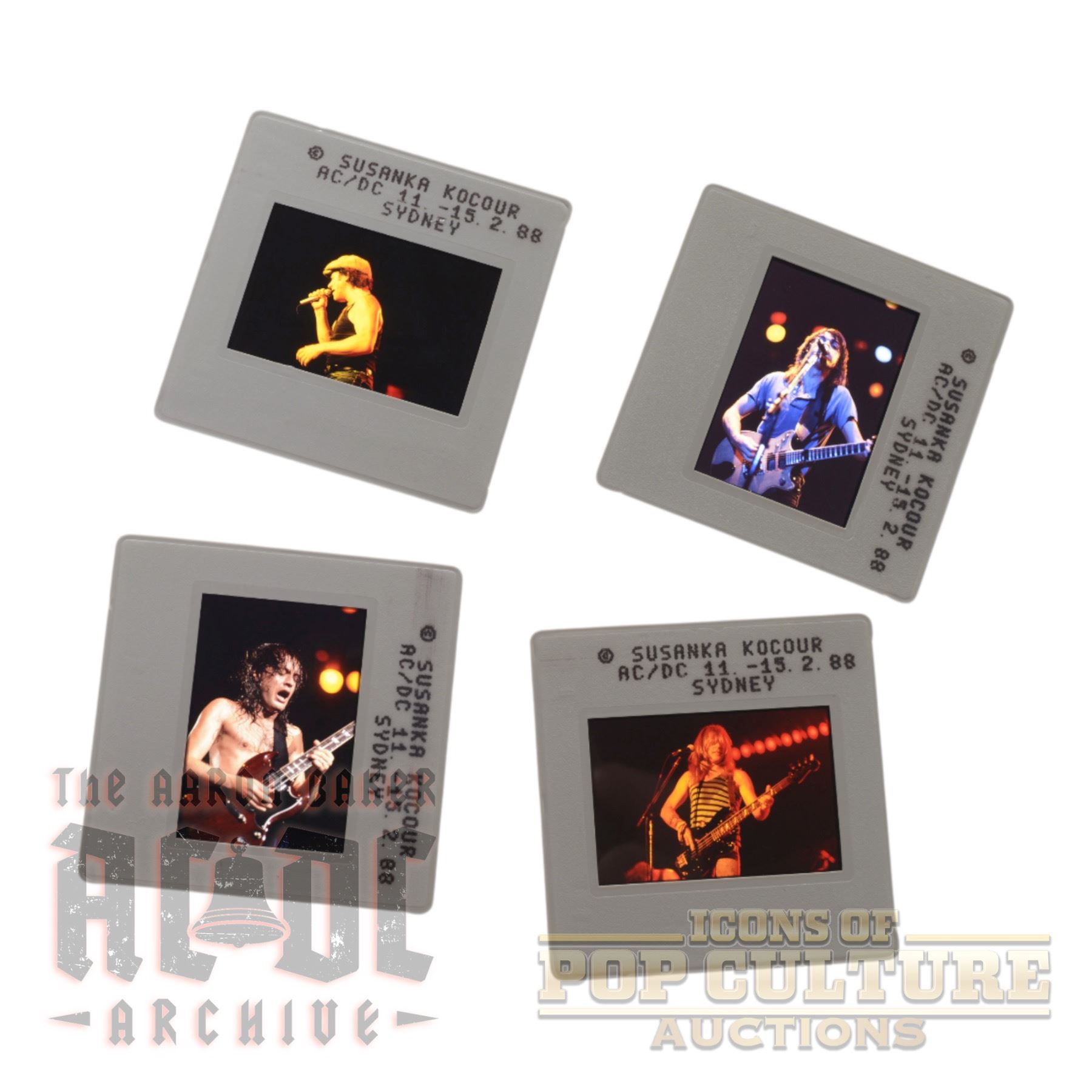 A set of four original color slides featuring rare images from AC/DC's Sydney tour, February 15, 1988. Photographed by Susanka Kocour, the slides capture various moments of the band on stage.