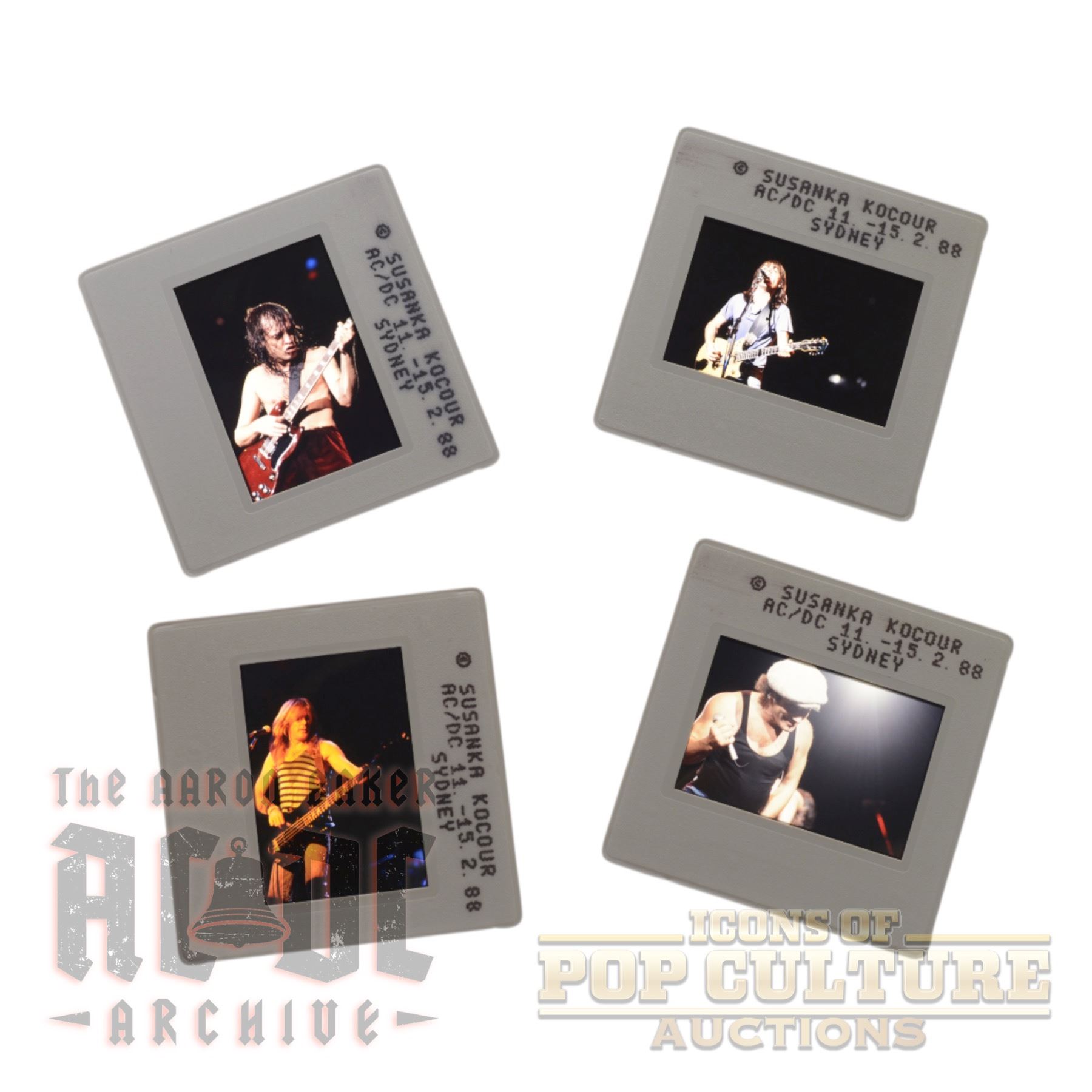 A set of four original color slides featuring rare images from AC/DC's Sydney tour, February 15, 1988. Photographed by Susanka Kocour, the slides capture various moments of the band on stage.