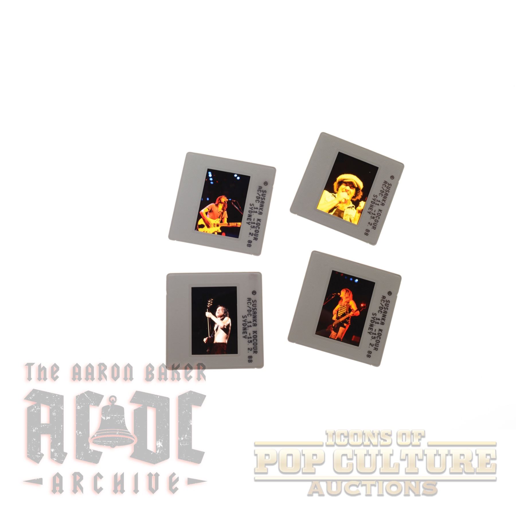 A set of four original color slides featuring rare images from AC/DC's Sydney tour, February 15, 1988. Photographed by Susanka Kocour, the slides capture various moments of the band on stage.