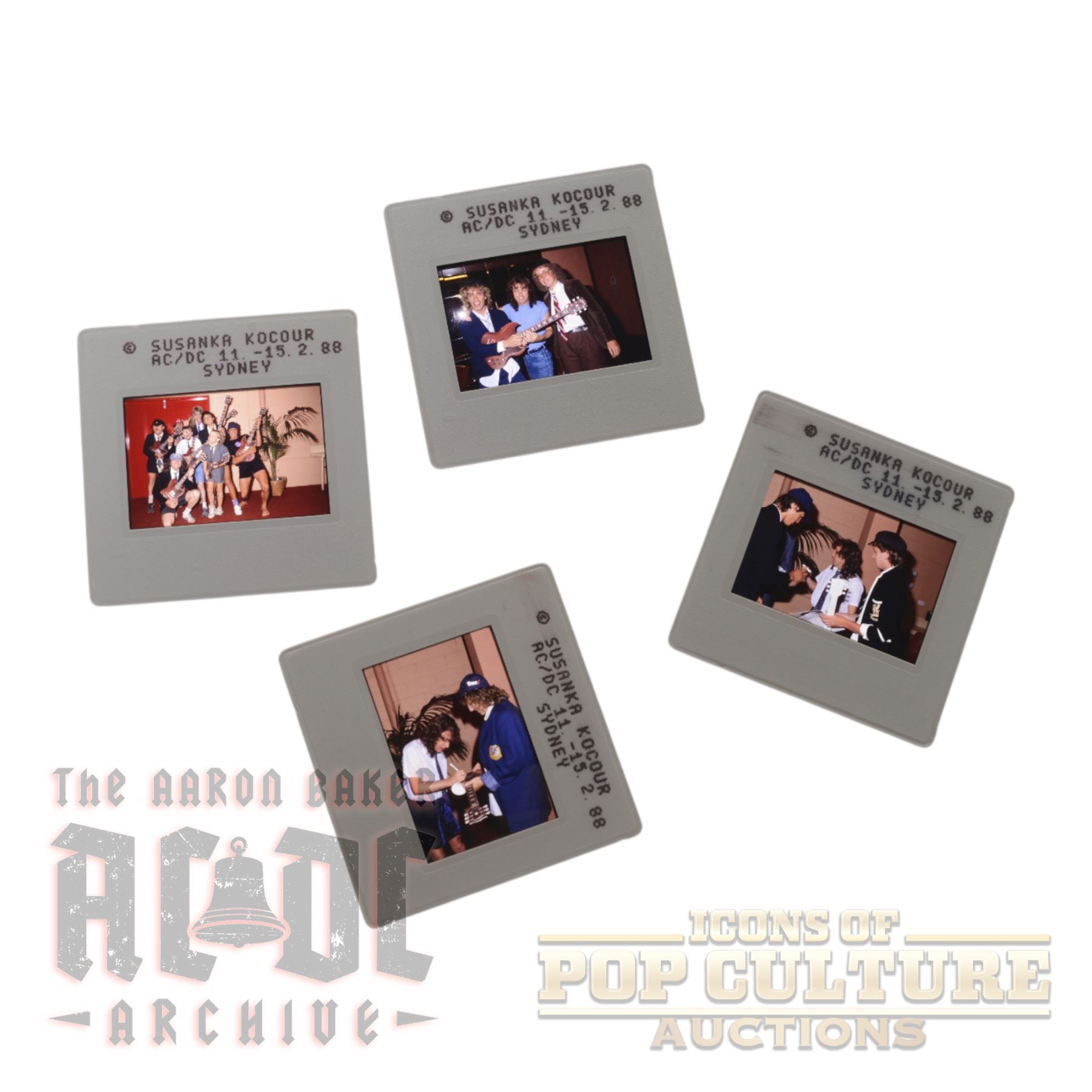 A set of four original color slides featuring rare images from AC/DC's Sydney tour, February 15, 1988. Photographed by Susanka Kocour, the slides capture various moments backstage with the band.