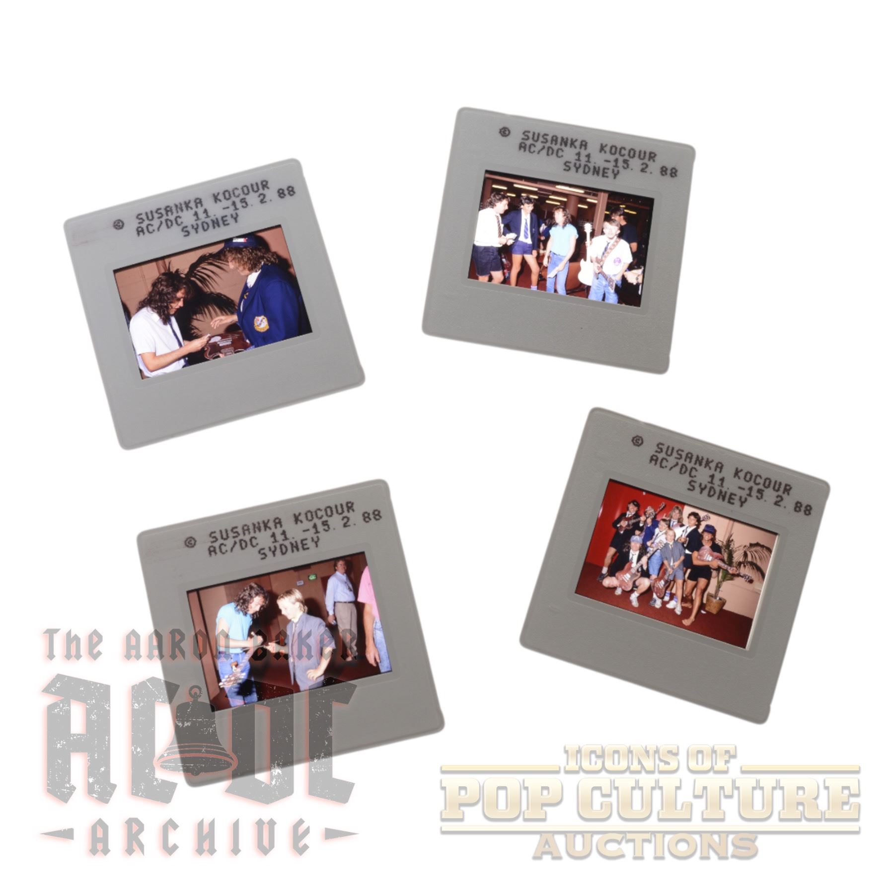 A set of four original color slides featuring rare images from AC/DC's Sydney tour, February 15, 1988. Photographed by Susanka Kocour, the slides capture various moments backstage with the band.