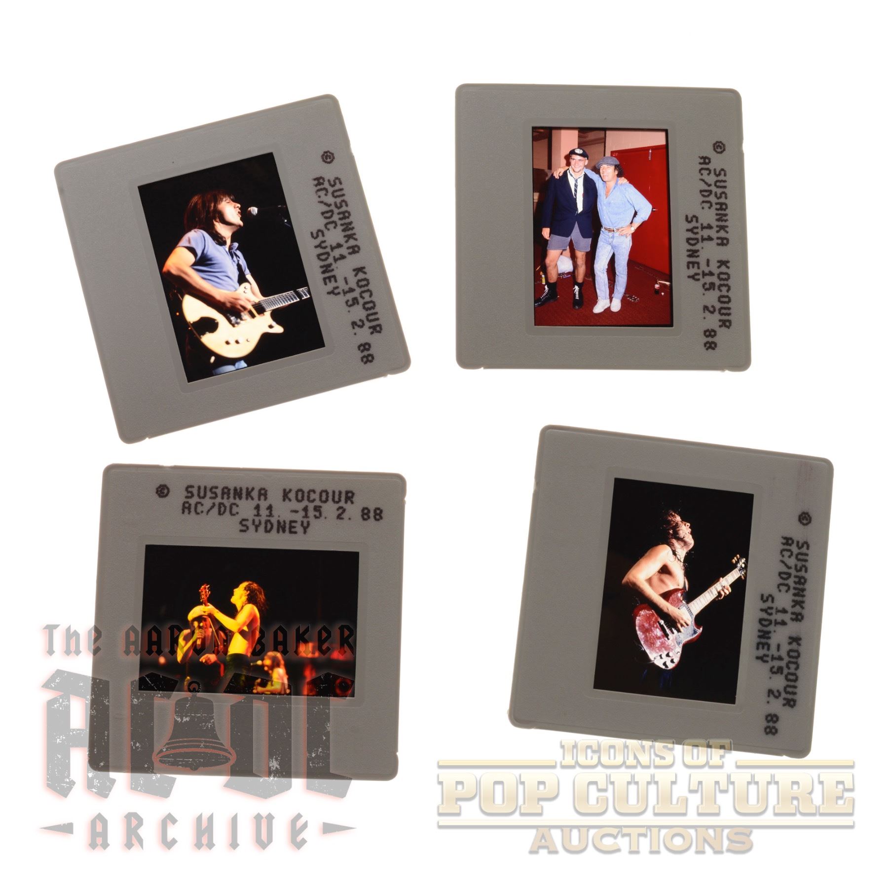 A set of four original color slides featuring rare images from AC/DC's Sydney tour, February 15, 1988. Photographed by Susanka Kocour, the slides capture various moments from the tour, including the live concert and backstage with the band.
