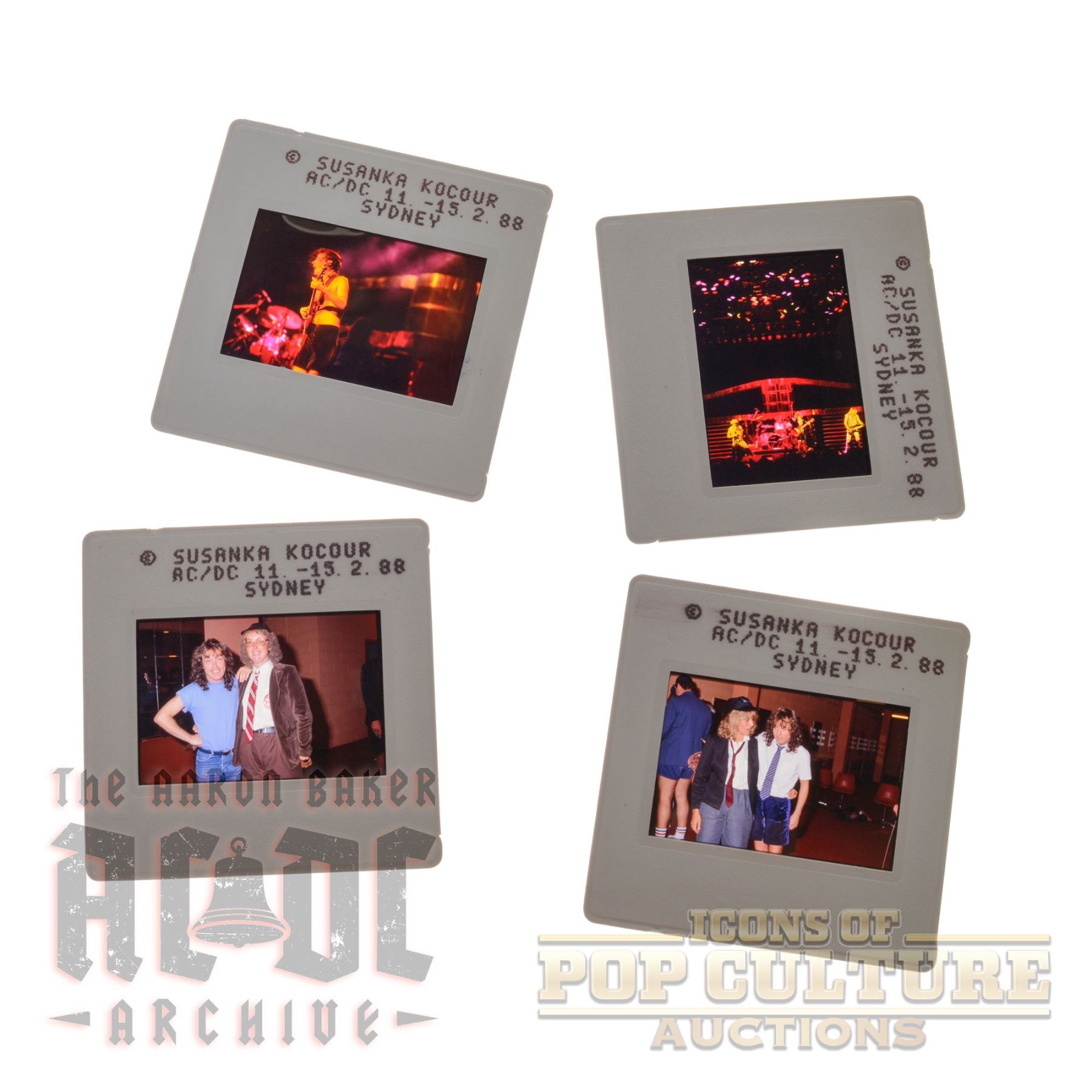 A set of four original color slides featuring rare images from AC/DC's Sydney tour, February 15, 1988. Photographed by Susanka Kocour, the slides capture various moments from the tour, including the live concert and backstage with the band.