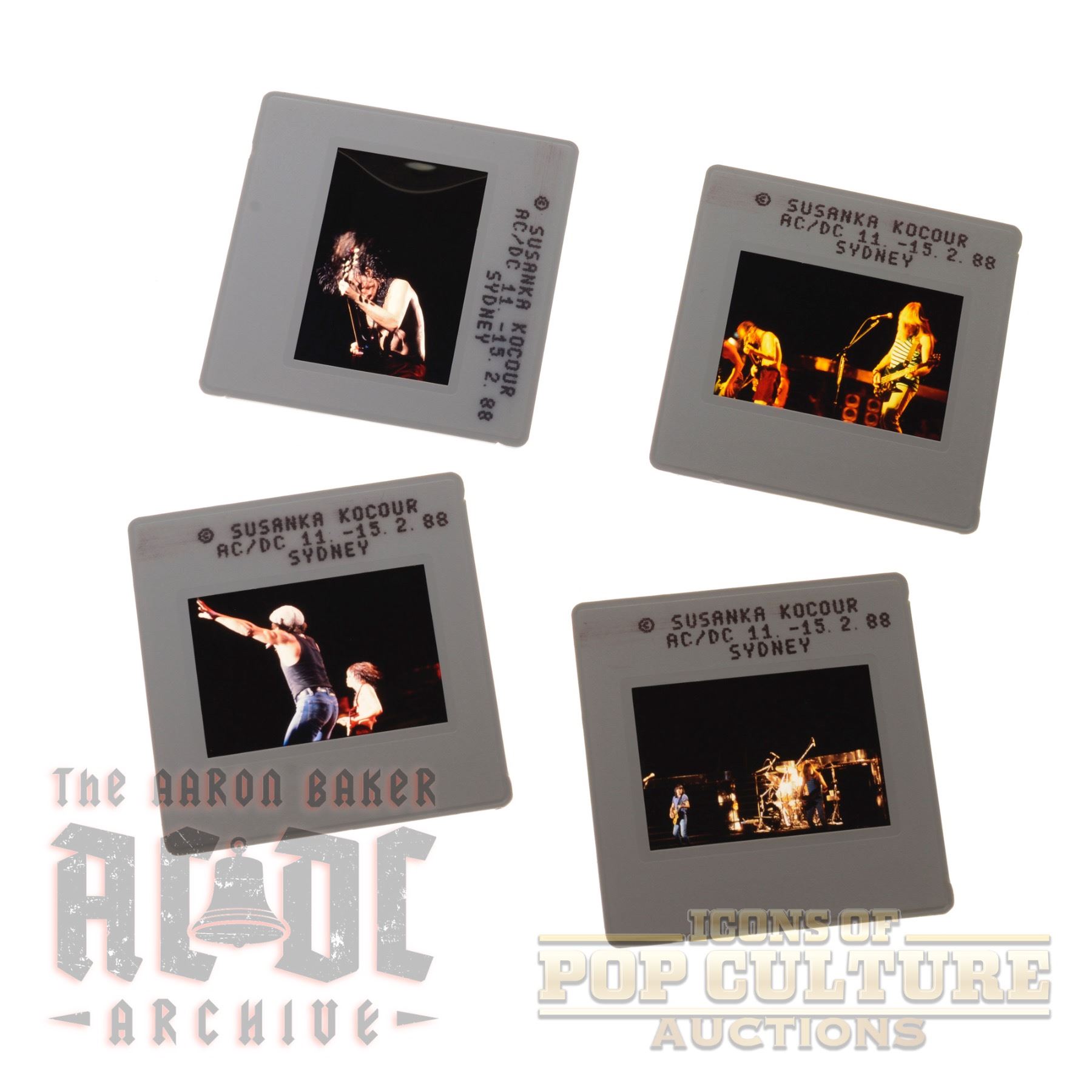 A set of four original color slides featuring rare images from AC/DC's Sydney tour, February 15, 1988. Photographed by Susanka Kocour, the slides capture various moments of the band on stage.