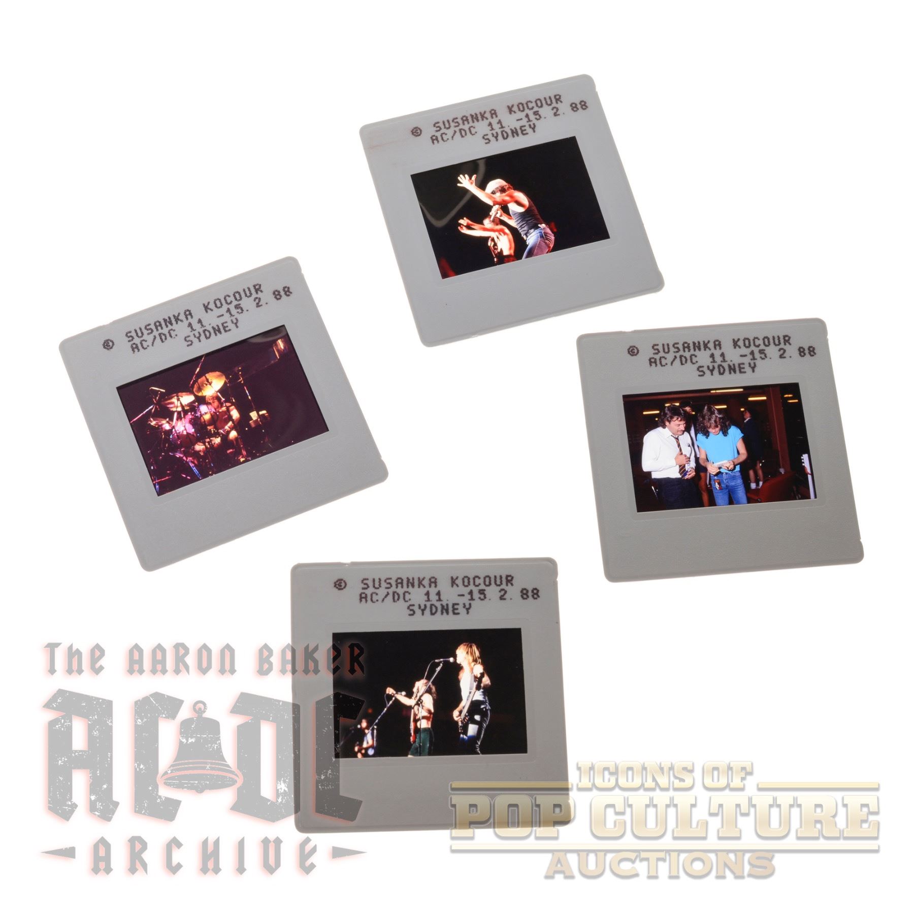 A set of four original color slides featuring rare images from AC/DC's Sydney tour, February 15, 1988. Photographed by Susanka Kocour, the slides capture various moments from the tour, including the live concert and backstage with the band.
