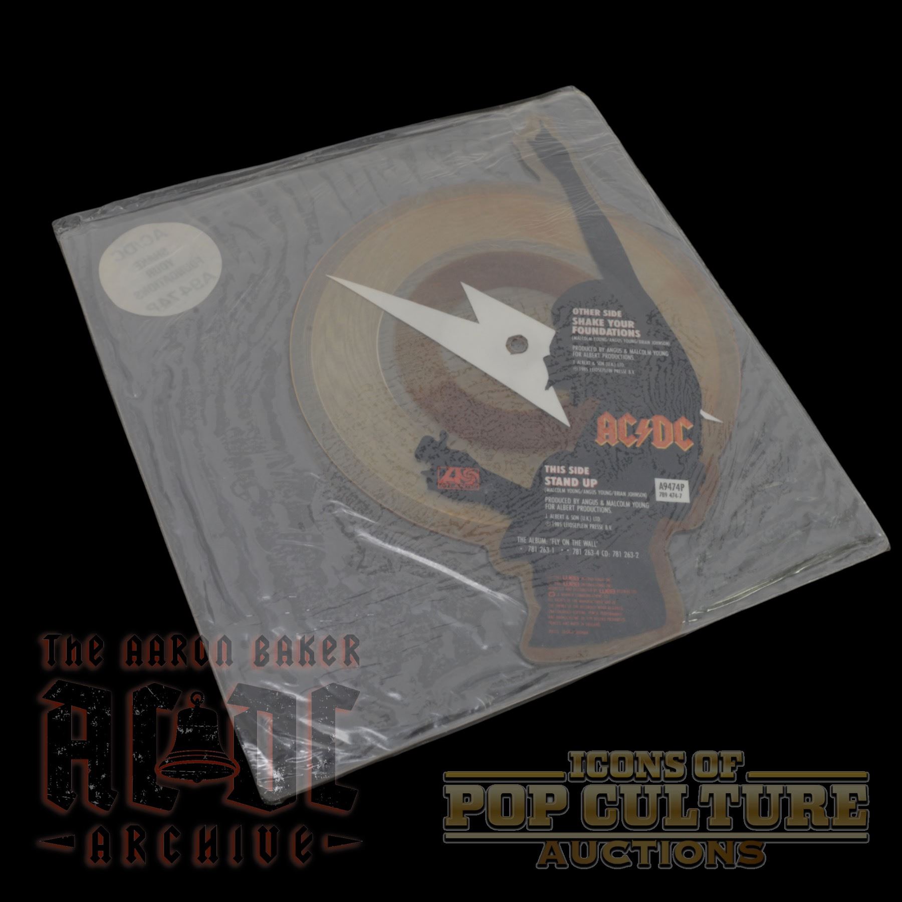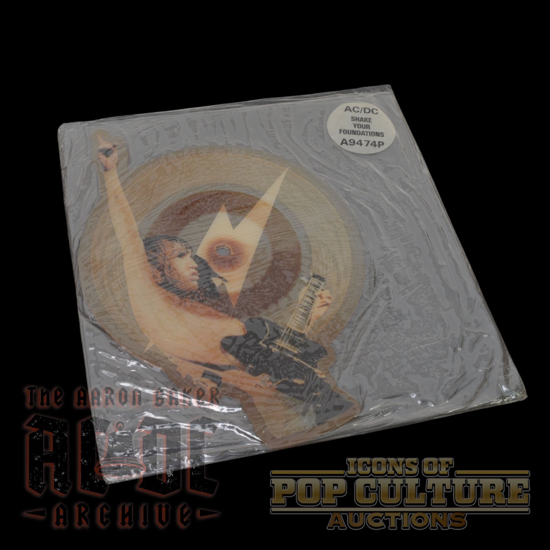 Presented here is a stunning and rare UK-picture disc single of AC/DC’s Shake Your Foundations, backed with Stand Up, issued in 1985 by Atlantic/Albert Productions under catalog number A9474P. This collectible release was part of a special limited edition series designed for maximum visual impact, pressed in the shape of Angus Young’s silhouette holding his guitar, with a bold lightning bolt cutting through the center.